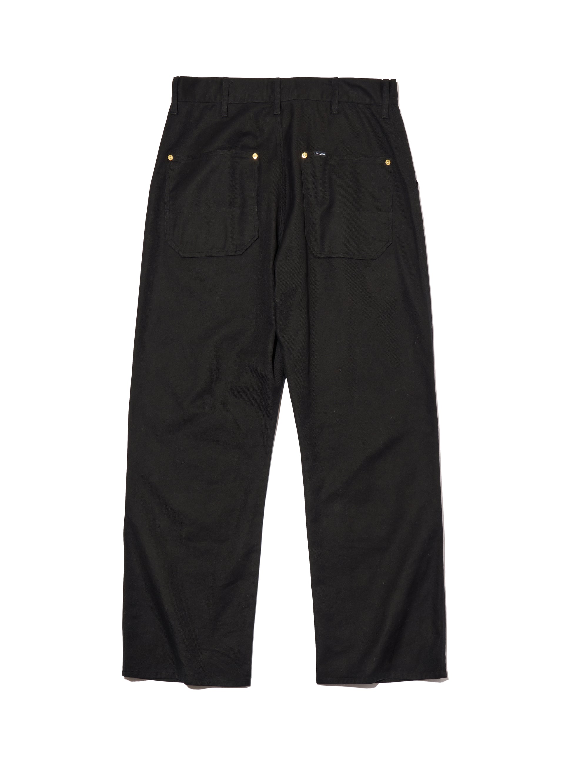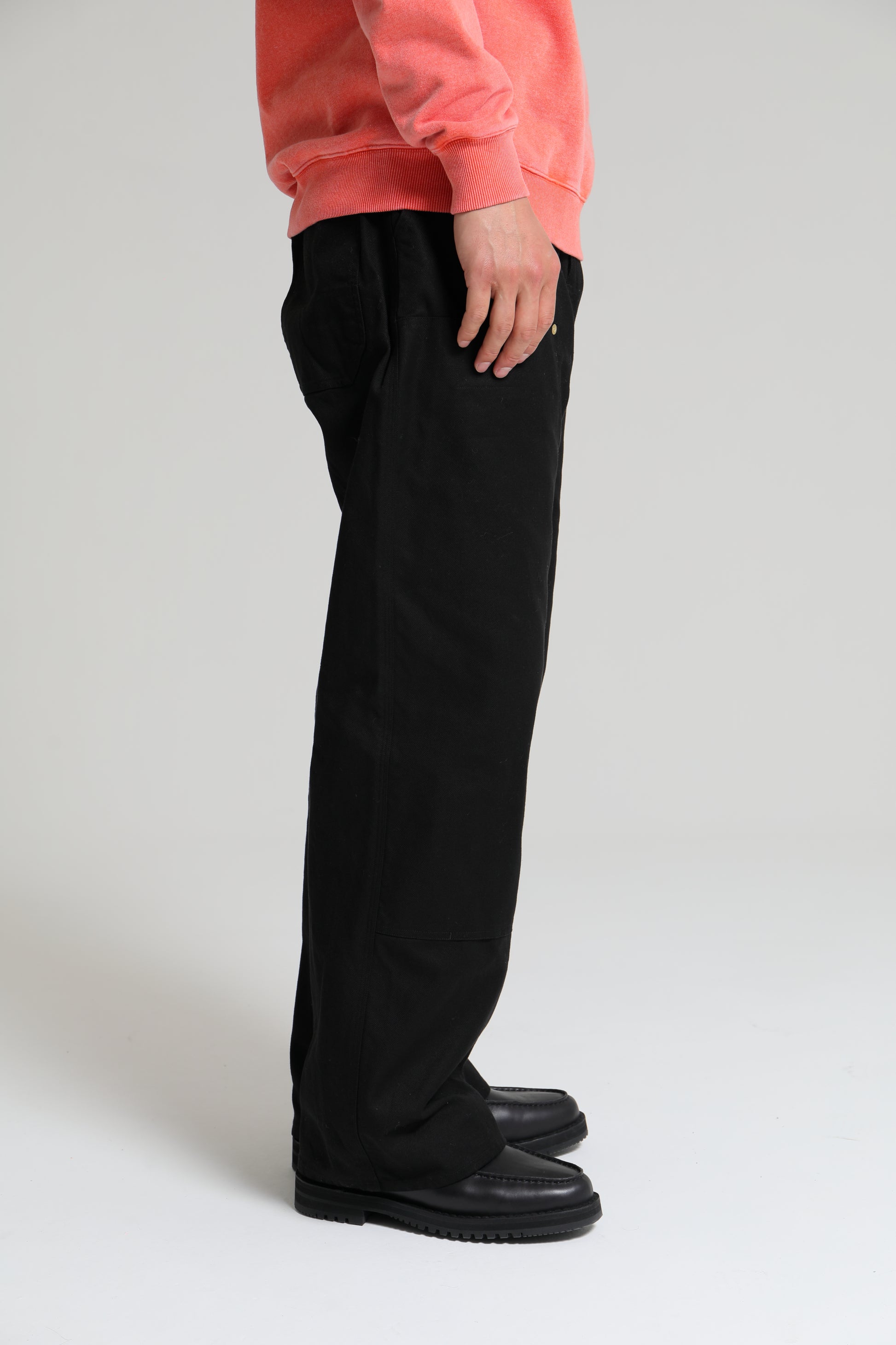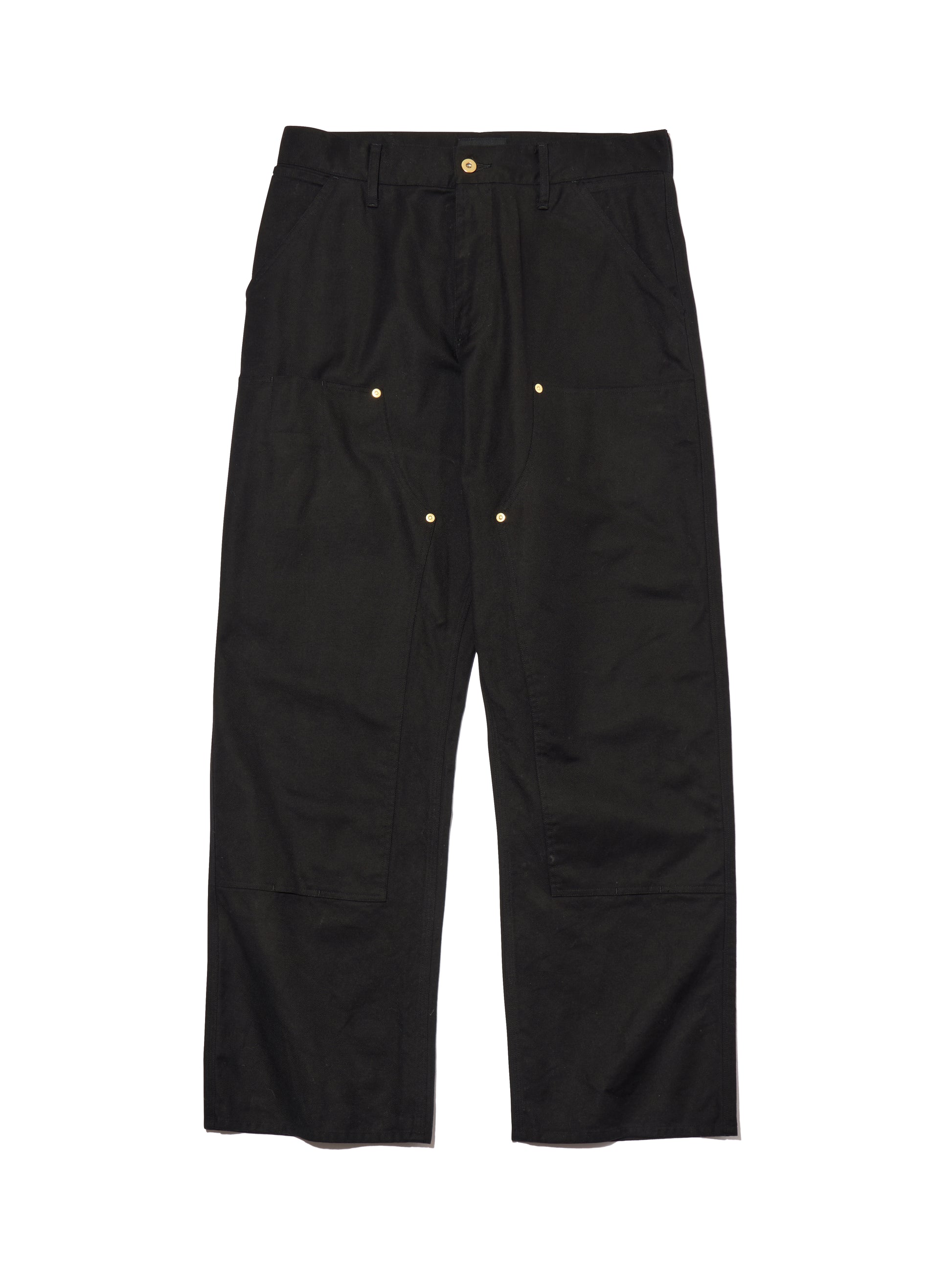 高密度に打ち込んだフレンチコットン生地を使用したダブルニー仕様のワークパンツ。フロントニーパッチ縁、背面ポケット縁にリベットを打ち込んだデザイン。両脇にスラッシュポケット、左ポケット上部にコインポケット、背面左右にパッチポケットを配置。ウエスト・腿回りにゆとりのあるシルエット。