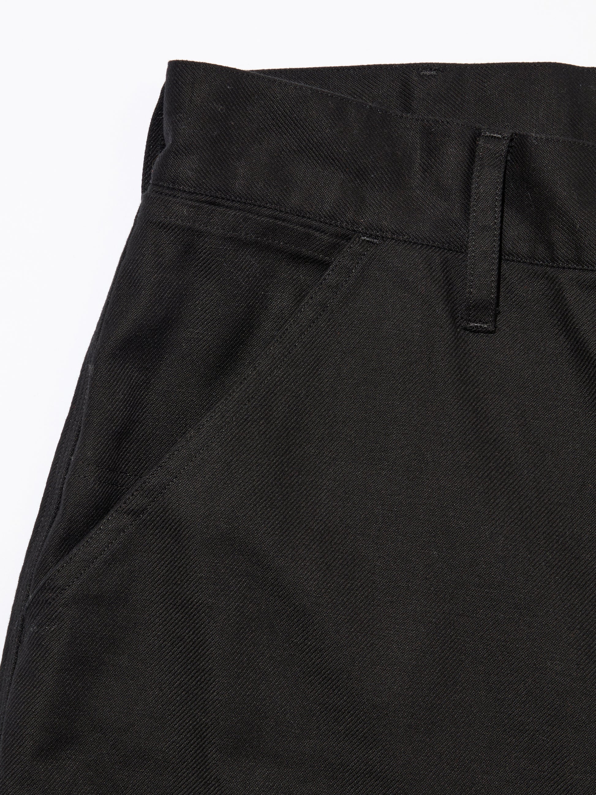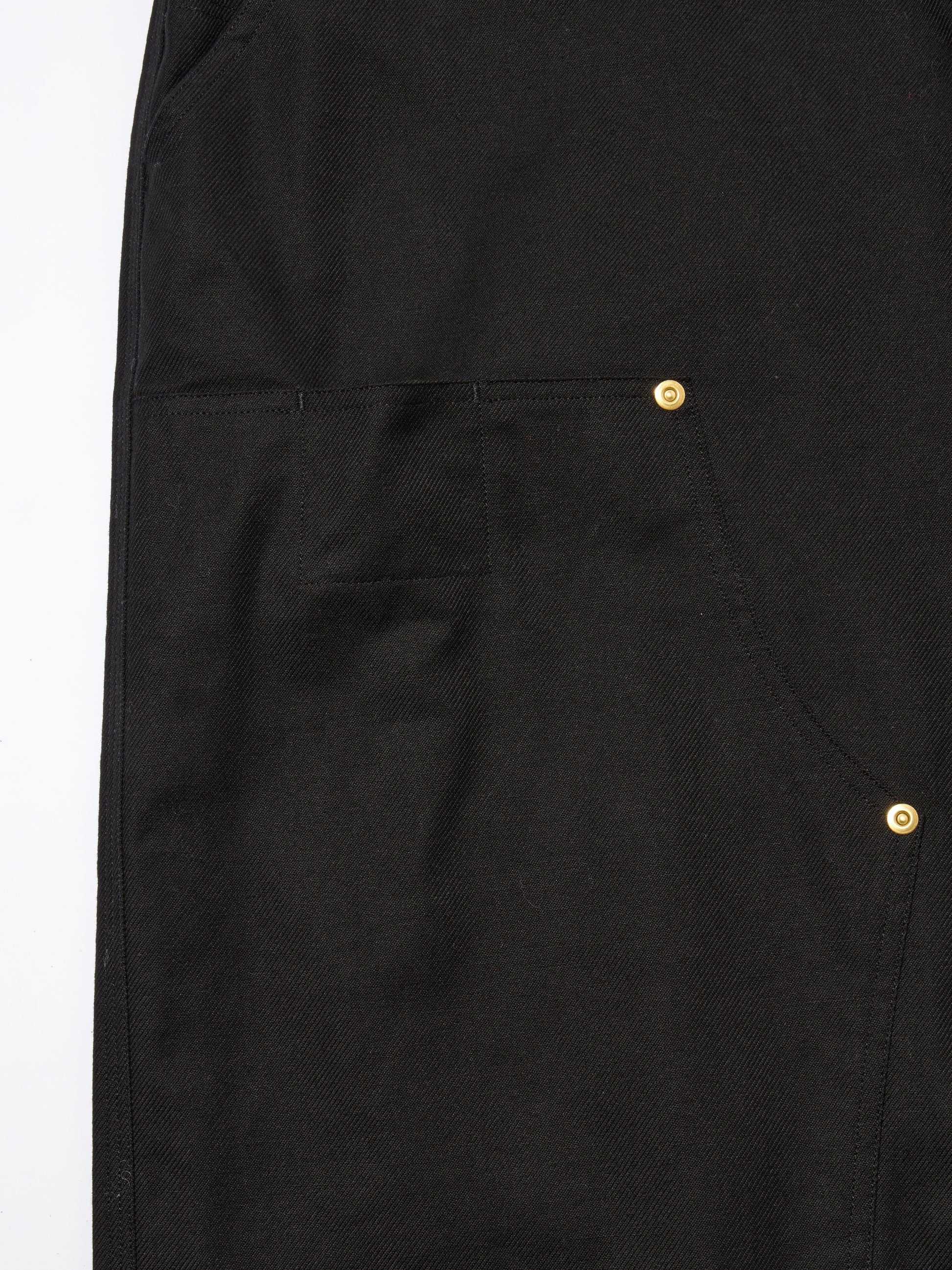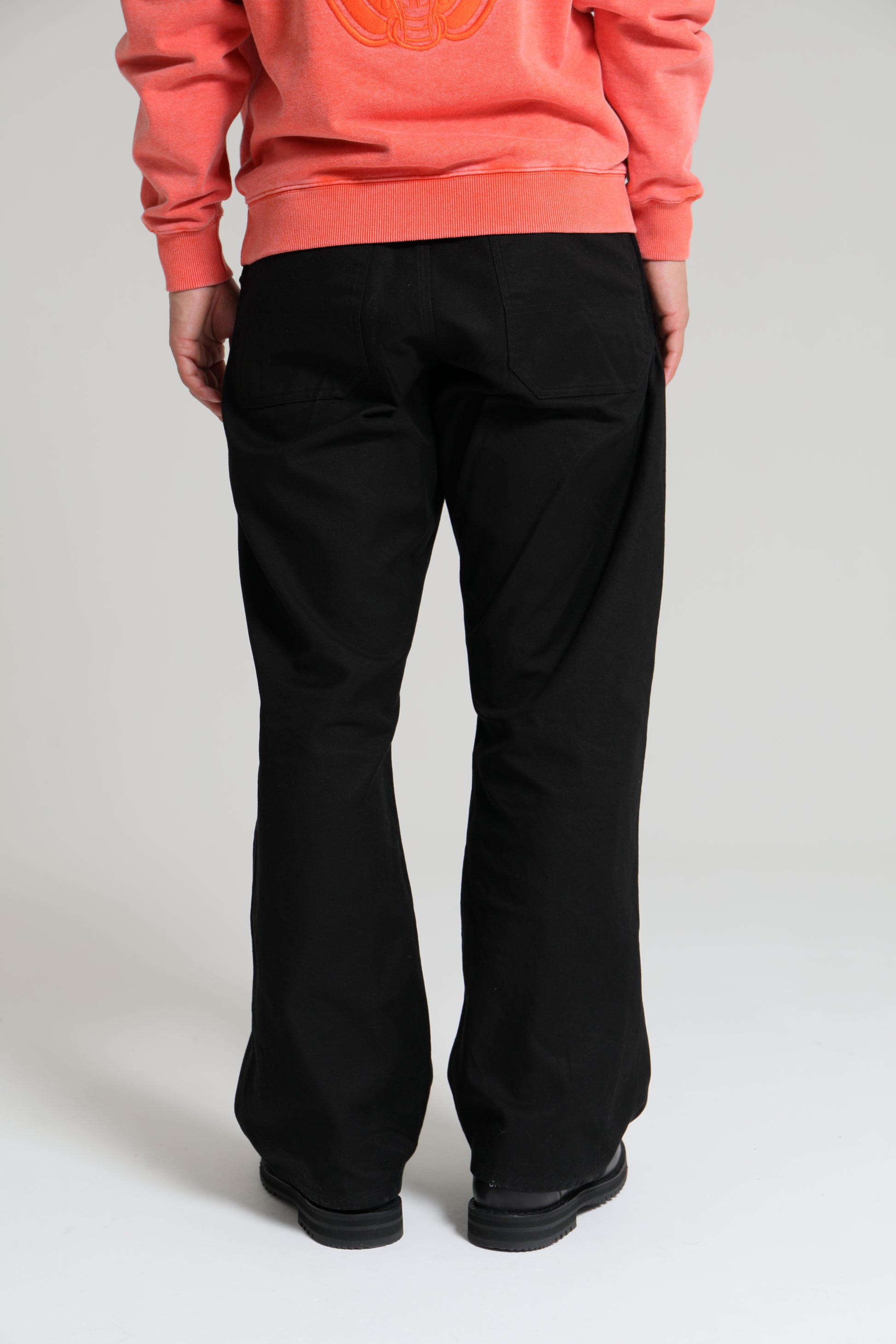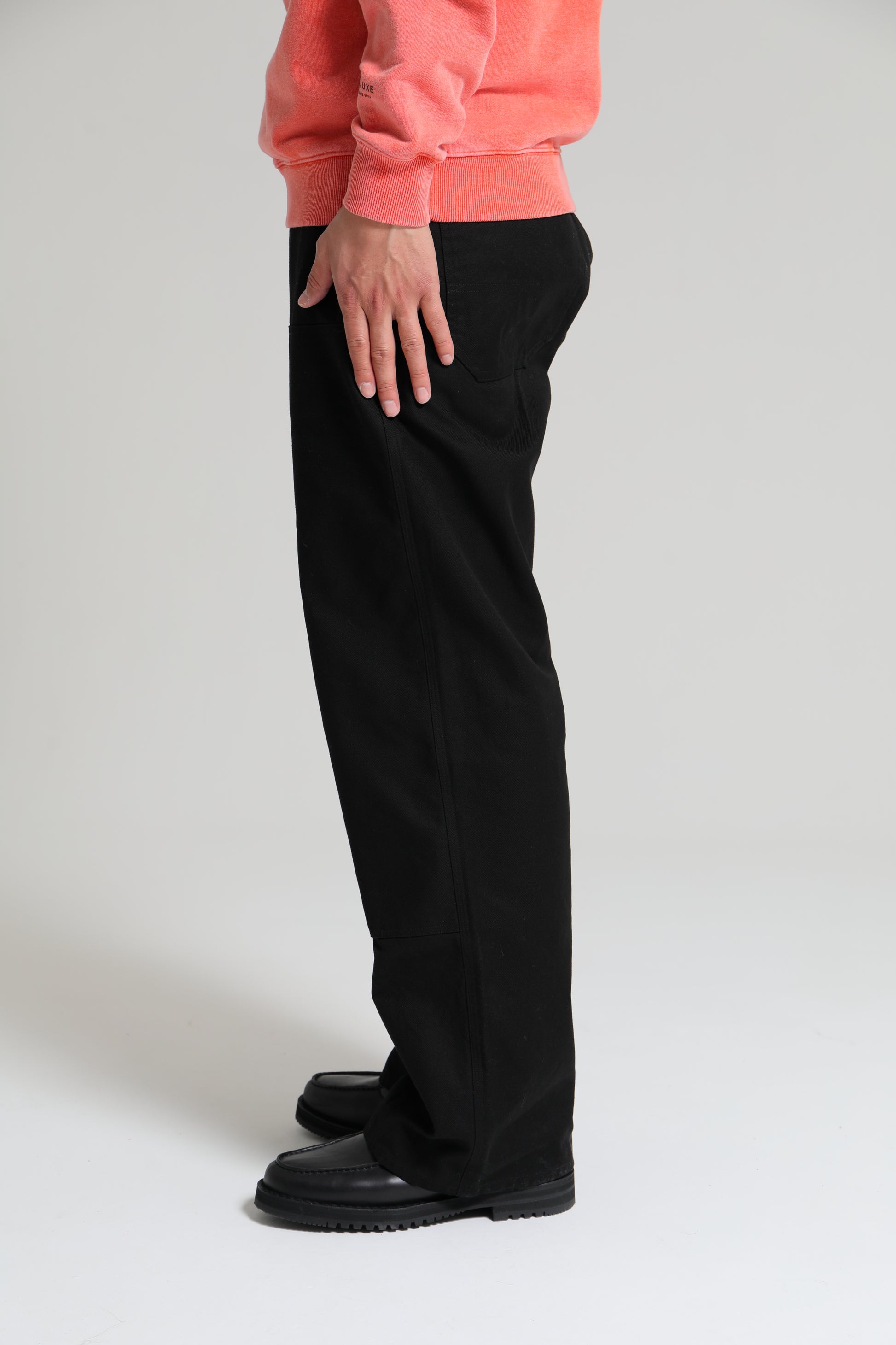 高密度に打ち込んだフレンチコットン生地を使用したダブルニー仕様のワークパンツ。フロントニーパッチ縁、背面ポケット縁にリベットを打ち込んだデザイン。両脇にスラッシュポケット、左ポケット上部にコインポケット、背面左右にパッチポケットを配置。ウエスト・腿回りにゆとりのあるシルエット。