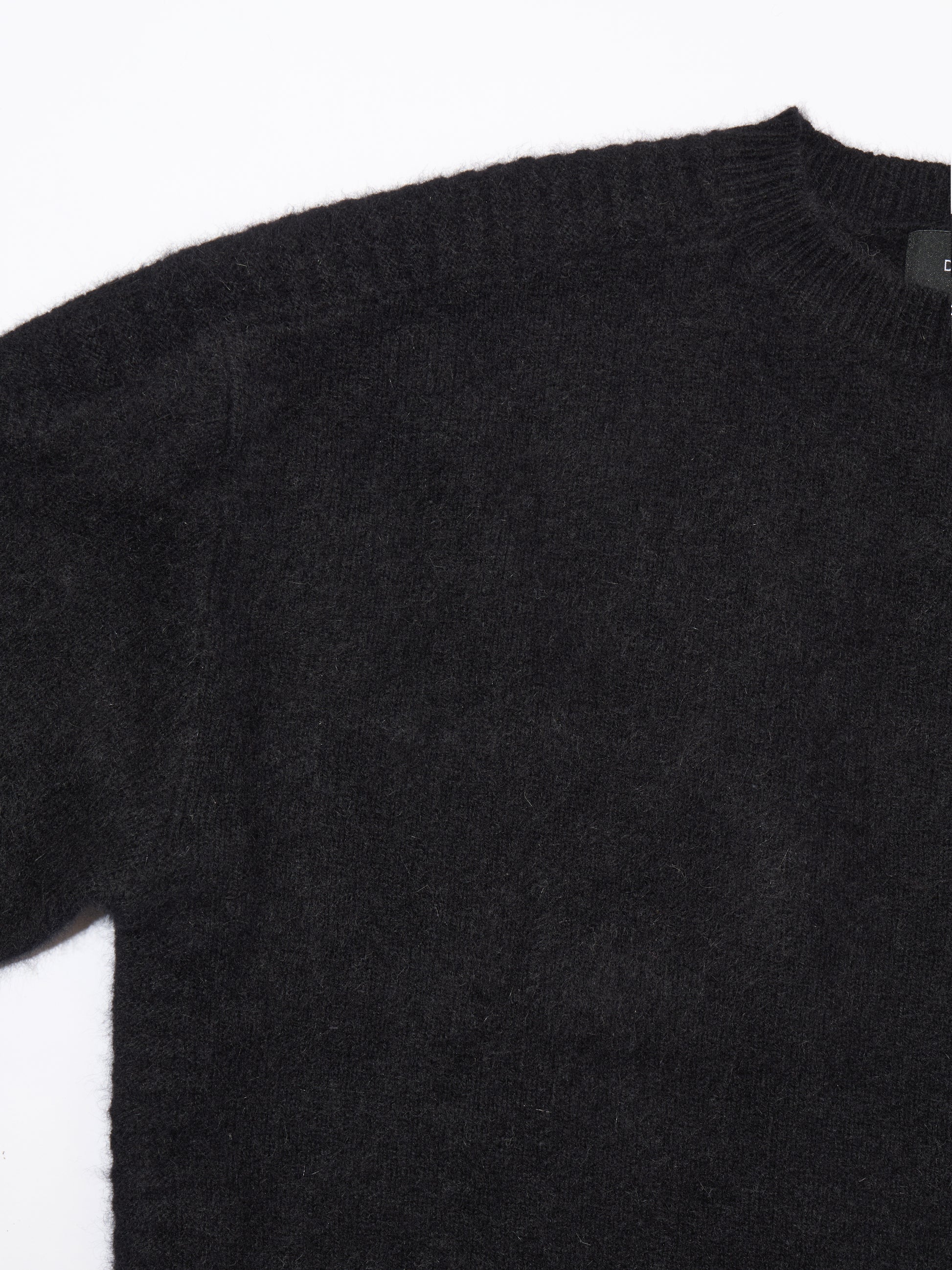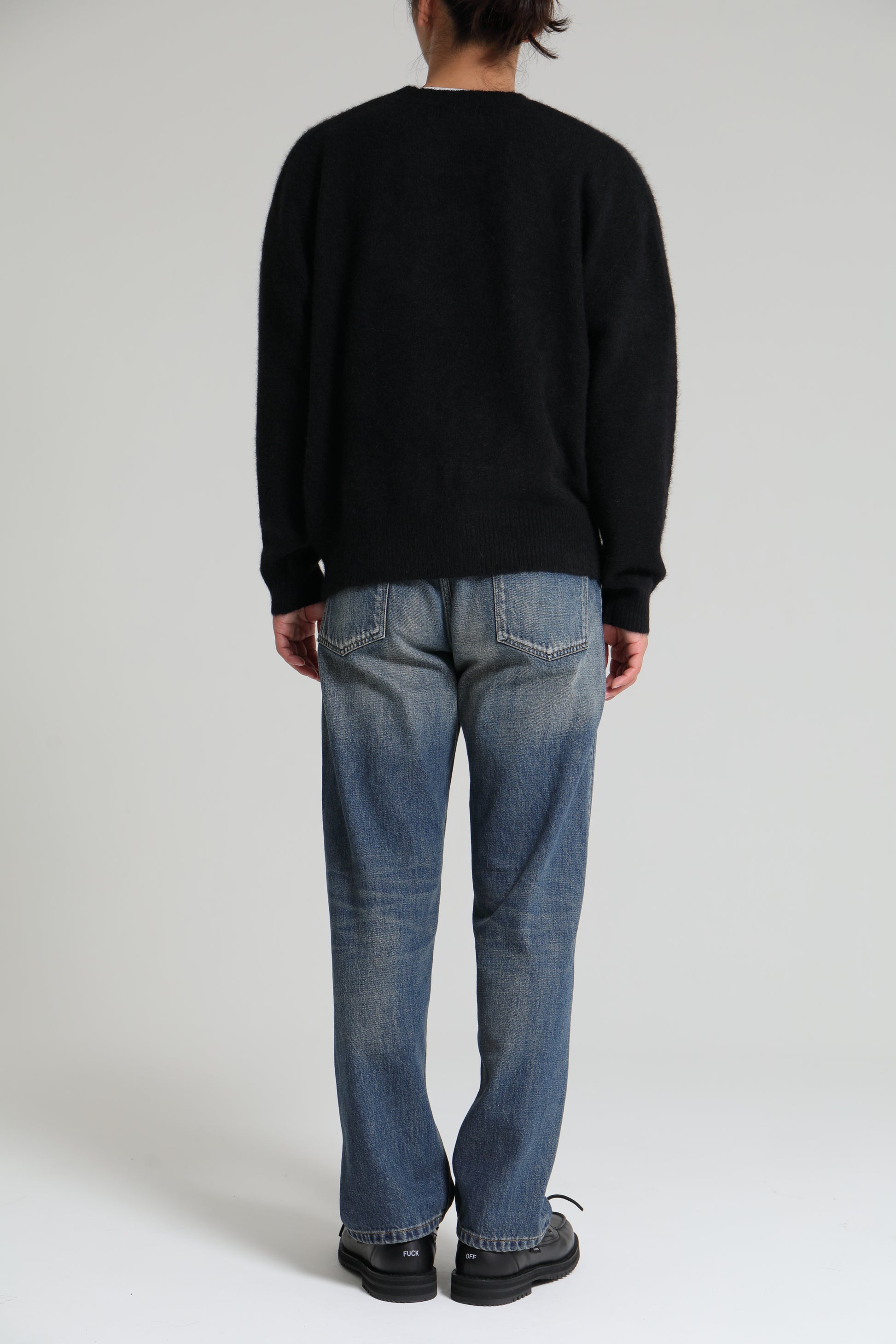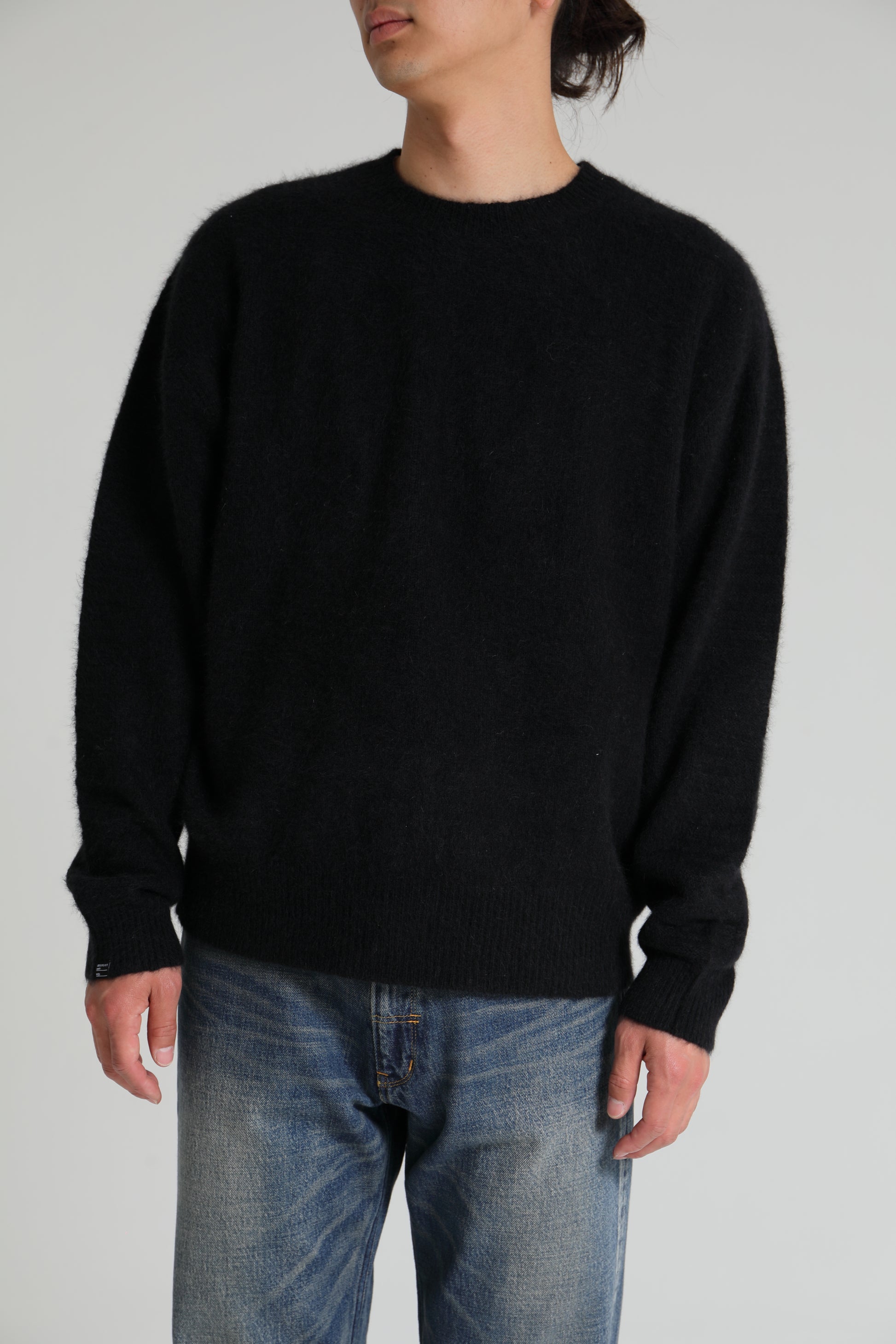 フォックス/ウール/ナイロンの3種混紡生地を使用したクルーネックニット。滑らかで肌あたりの柔らかな質感が特徴。アーム側面、身頃側面をボーダー柄の同生地で切り替えた手の込んだ意匠。身幅にややゆとりのあるシルエット。