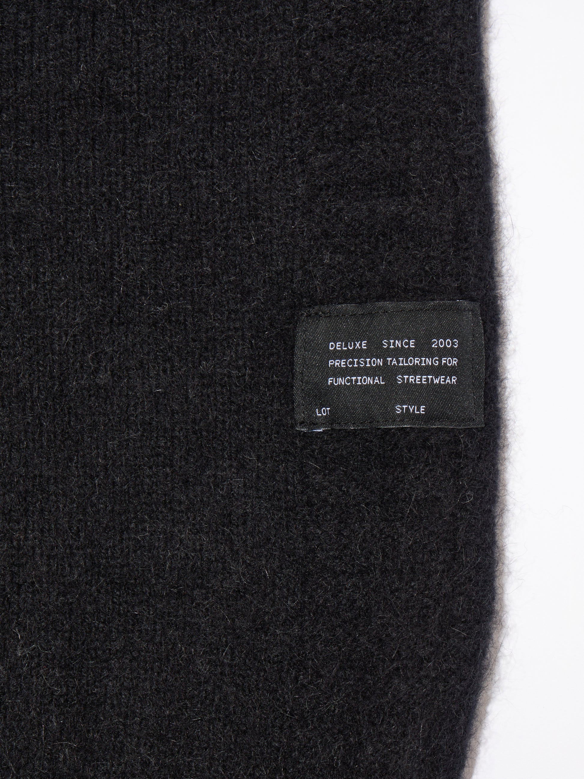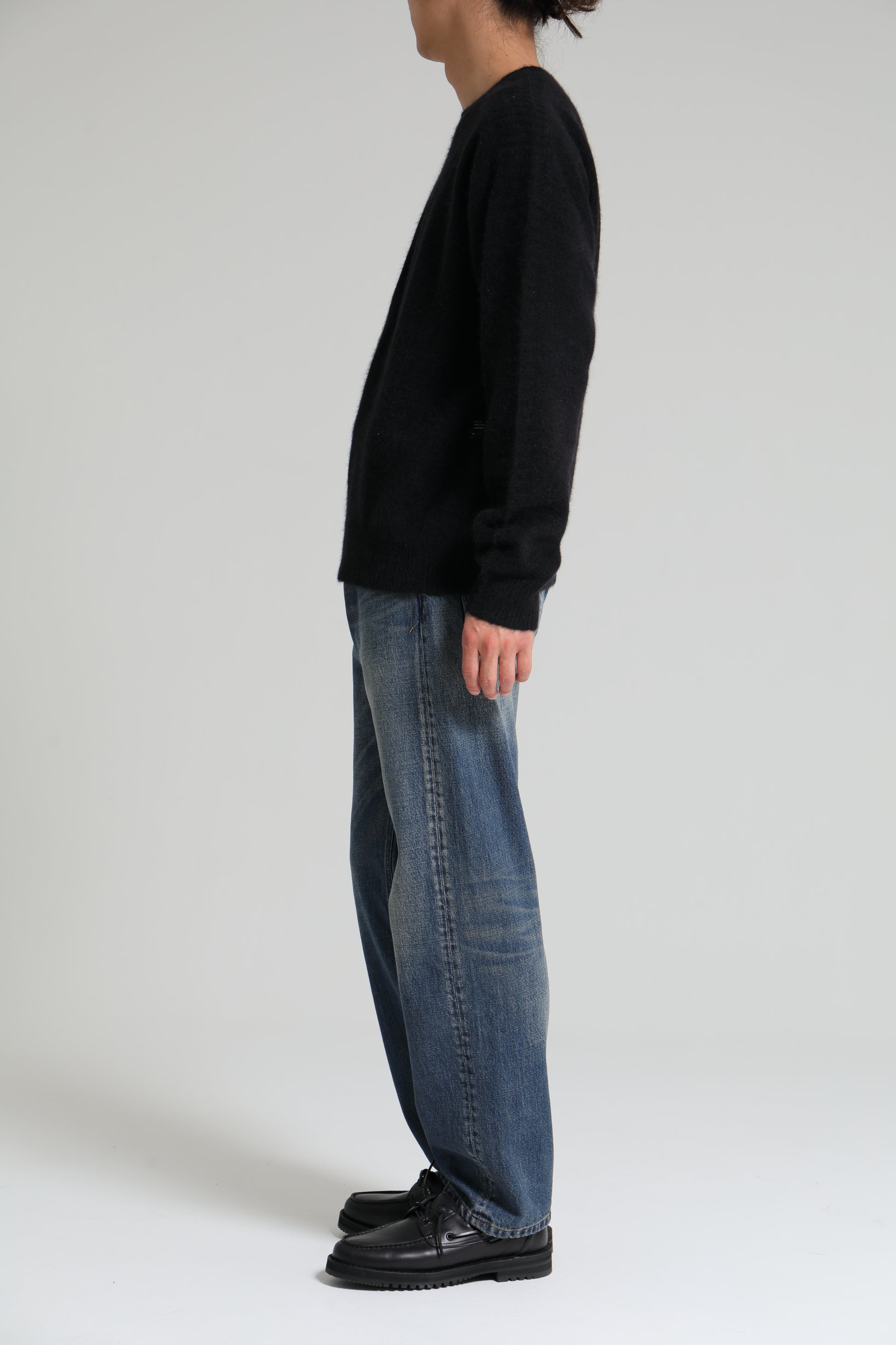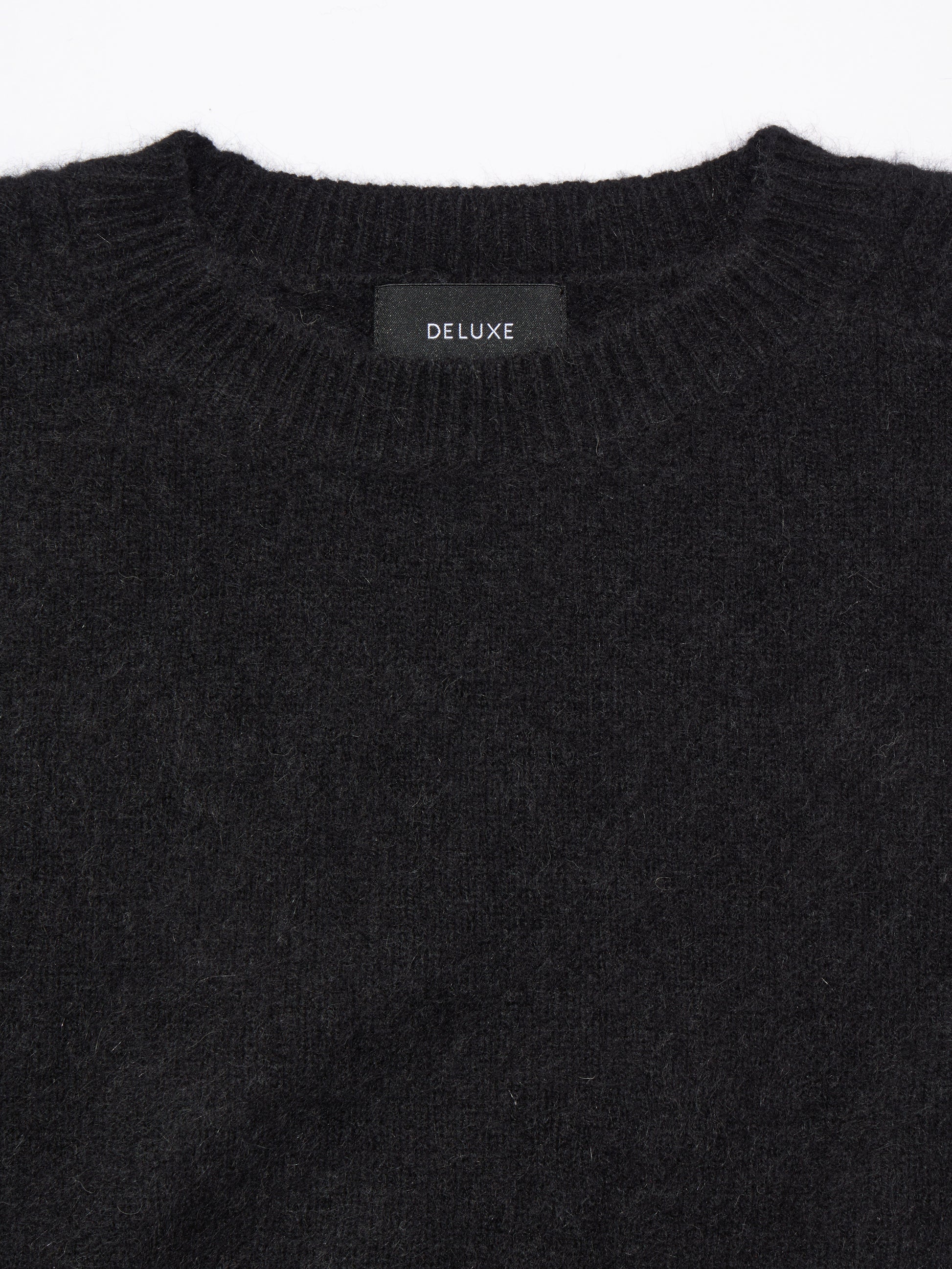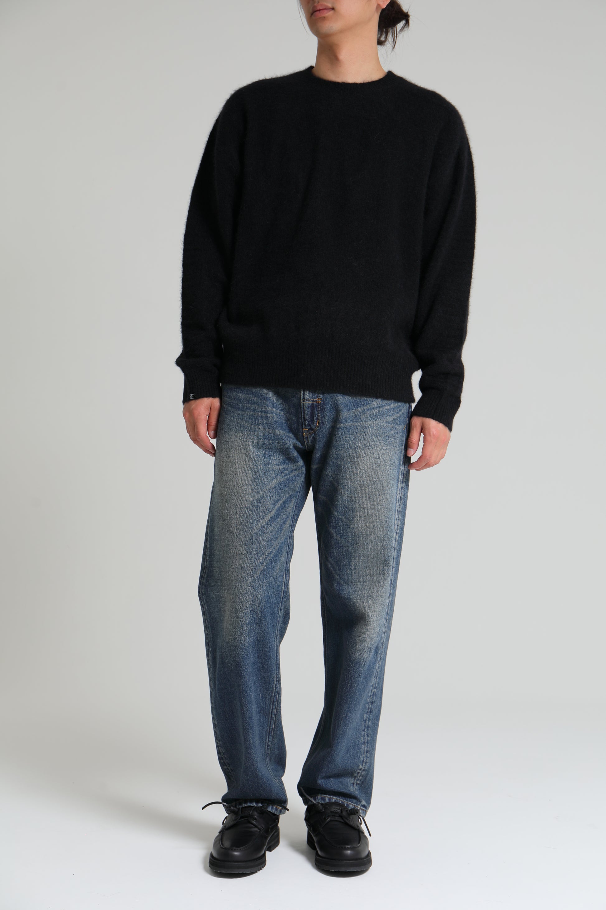 フォックス/ウール/ナイロンの3種混紡生地を使用したクルーネックニット。滑らかで肌あたりの柔らかな質感が特徴。アーム側面、身頃側面をボーダー柄の同生地で切り替えた手の込んだ意匠。身幅にややゆとりのあるシルエット。