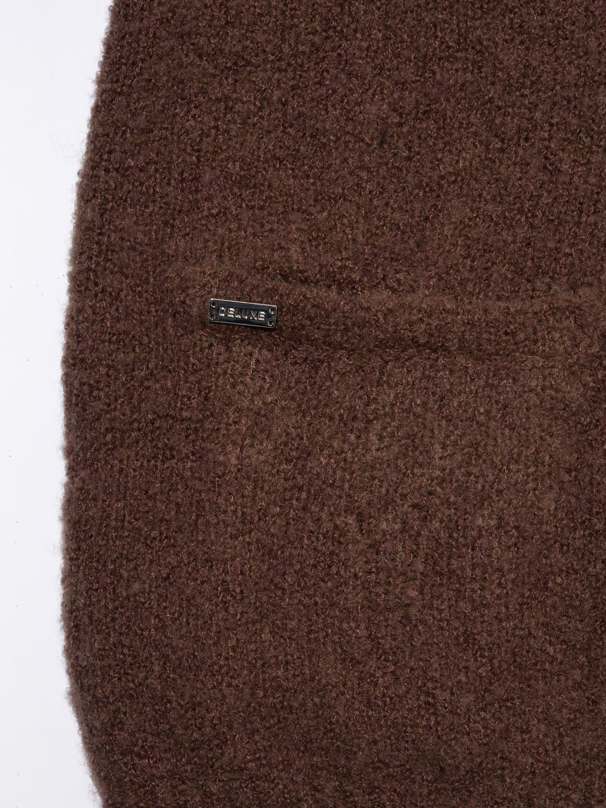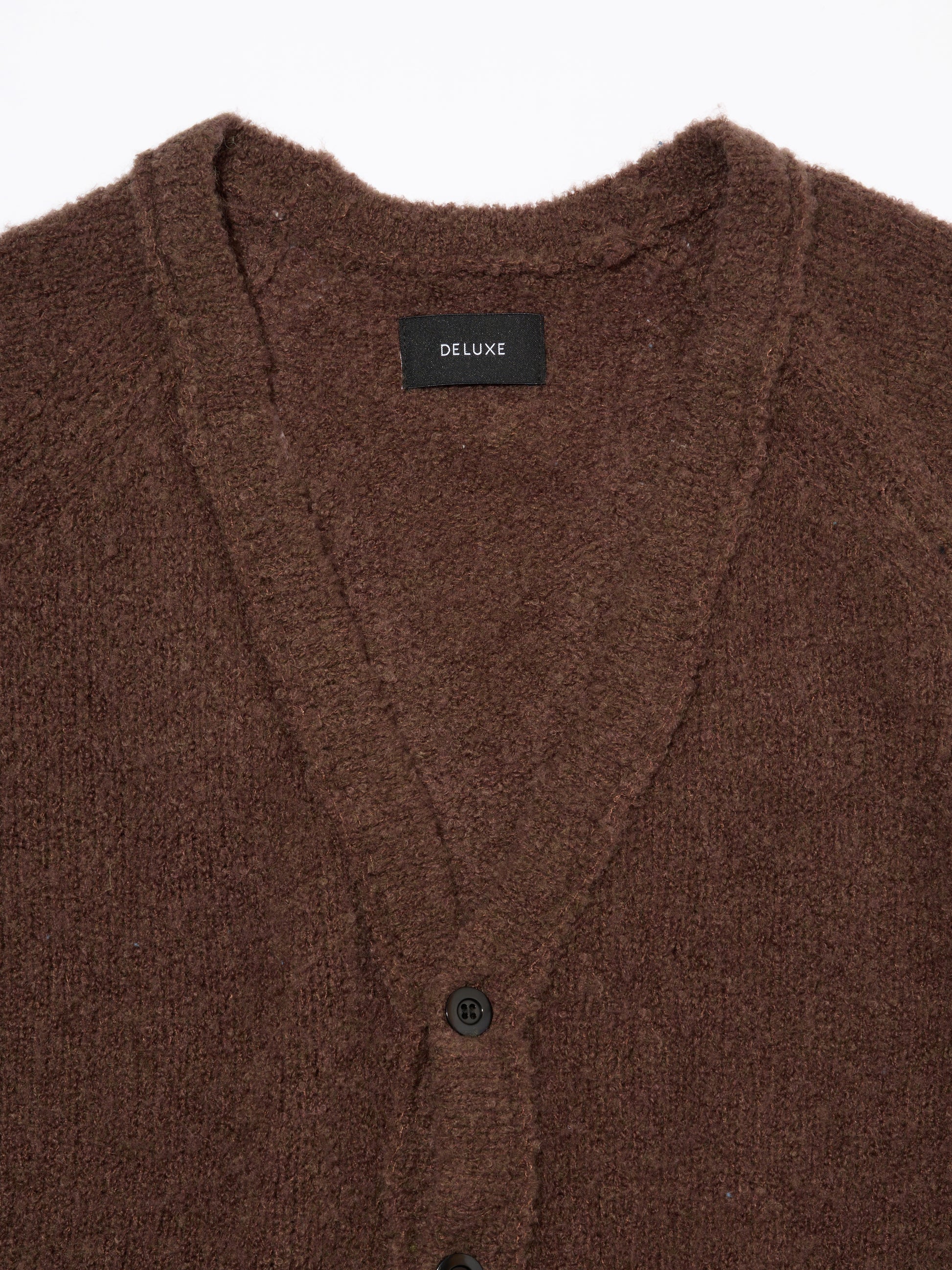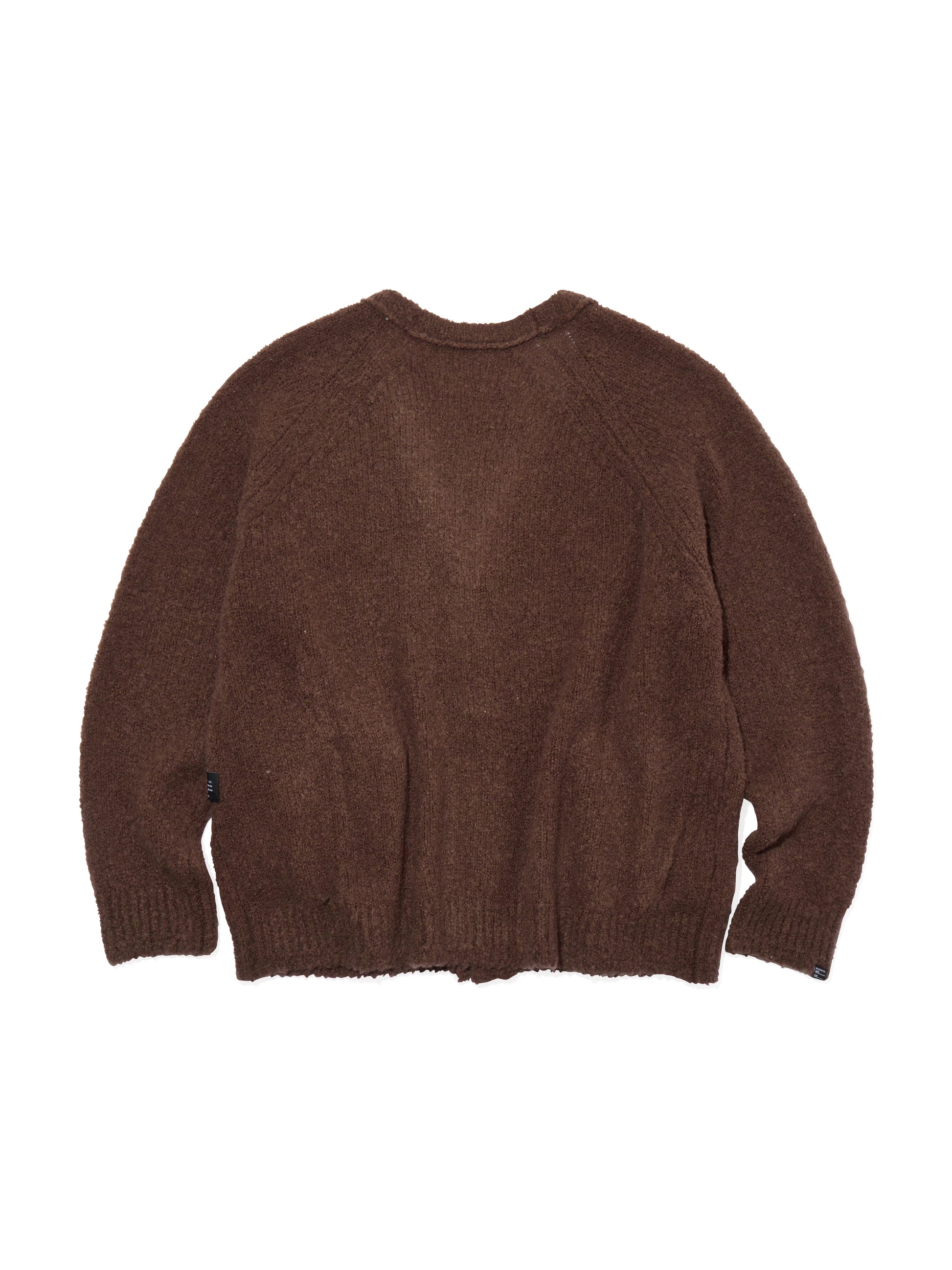 アクリル/ウール/ナイロンの3種混紡生地を使用したカーディガン。両腰にスラッシュポケットを配置。左袖にスクウェア型ネームを叩きつけ。身幅にゆとりのあるシルエット。2色3サイズ展開。