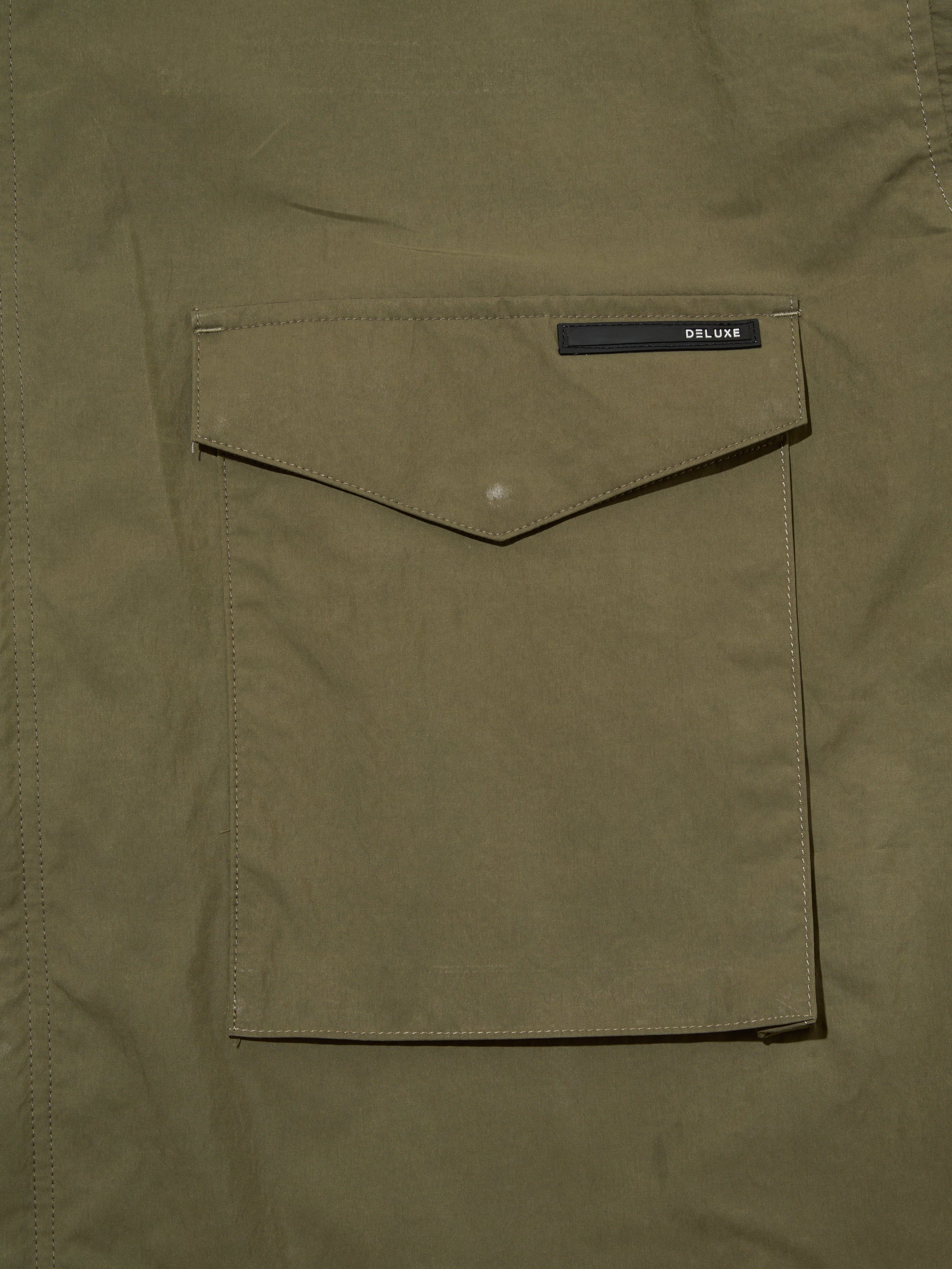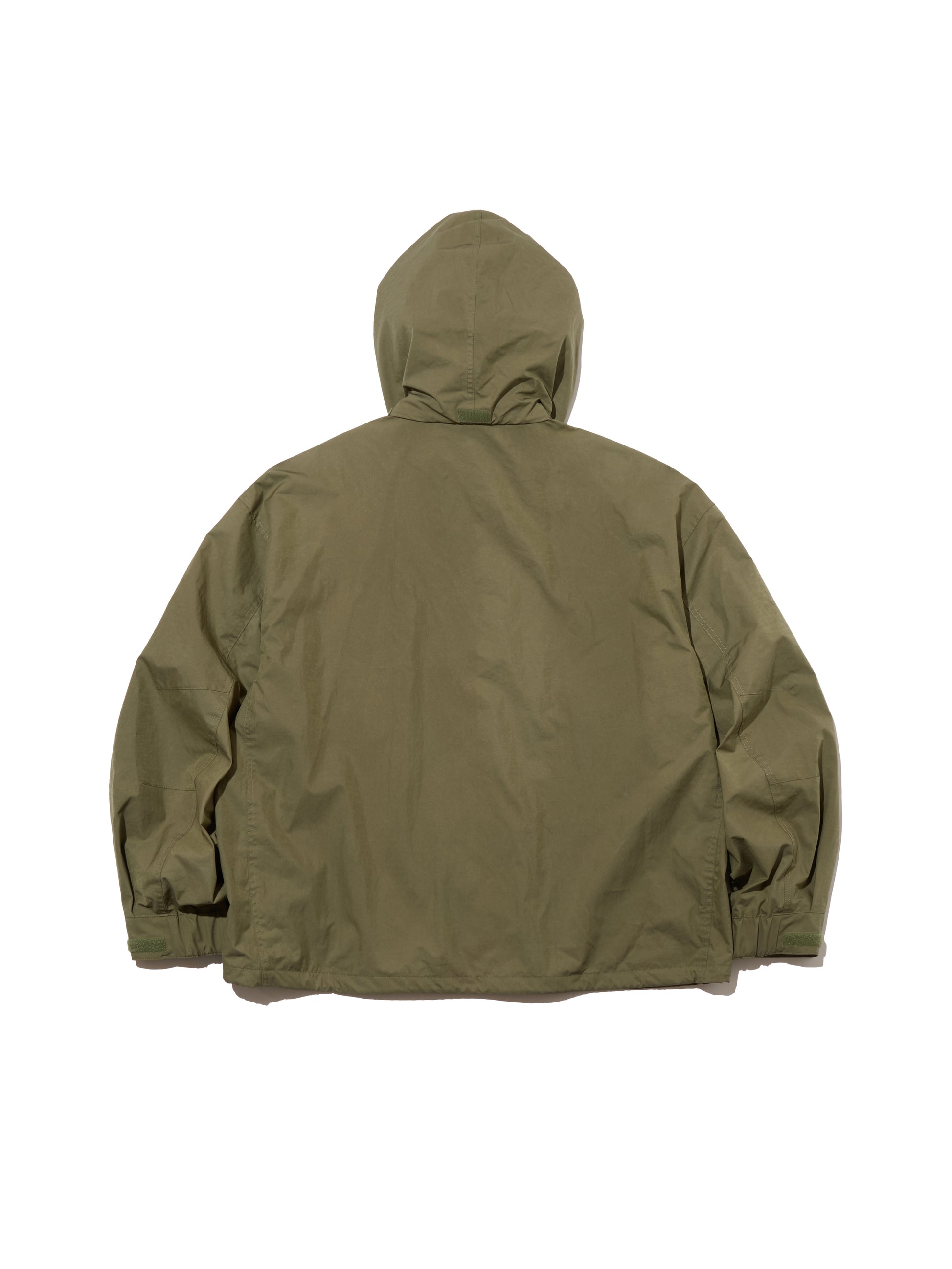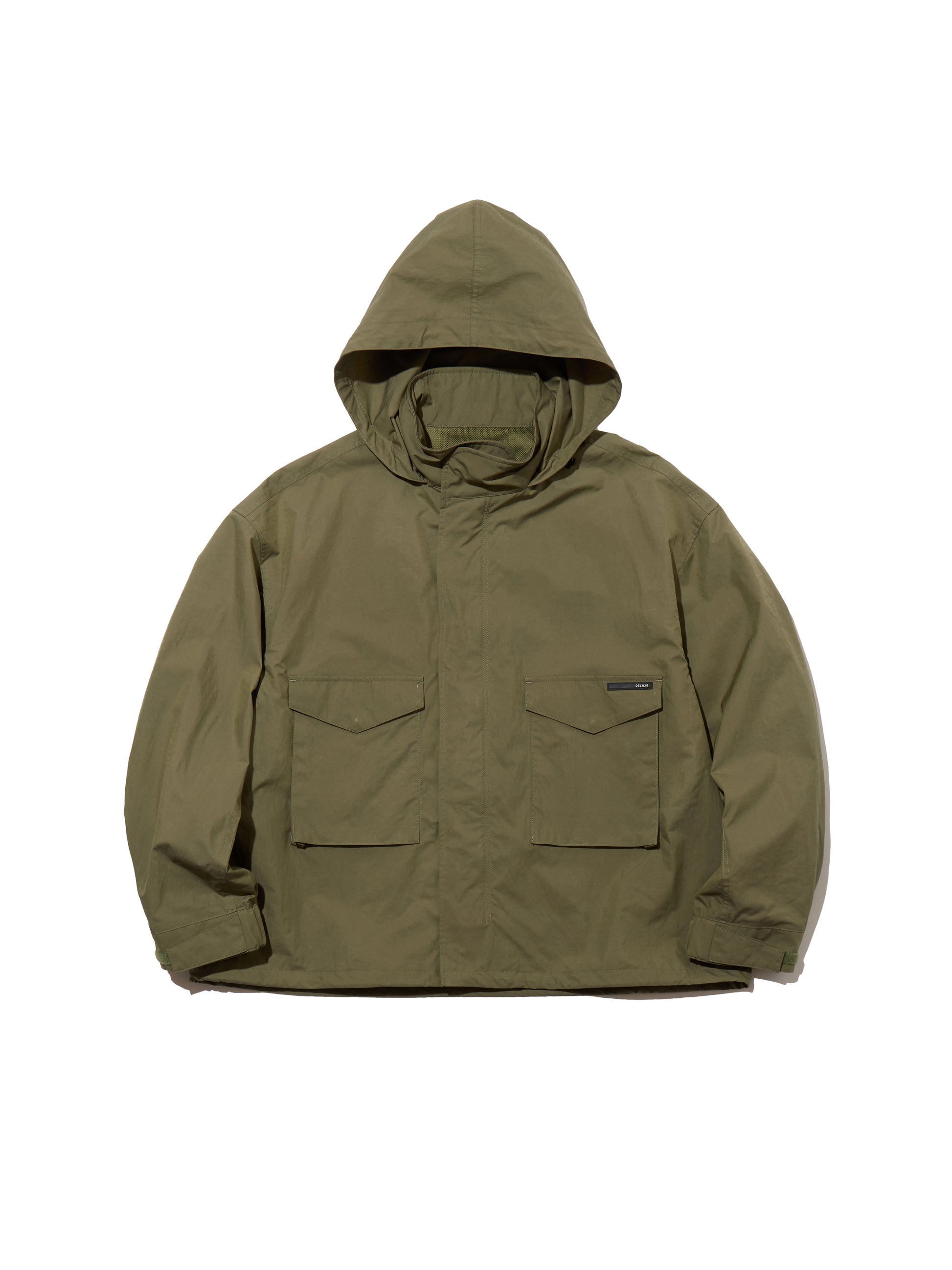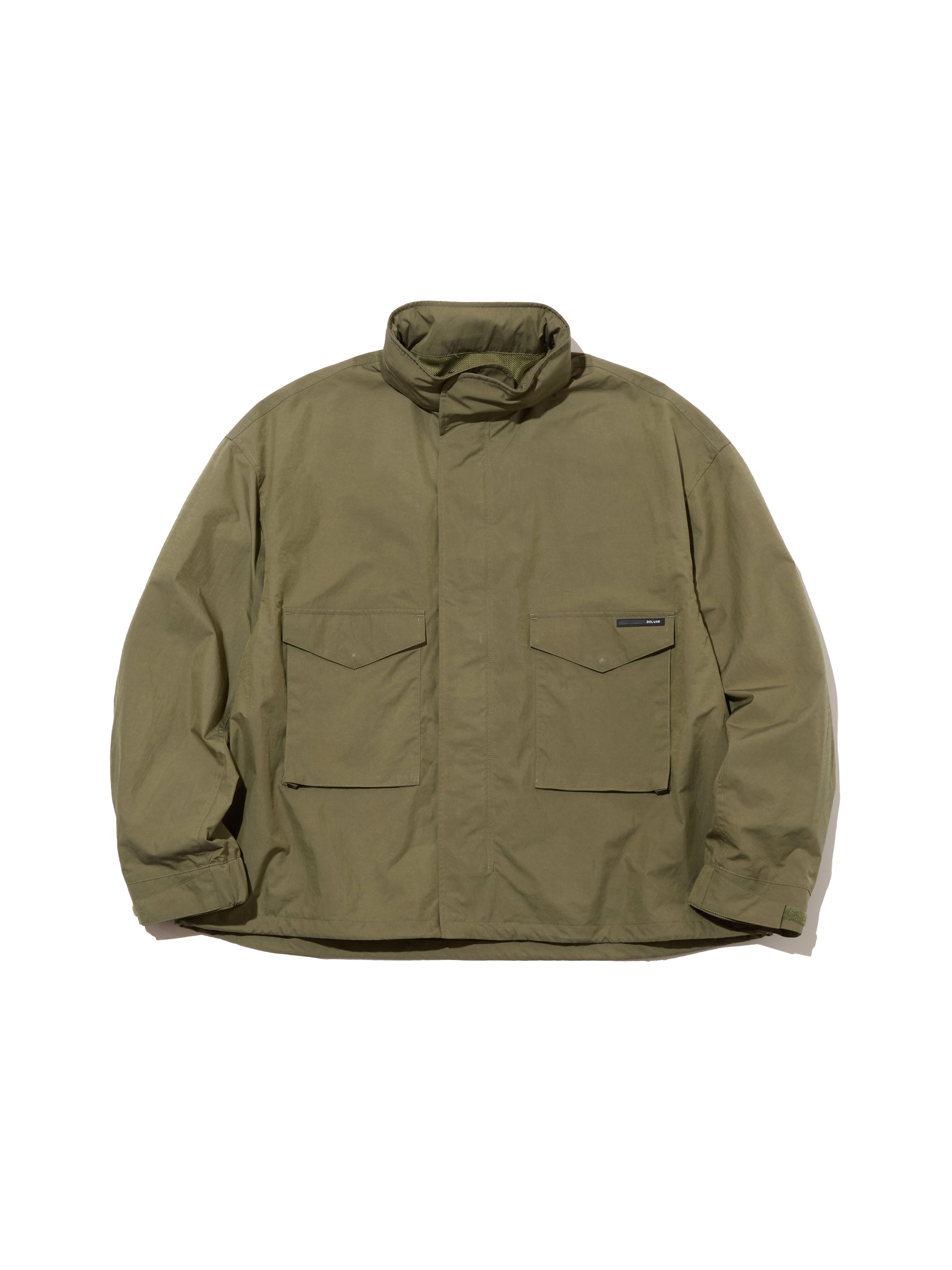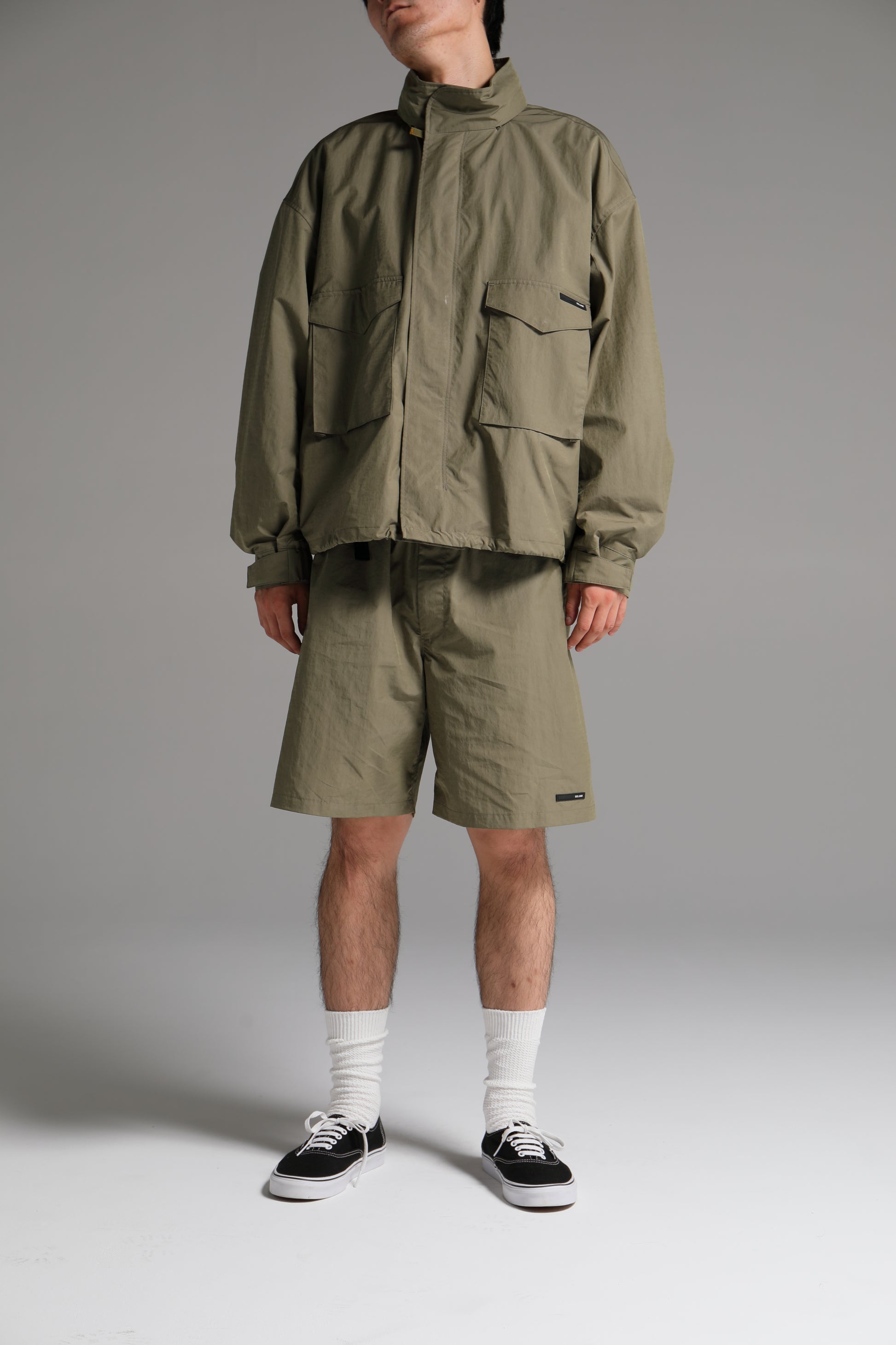 ナイロン素材を使用したM-65 型フィールドジャケット。前立ては比翼仕立て内側ジップアップ仕様、裏地はメッシュ素材、フロント両胸に大振りなフラップポケットが付属。袖口はベルクロ留めアジャスター、裾両サイドにはゴムスピンドルが付属、シルエット調整が可能。ドロップショルダー、身幅にゆとりのあるシルエット。2 色3サイズ展開。