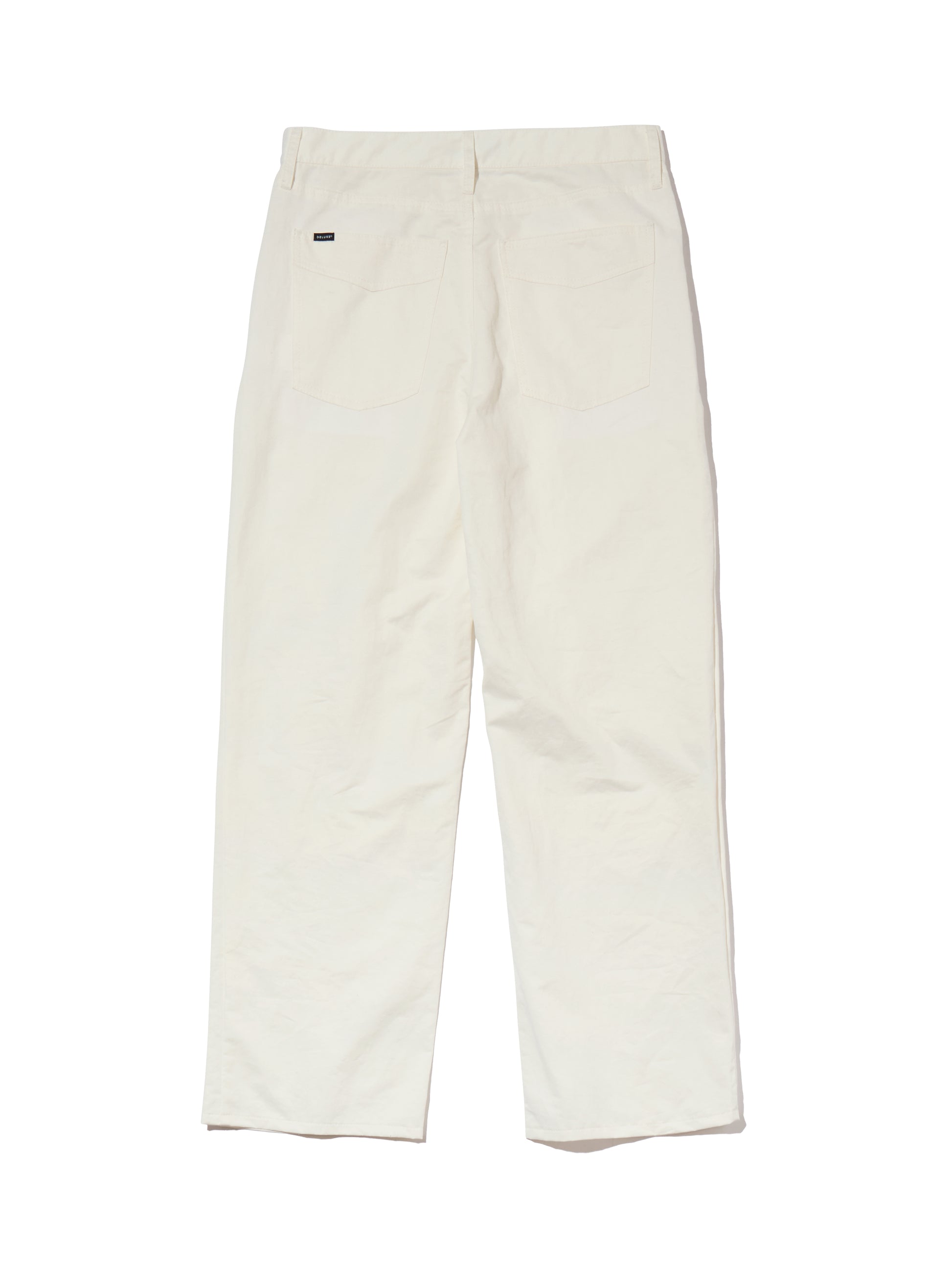 ウォッシュ加工を施し程よくパッカリングが見られ るライトオンスコットンポリ素材を使用したワークトラウザース。両脇に斜め切り込みのスラッシュポケットとコインポケット背面左右に大振りなパッチポケット、背面左ポケット縁にピスネームを配置。5 ポケットパンツとペインターパンツのディテールをブレンドしたハイブリッドなデザイン。ヘム幅広め、レッグにゆとりのある ストレートシルエット。