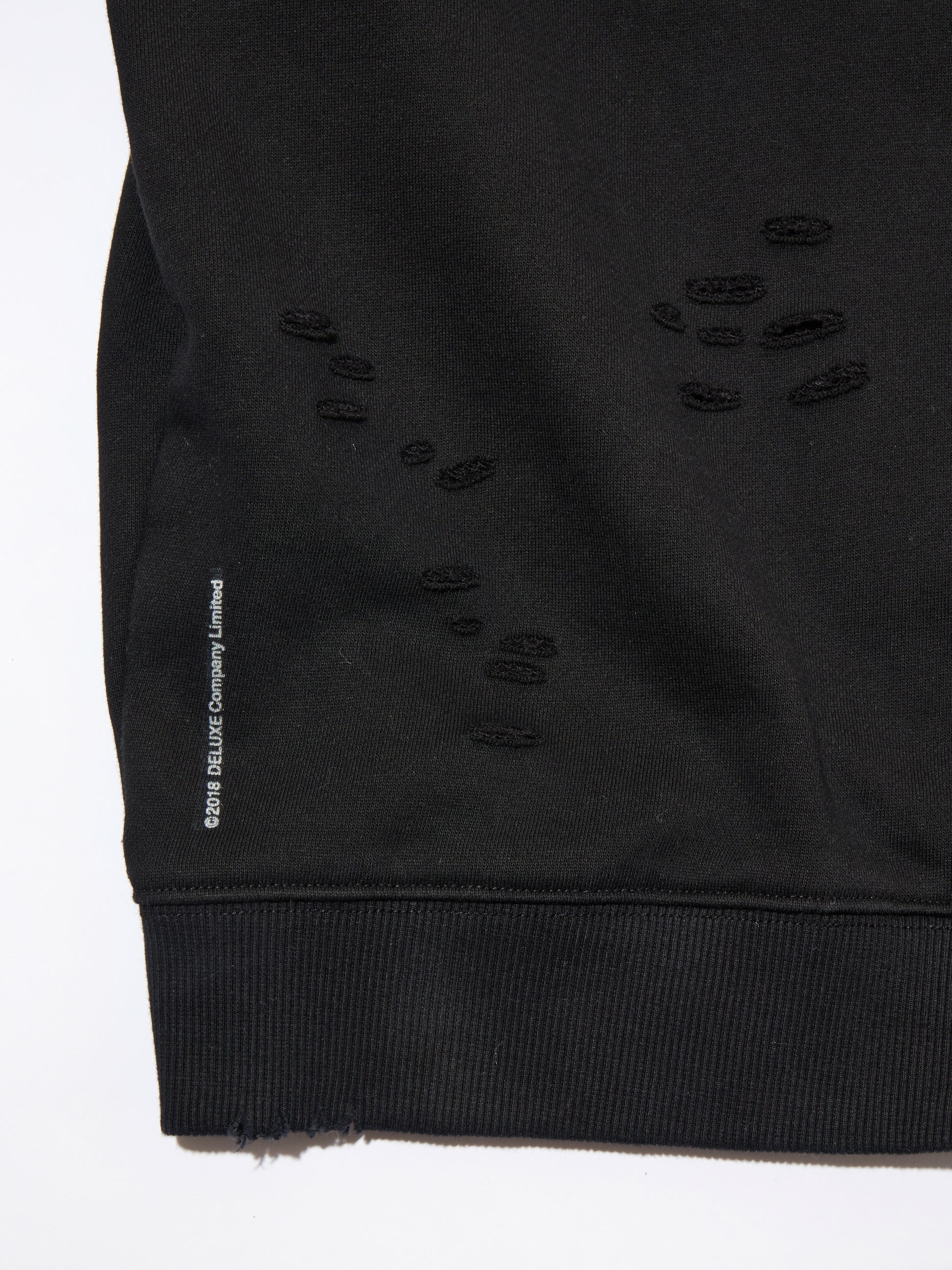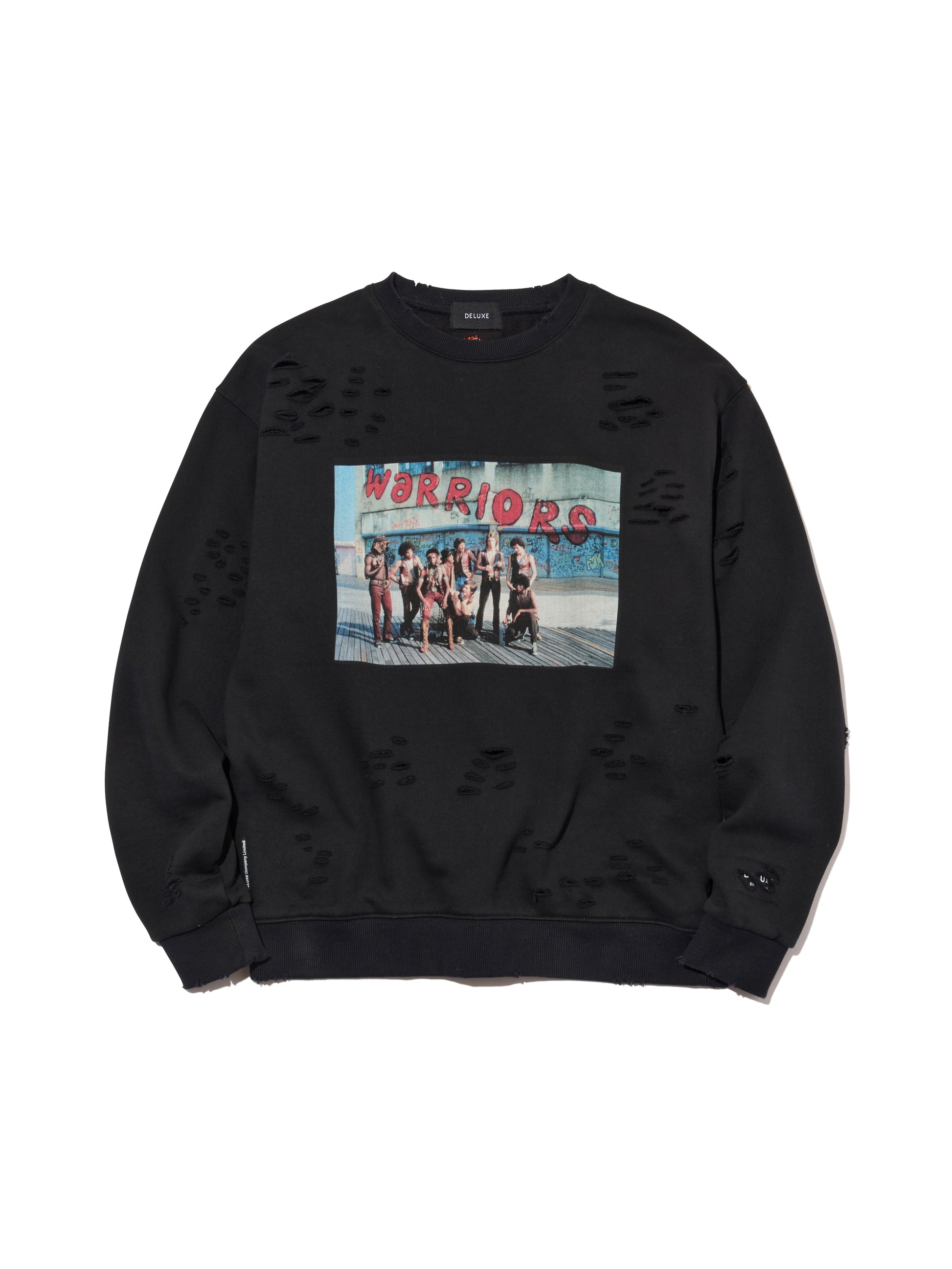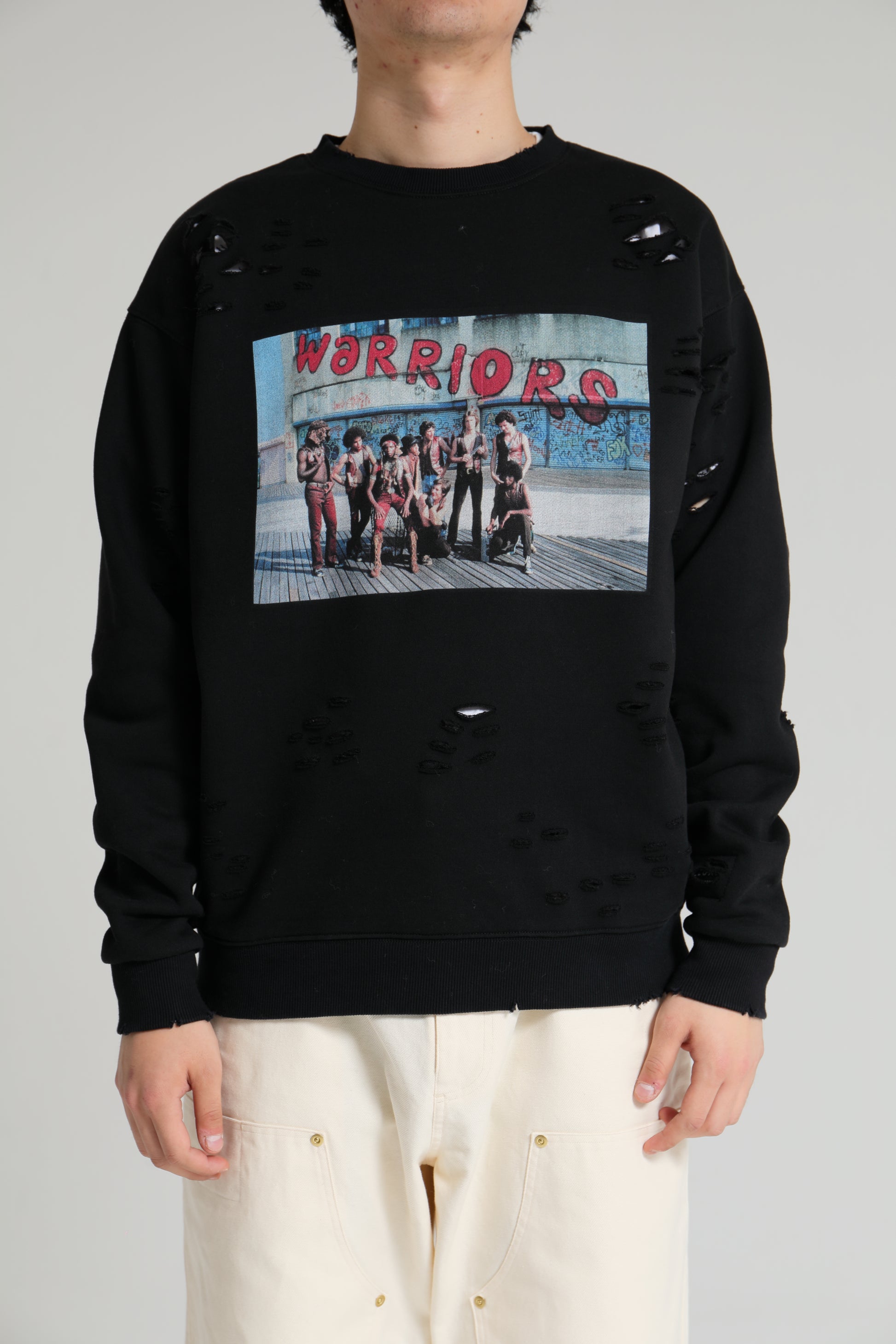 オリジナルで作成した肉厚なコットン裏毛を起毛させた素材を使用したクルーネックスウェットシャツ。身頃全体にダメージ加工を施し、ヴィンテージな風合いに仕上げた。フロントにWarriors劇中フォトを昇華転写プリントで表現したデザイン。左袖のダメージ痕下にブランドロゴ、前身頃右下にコピーライトロゴをラバープリン身幅にゆとりのあるシルエット。色4サイズ展開。1979年公開のアメリカ映画『THE Warriors』とのオフィシャルコラボレーションモデル。