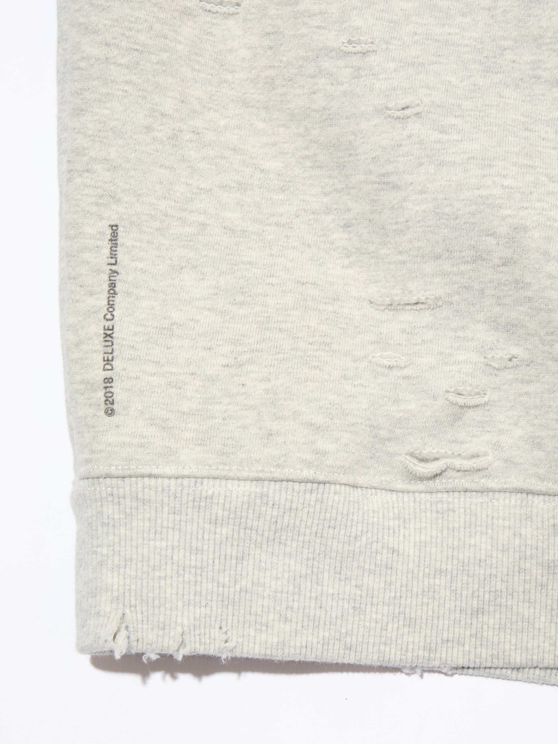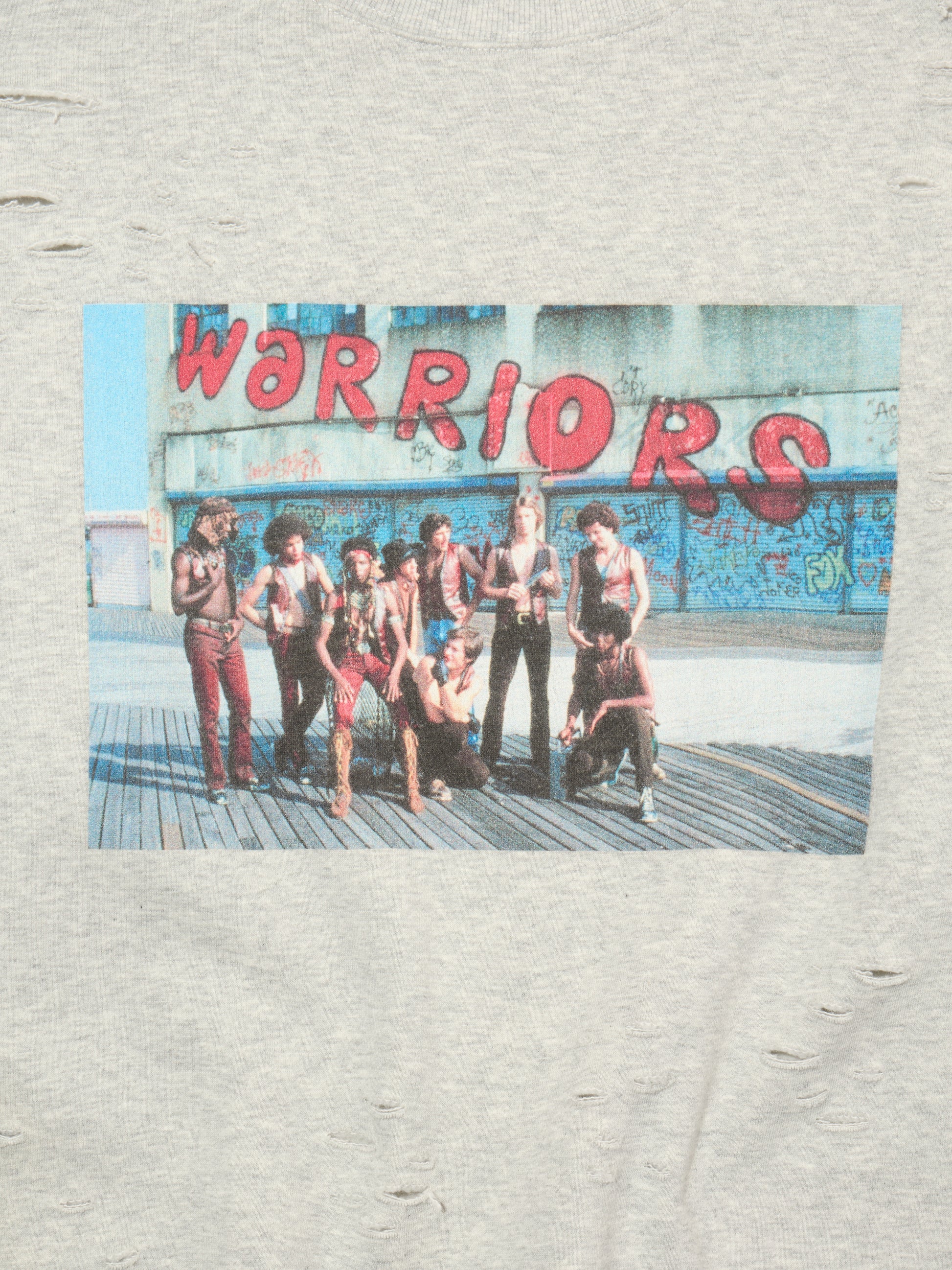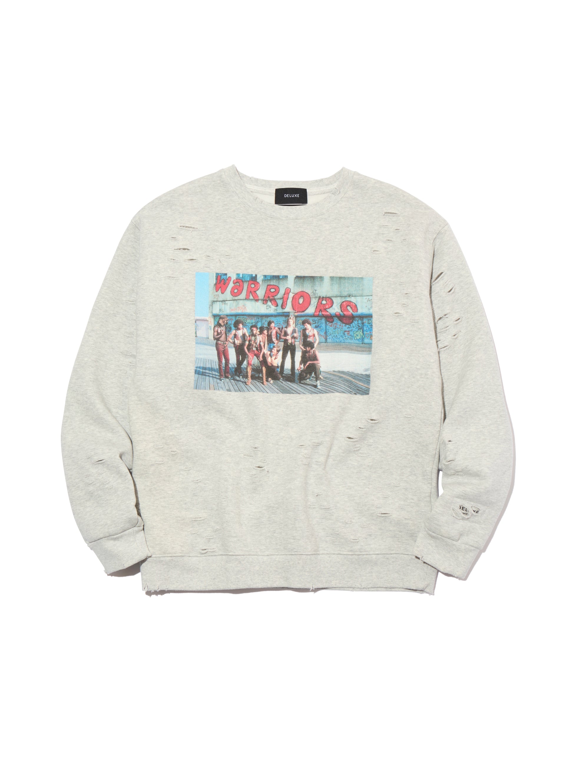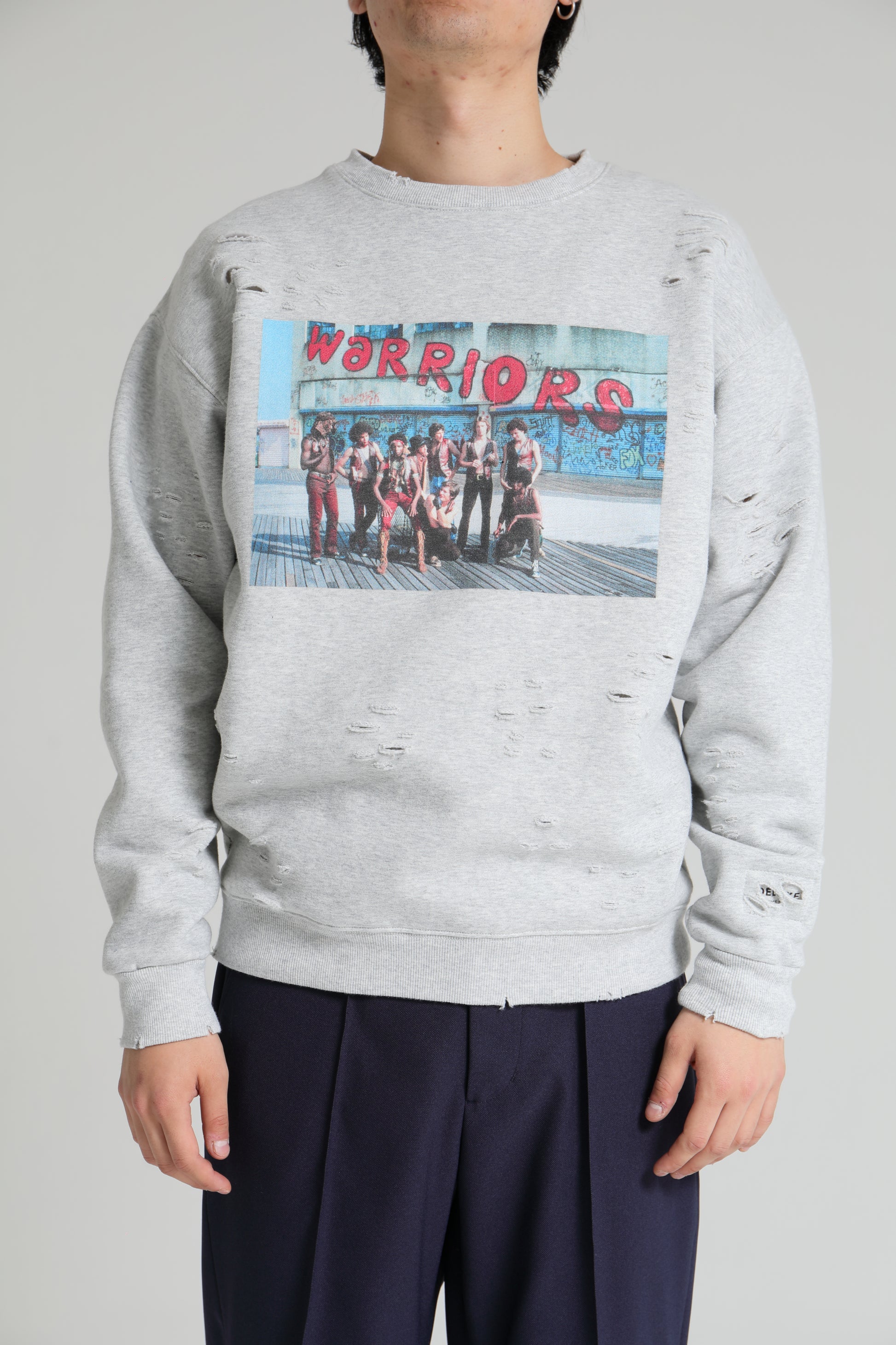 オリジナルで作成した肉厚なコットン裏毛を起毛させた素材を使用したクルーネックスウェットシャツ。身頃全体にダメージ加工を施し、ヴィンテージな風合いに仕上げた。フロントにWarriors劇中フォトを昇華転写プリントで表現したデザイン。左袖のダメージ痕下にブランドロゴ、前身頃右下にコピーライトロゴをラバープリン身幅にゆとりのあるシルエット。色4サイズ展開。1979年公開のアメリカ映画『THE Warriors』とのオフィシャルコラボレーションモデル。