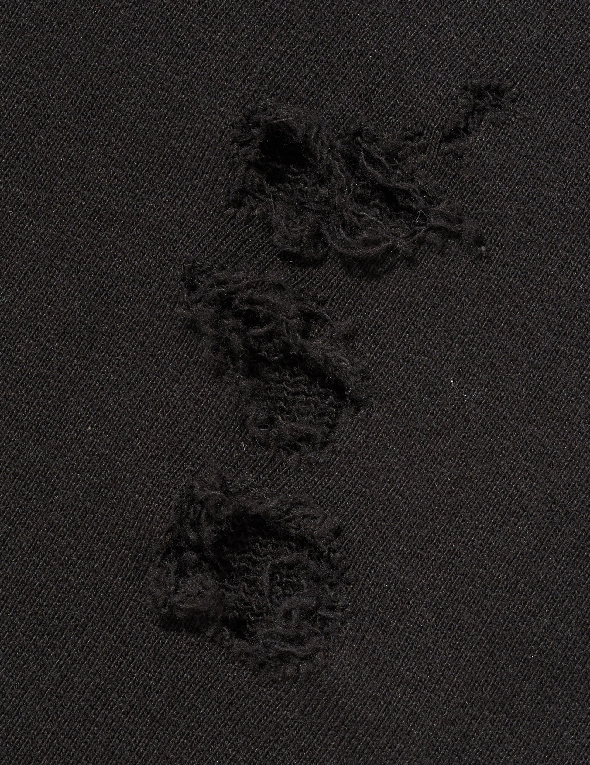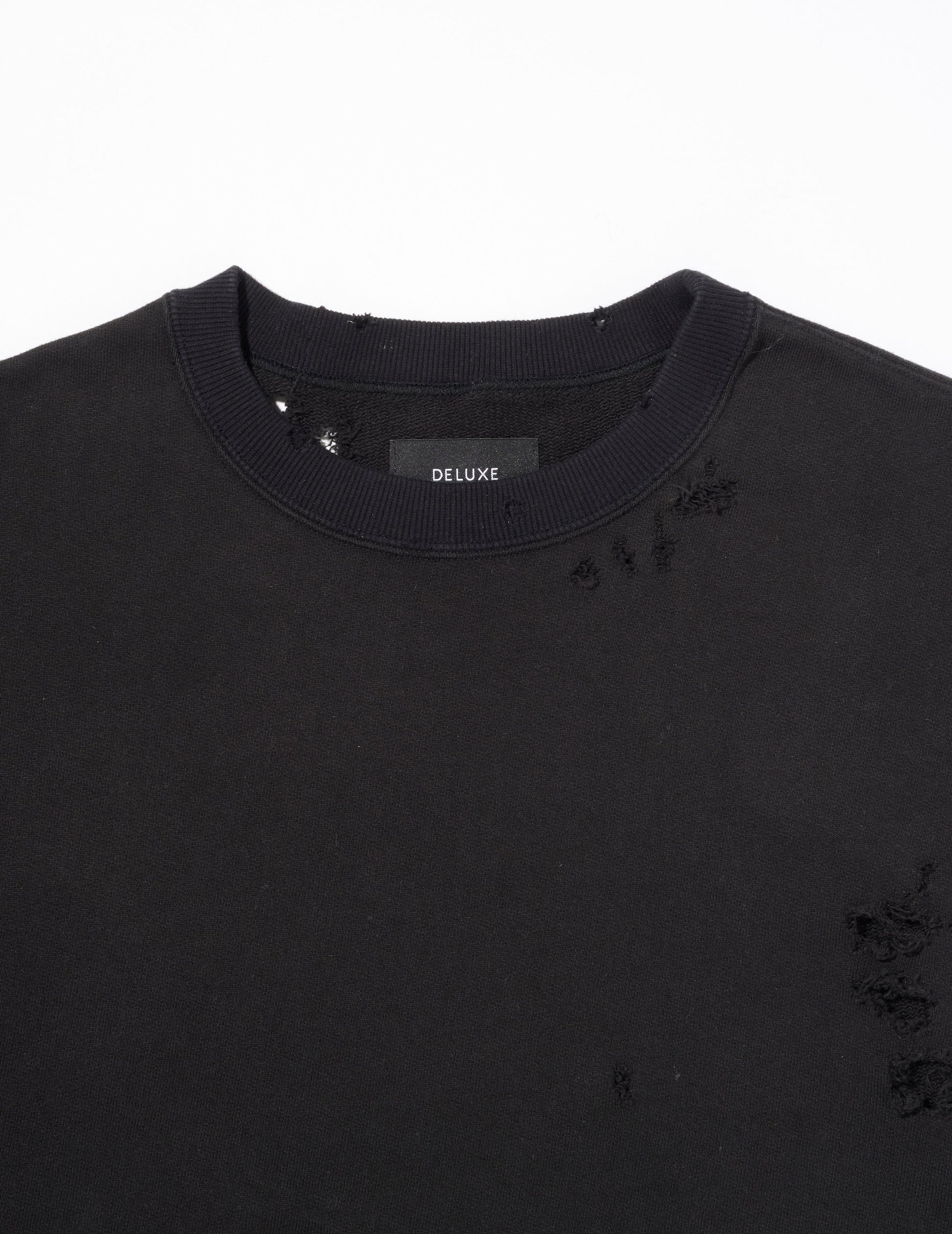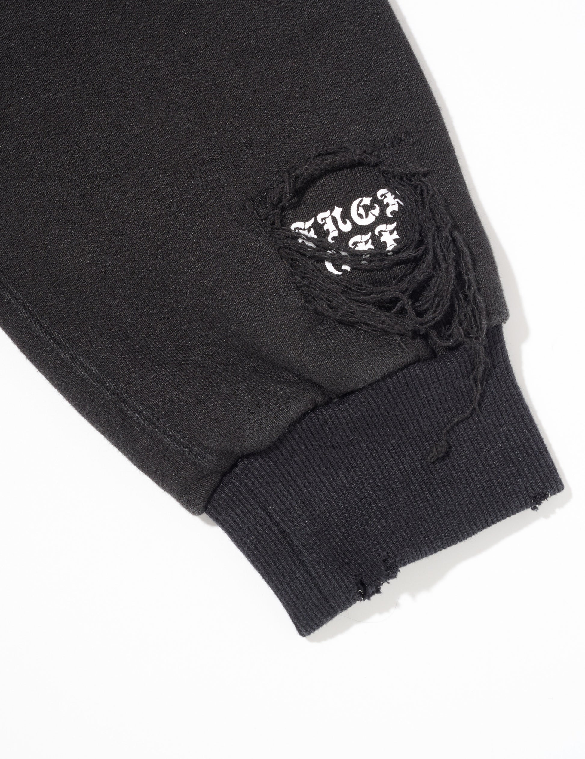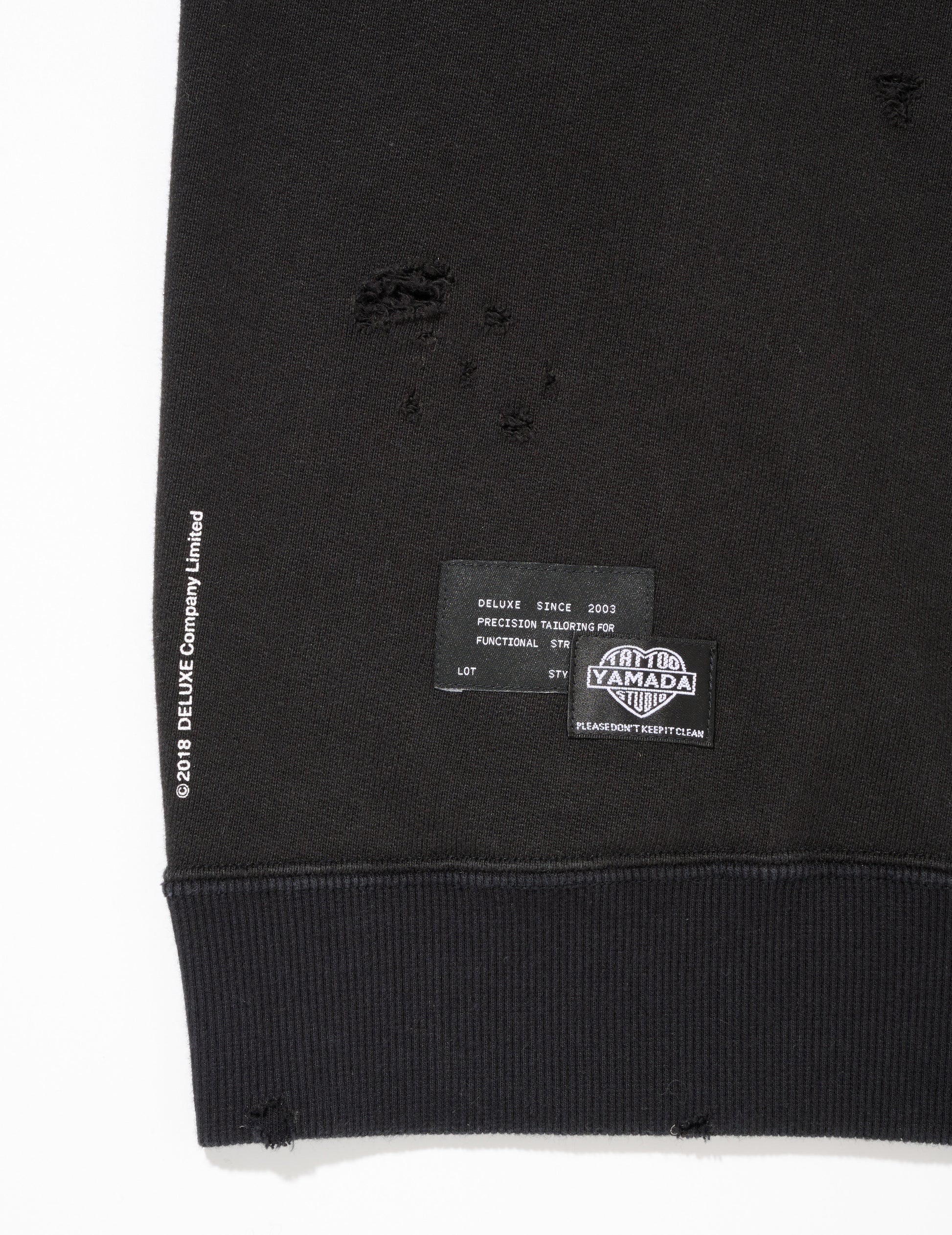 オリジナルで作成したコットン裏毛素材を使用したクルーネックスウェットシャツ。背面には、ハンドサインをベースに、無数の「LOVE YOU」という文字をタイポグラフィで構成したグラフィックを配置した遊び心あるデザインです。身頃全体にダメージ加工を施し、ヴィンテージな風合いに仕上げ、左袖のダメージ痕下にFxxK OFFのプリント、前身頃右下にコピーライトロゴをラバープリントで配置。身頃の右脇に2ブランドの織りネームを叩きつけ。身幅にゆとりのあるシルエット。