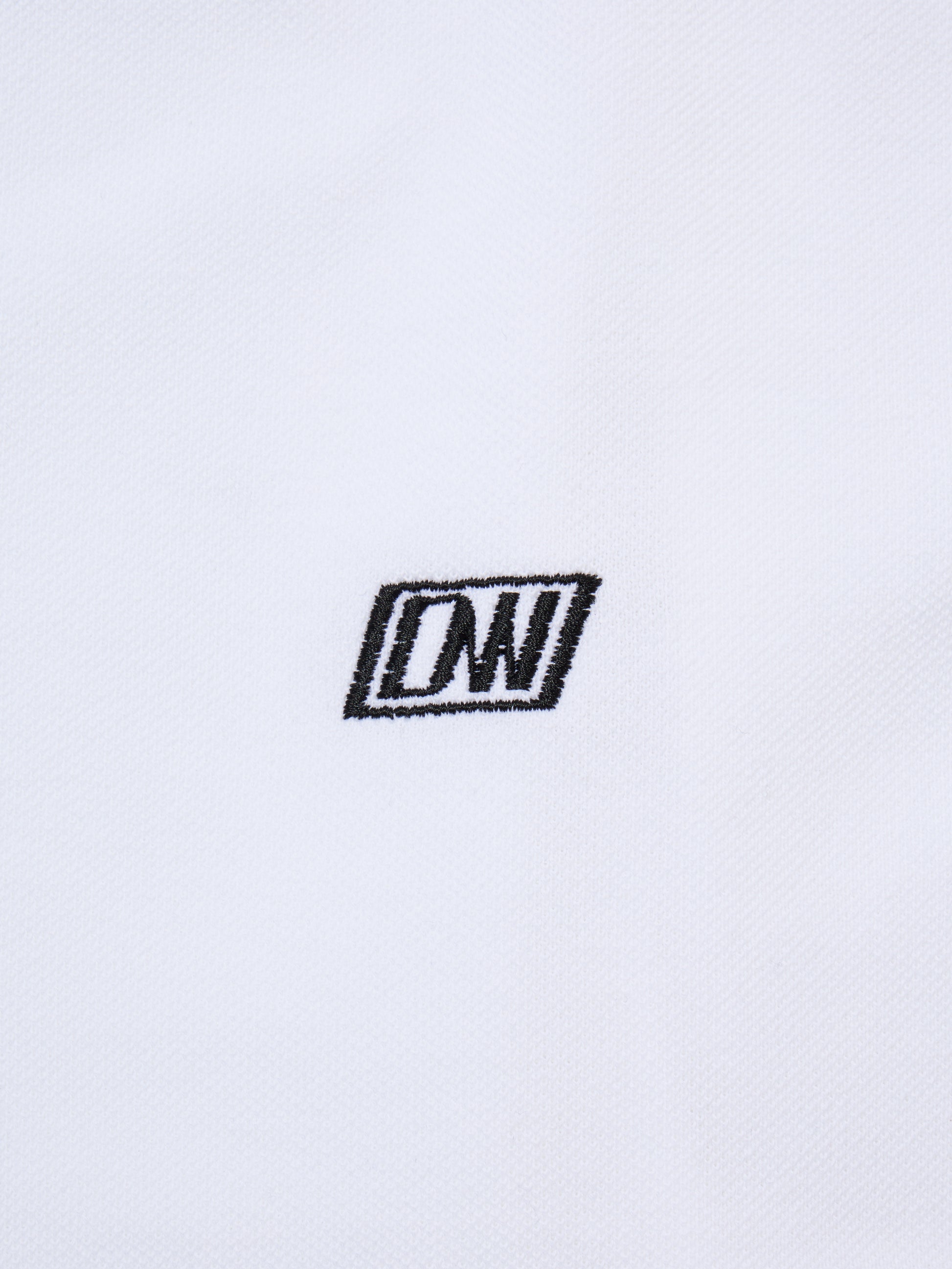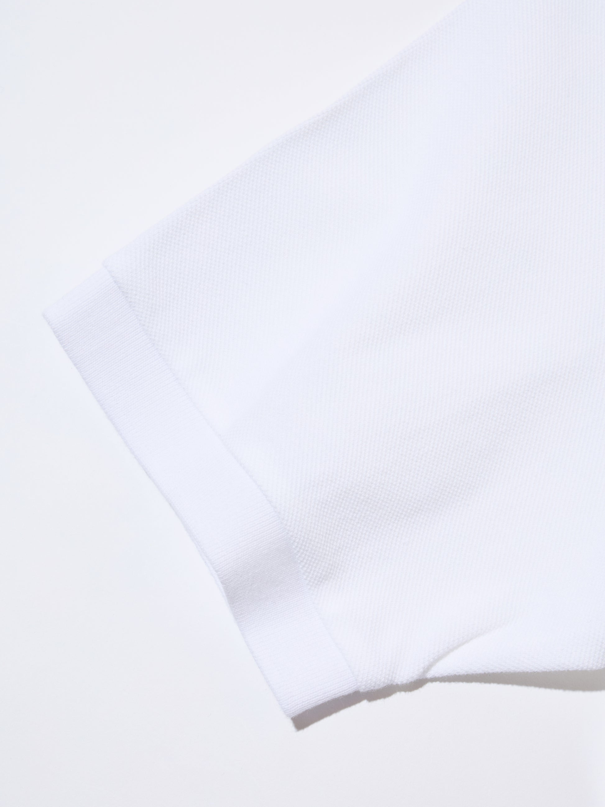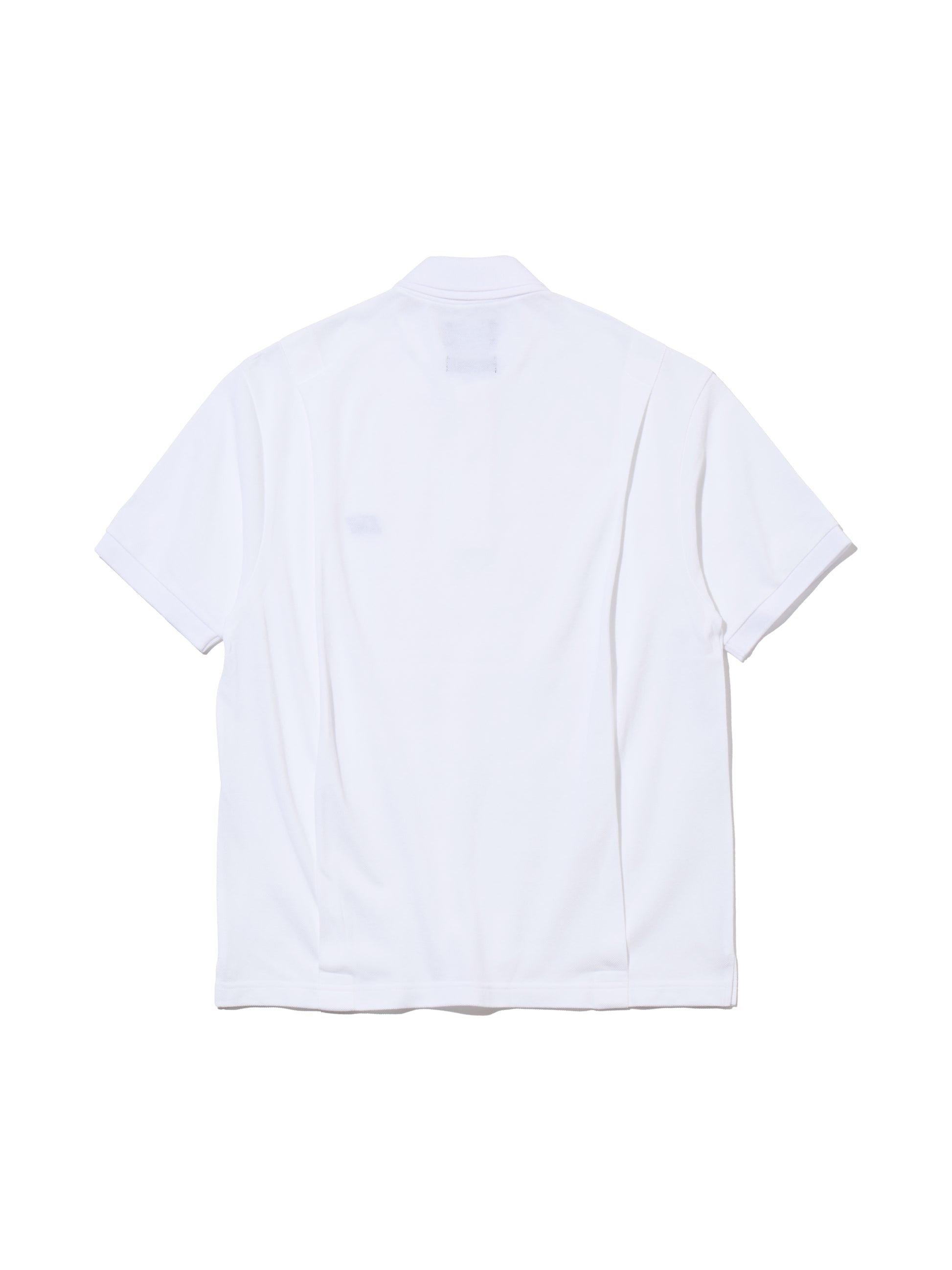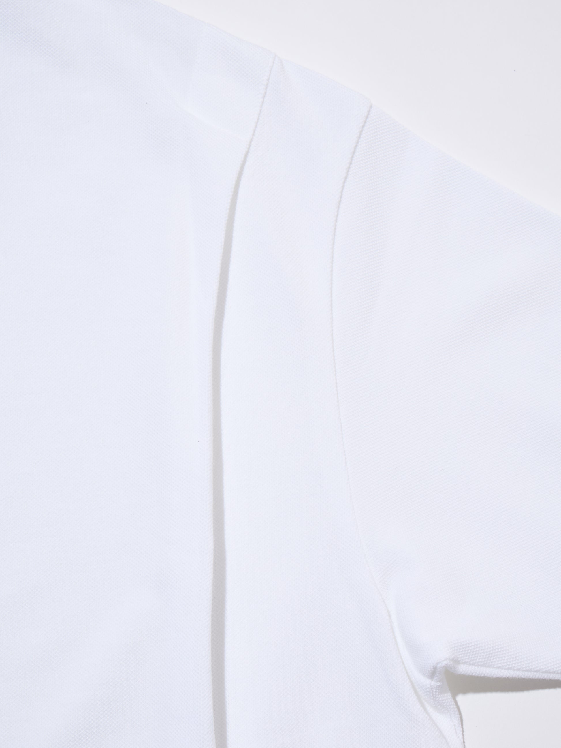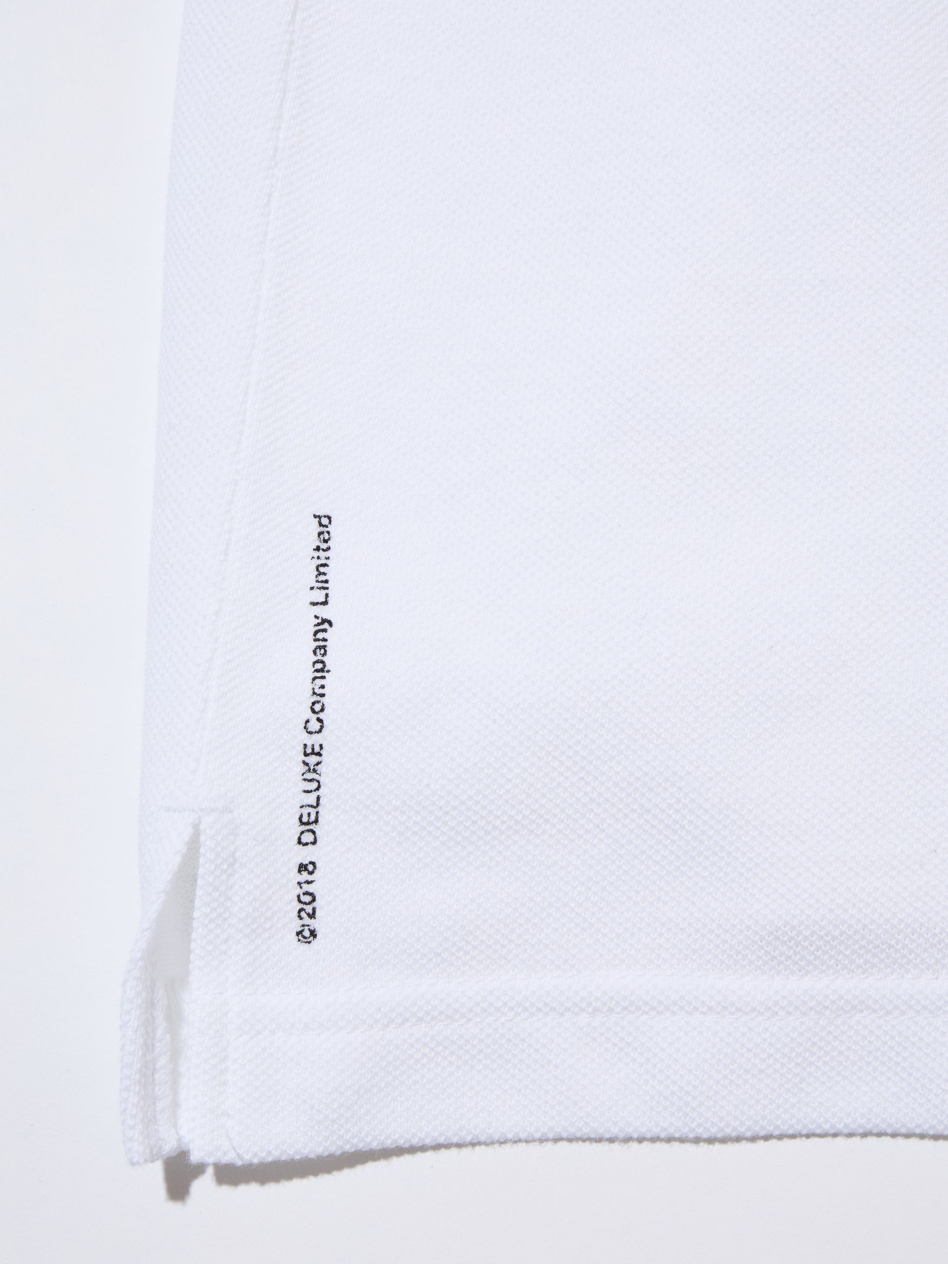 ドライタッチな質感のコットン鹿の子素材を使用し た半袖ポロシャツ。衿が 2 重となる DELUXE のディテー ルアイコンを採用したデザイン。左胸にブランドイニシャ ルのワンポイント刺繍、両裾には短めのスリットを配置。 身幅にややゆとりのあるシルエット。東京・原宿で活動 をする実力派ビスポークテーラー、Wisdom Tool とのコ ラボレーションモデル。2 色 4 サイズ展開。