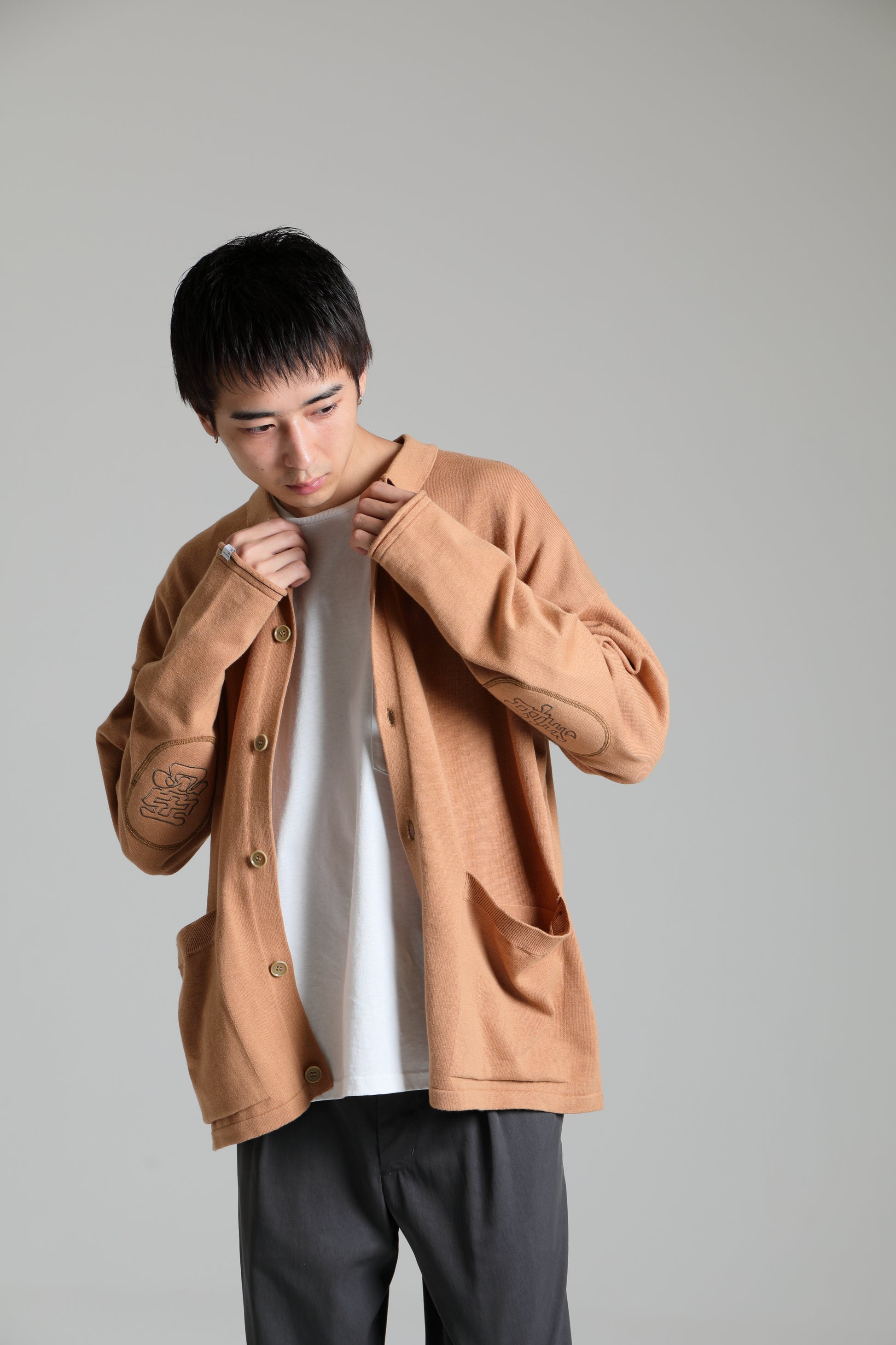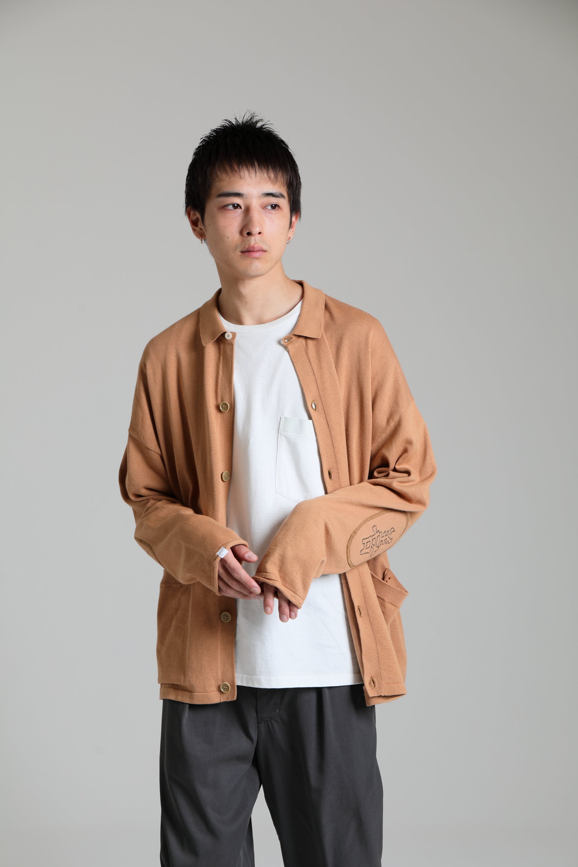 コットン/アクリルの混紡素材を使用した襟付き ニットシャツジャケット。左肘に “善”、右肘に “悪” の 刺繍パッチ型レター、左胸にエンブレムモチーフをエン ブロイダリーで表現。前身頃の下部左右に大ぶりのパッ チポケットを配置。前合わせに 6 つボタンを配置したカー ディガン風の意匠を採用したデザイン。2 色 3 サイズ展開。 ストリート/スケートシーンで注目を集めるブランド Evisen Skateboards とのコラボレーションモデル。