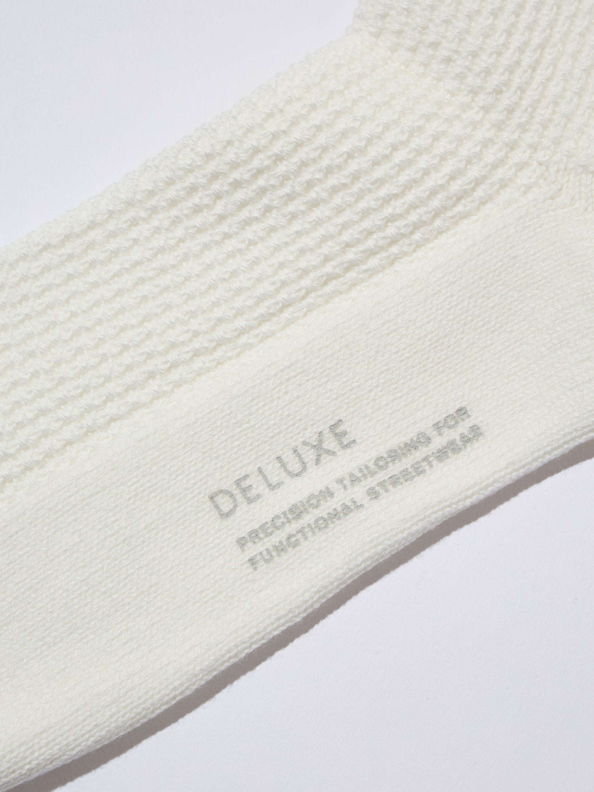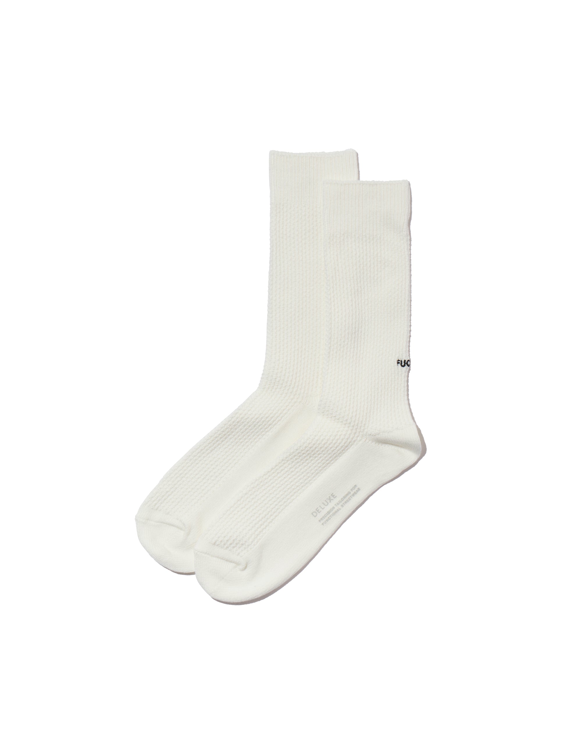 アンクル丈のレングスをしたオリジナルソックス。 両足背面にメッセージ、底部にブランドロゴをラバープ リント。