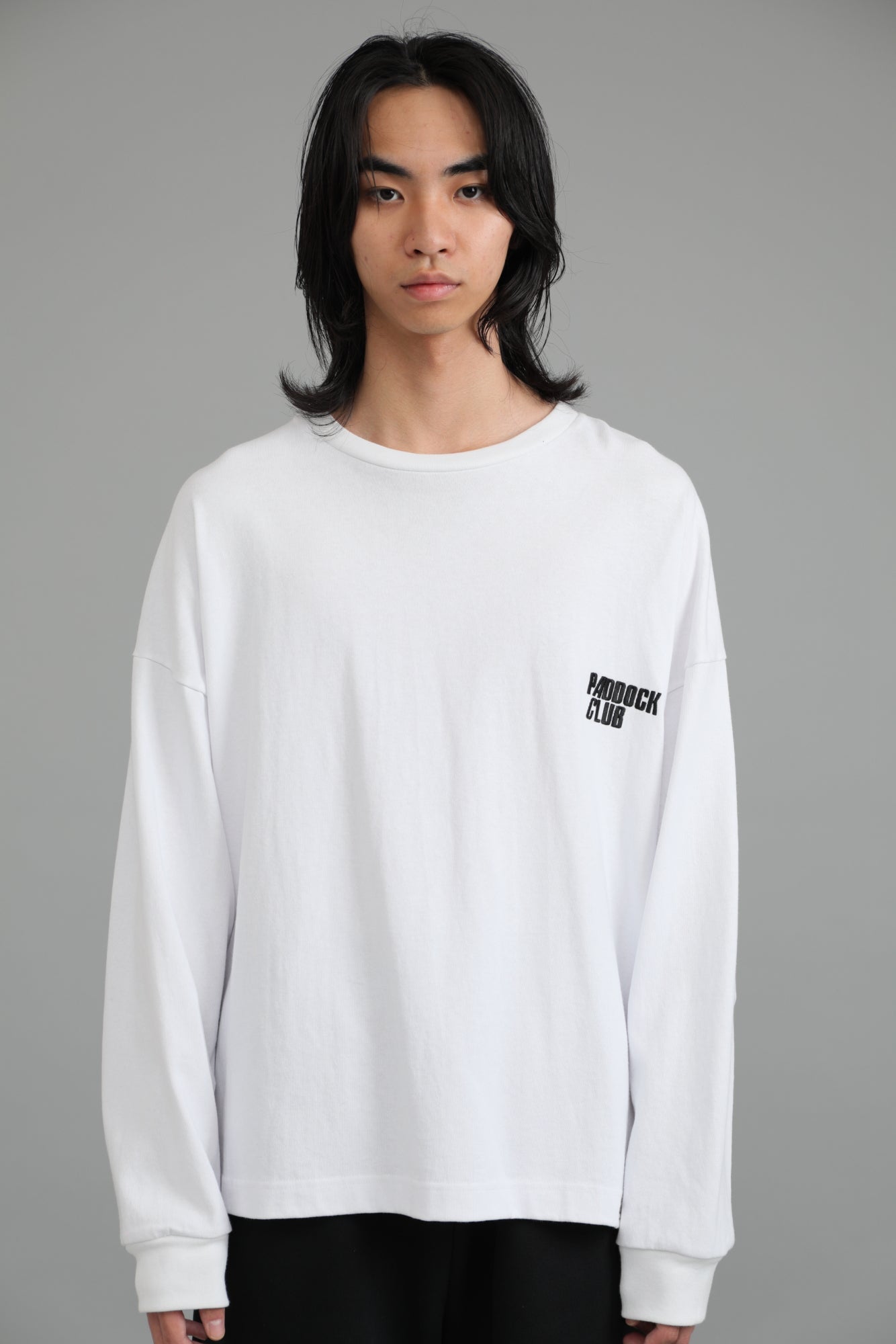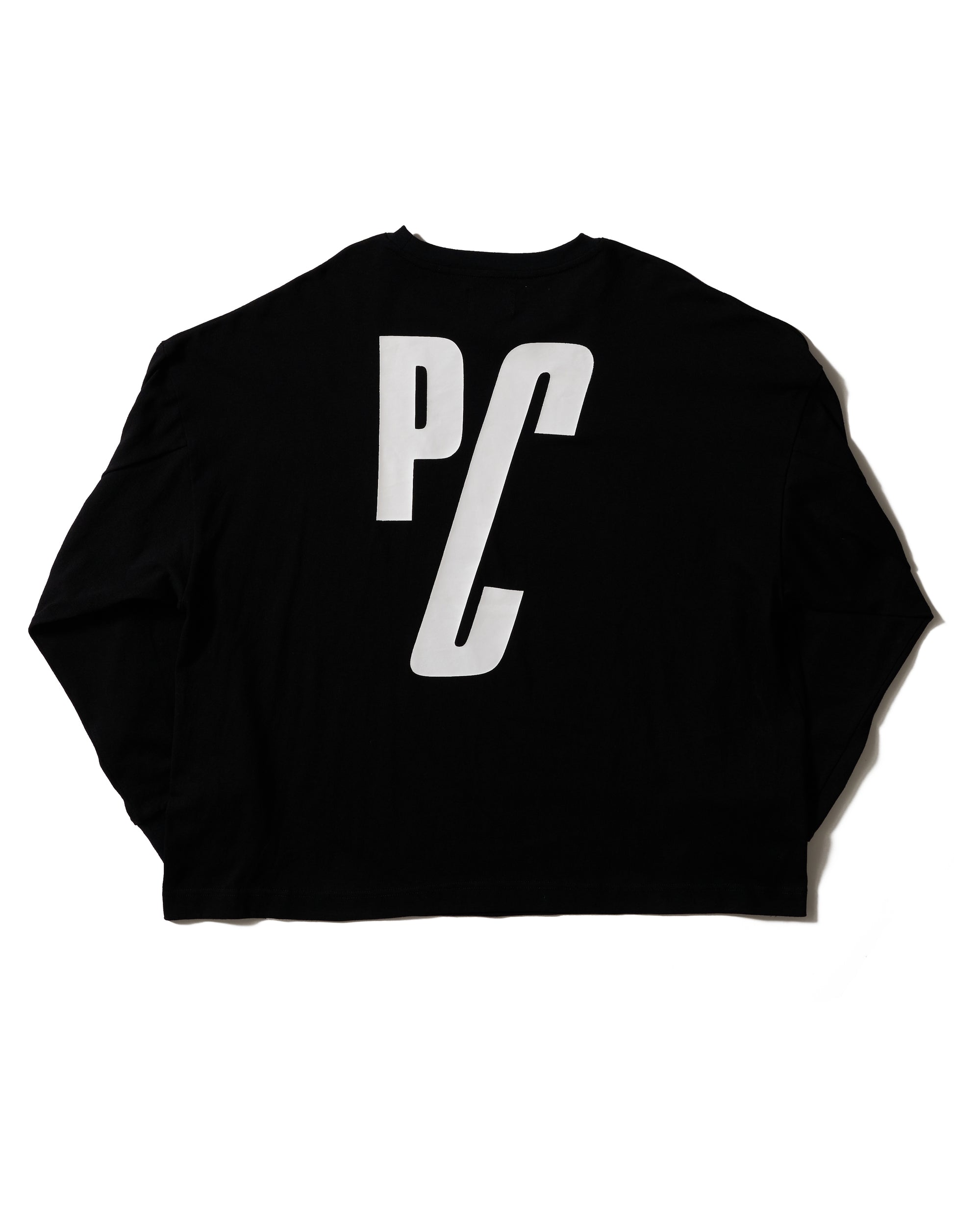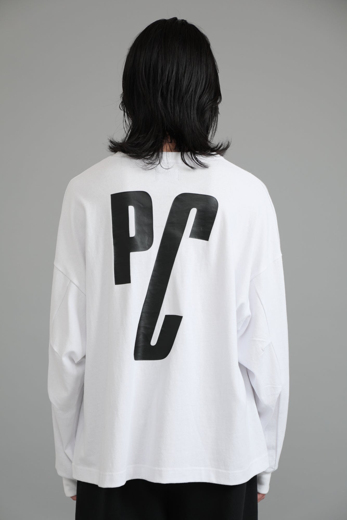 オリジナルで作成したコットン天竺素材を使用したロングスリーブTシャツ。フロント左胸にPCロゴのエンブロイダリー、背面全体にブランドロゴのオリジナルグラフィックをマッドラバーの厚盛プリント。左裾に刺繍ネームタグの叩きつけたデザイン。レギュラーフィットシルエット。WHIT・BLKの2色展開。