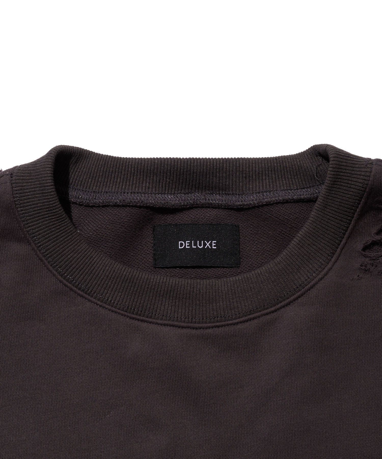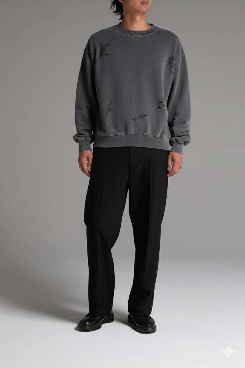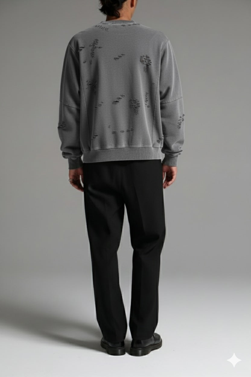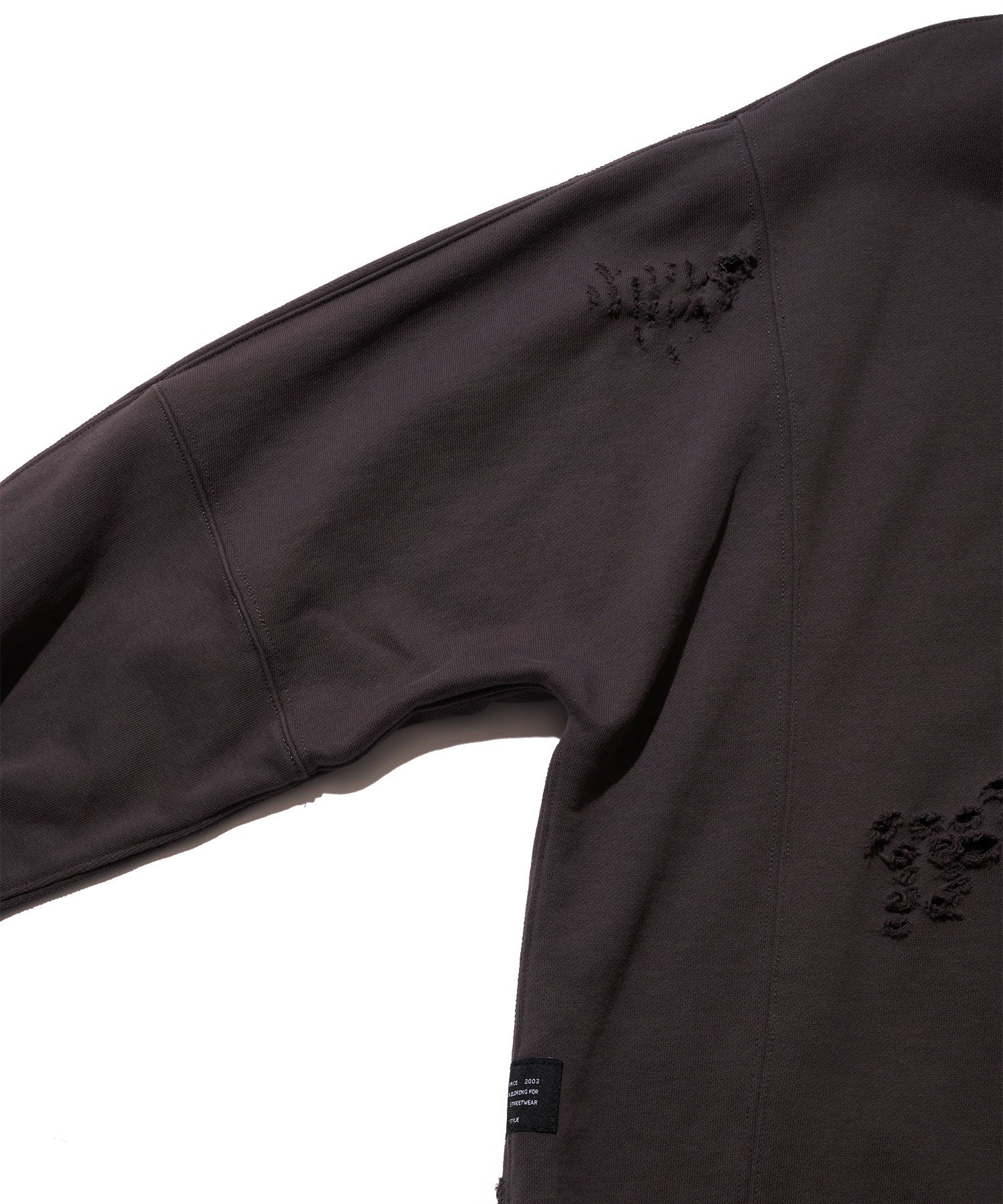オリジナルで作成したコットン裏毛素材を使用したクルーネックスウェットシャツ。身頃全体にピグメント加工・ダメージ加工を施し、ヴィンテージな風合いに仕上げた。左袖のダメージ痕下にブランドロゴ、前身頃右下にコピーライトロゴをラバープリントで配置。身頃の左脇にスクウェア型ネームを叩きつけ。身幅にゆとりのあるシルエット。3色4サイズ展開。