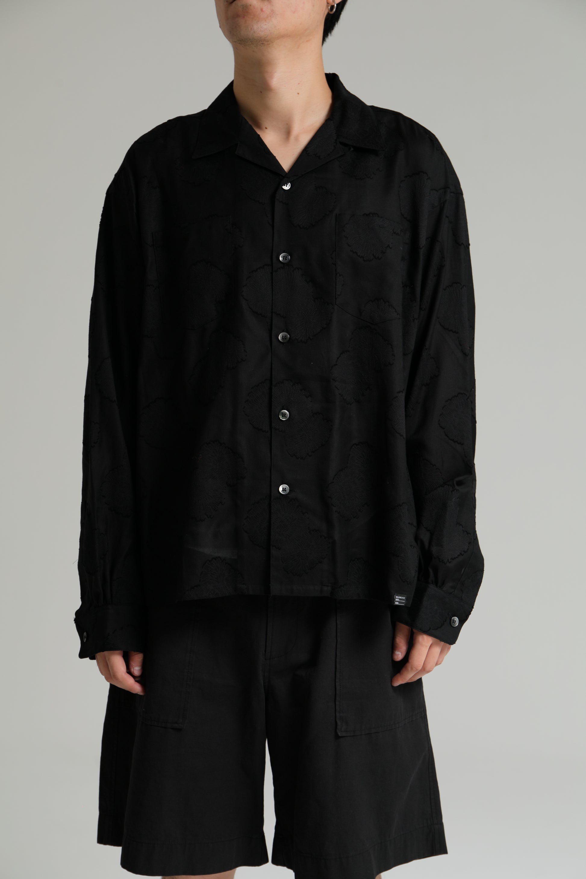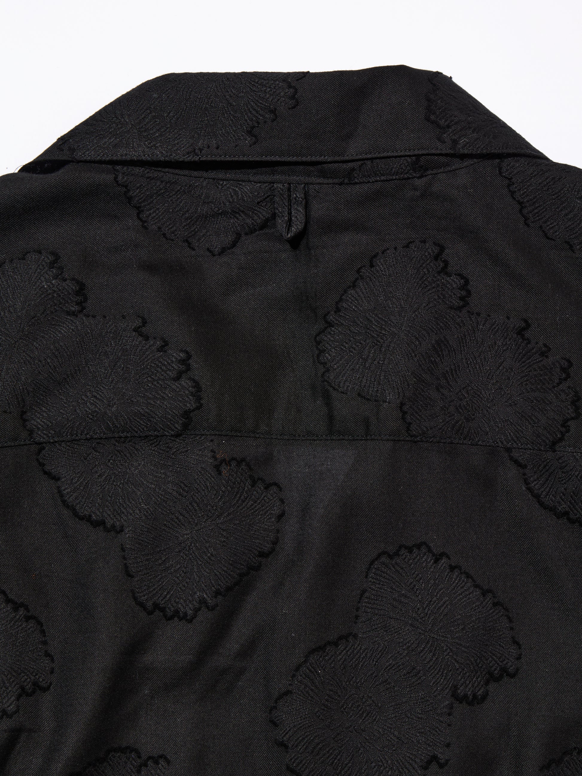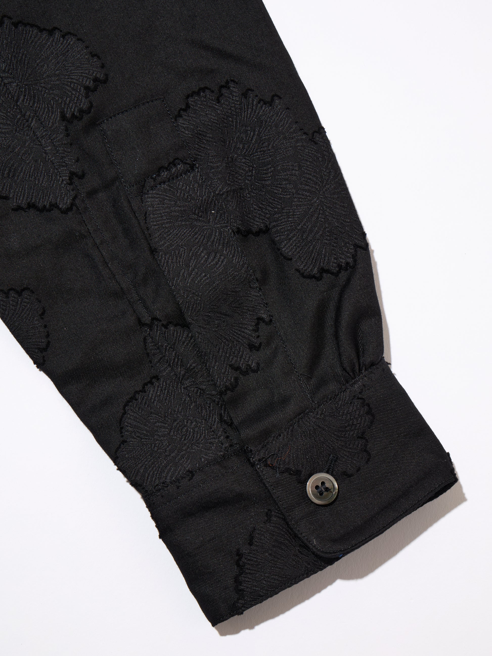 牡丹の柄を身頃全体に刺繍で表現したコットン生地 のオープンカラーシャツ。両胸にパッチポケット、左裾 にピスネームを配置。第一ボタン留めはルーパー仕様、 裾はフラットなボックス型。身幅にゆとりのあるシルエッ ト。