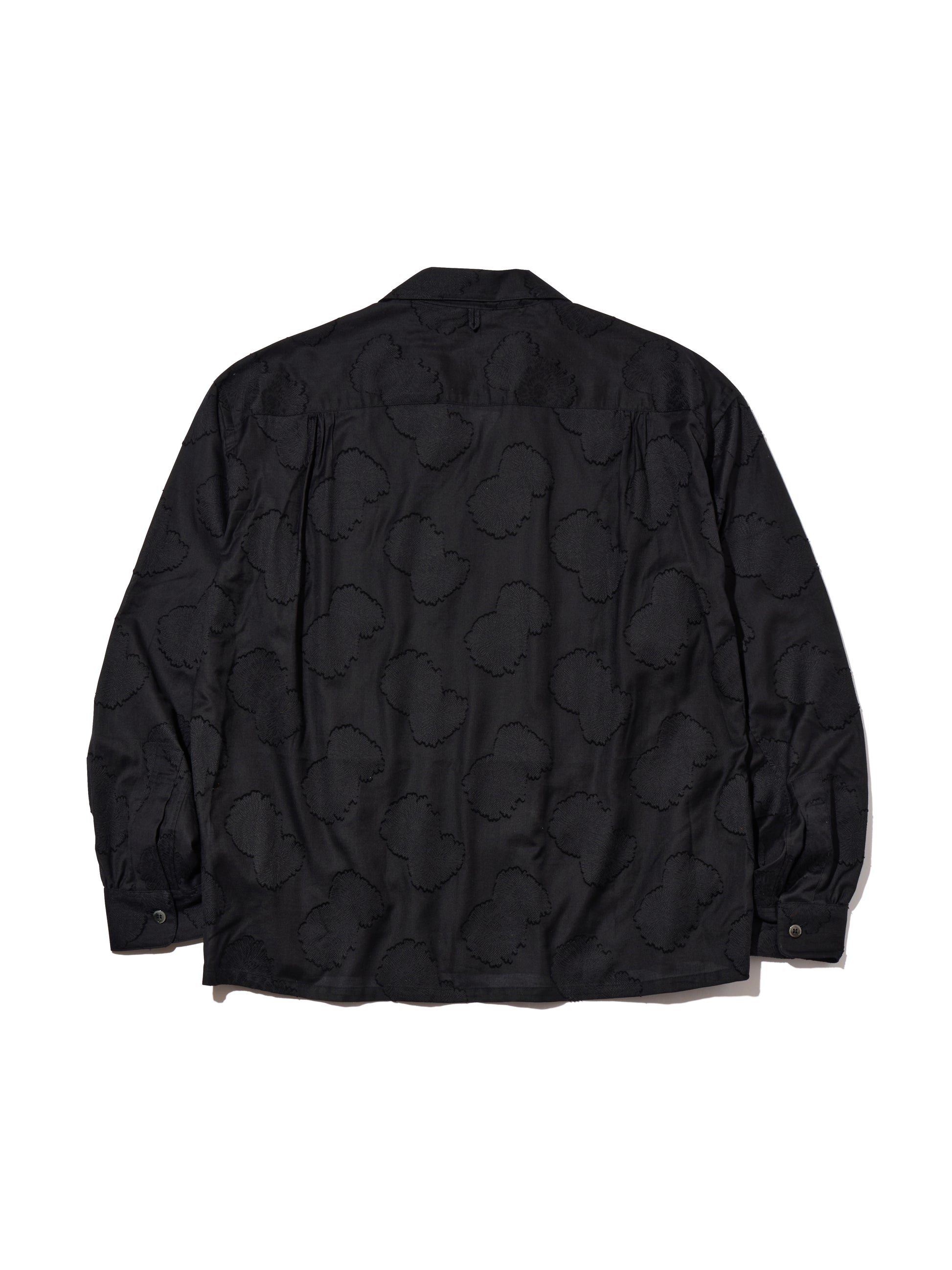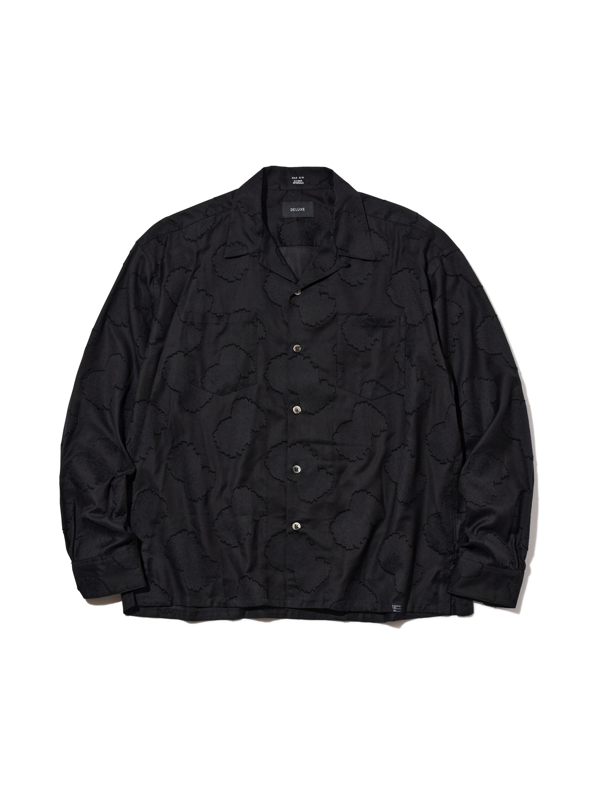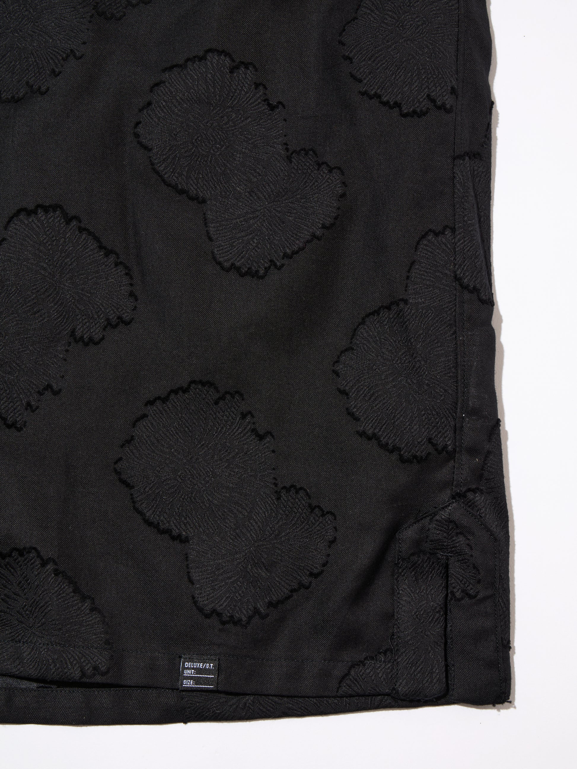 牡丹の柄を身頃全体に刺繍で表現したコットン生地 のオープンカラーシャツ。両胸にパッチポケット、左裾 にピスネームを配置。第一ボタン留めはルーパー仕様、 裾はフラットなボックス型。身幅にゆとりのあるシルエッ ト。