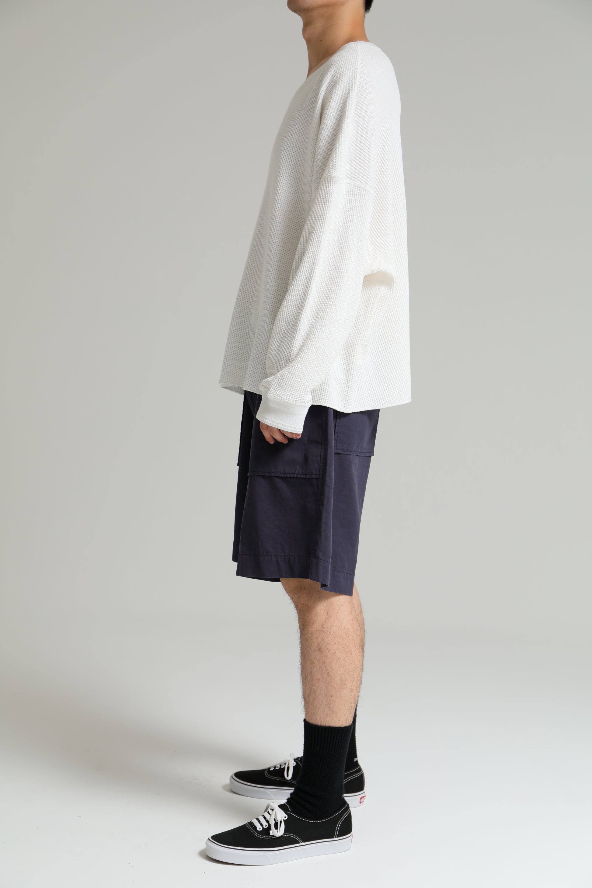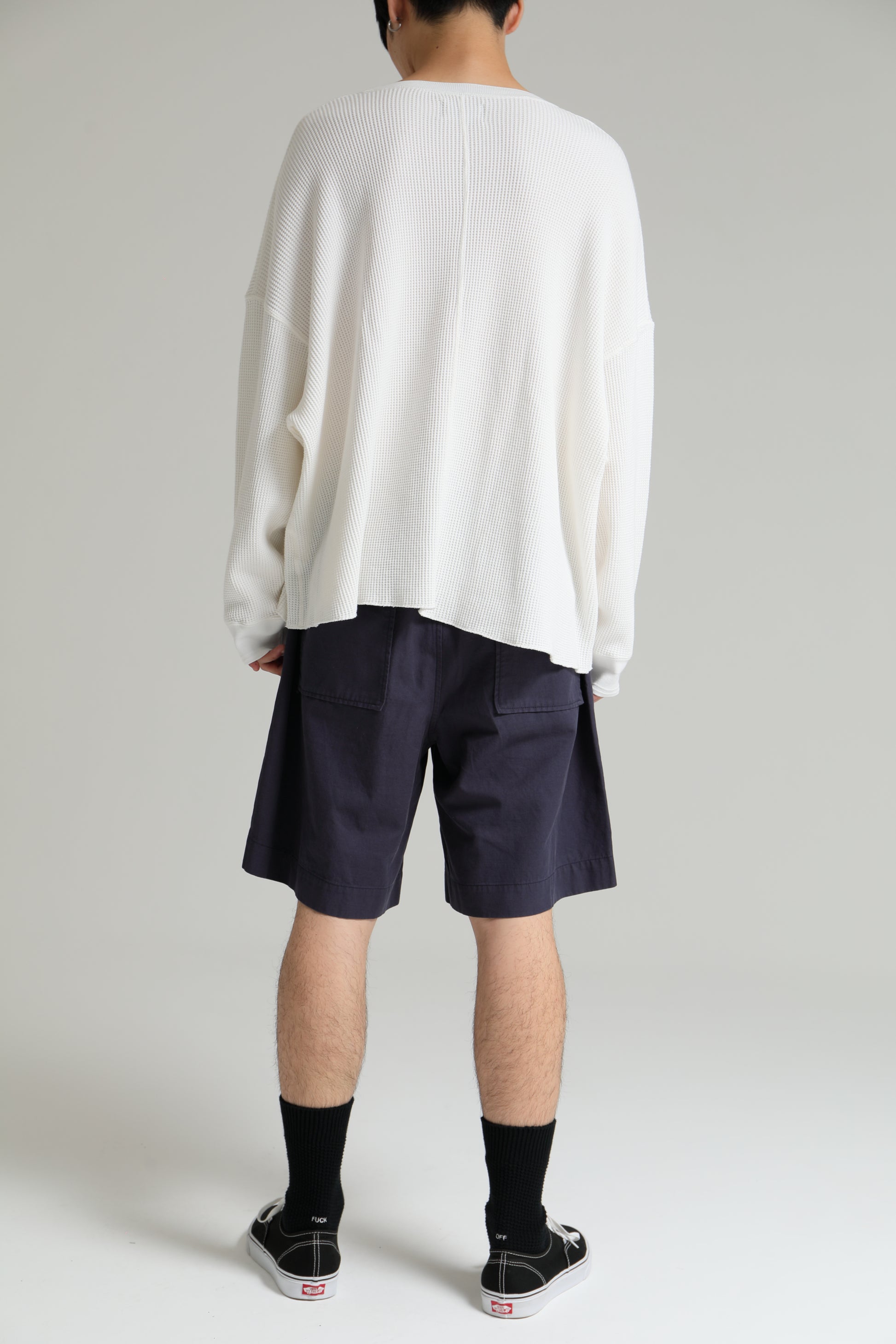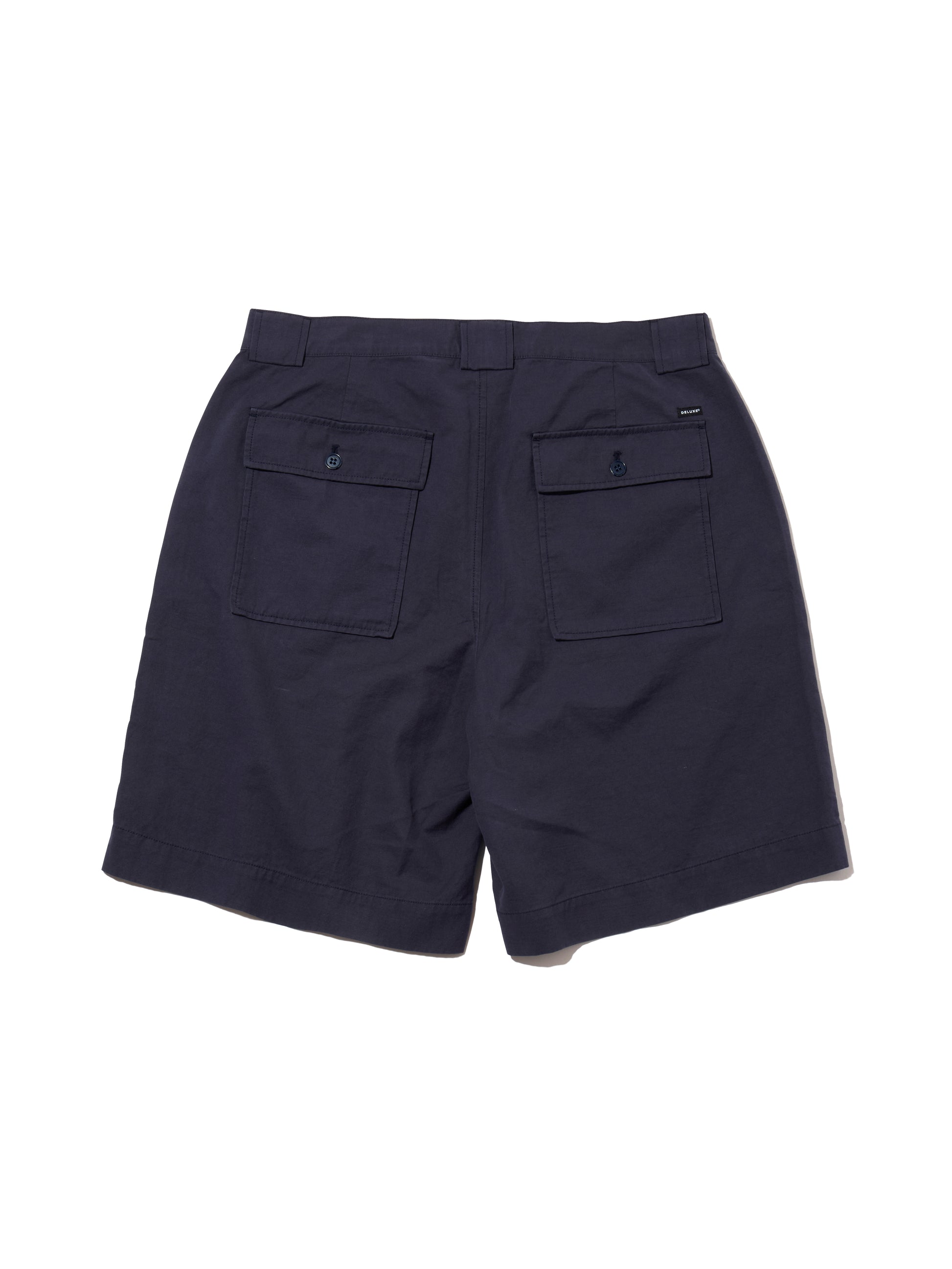 ヴィンテージライクな加工を施したコットン/リネ ンの混紡素材を使用したベイカー型ショートパンツ。両 腰に台形ポケット、背面左右にフラップポケットを配置。 背面右腰下にピスネームを叩きつけ。ウエストに配置したベルトループは幅が広めの仕様。ウエスト・レッグに ゆとりのあるストレートシルエット。