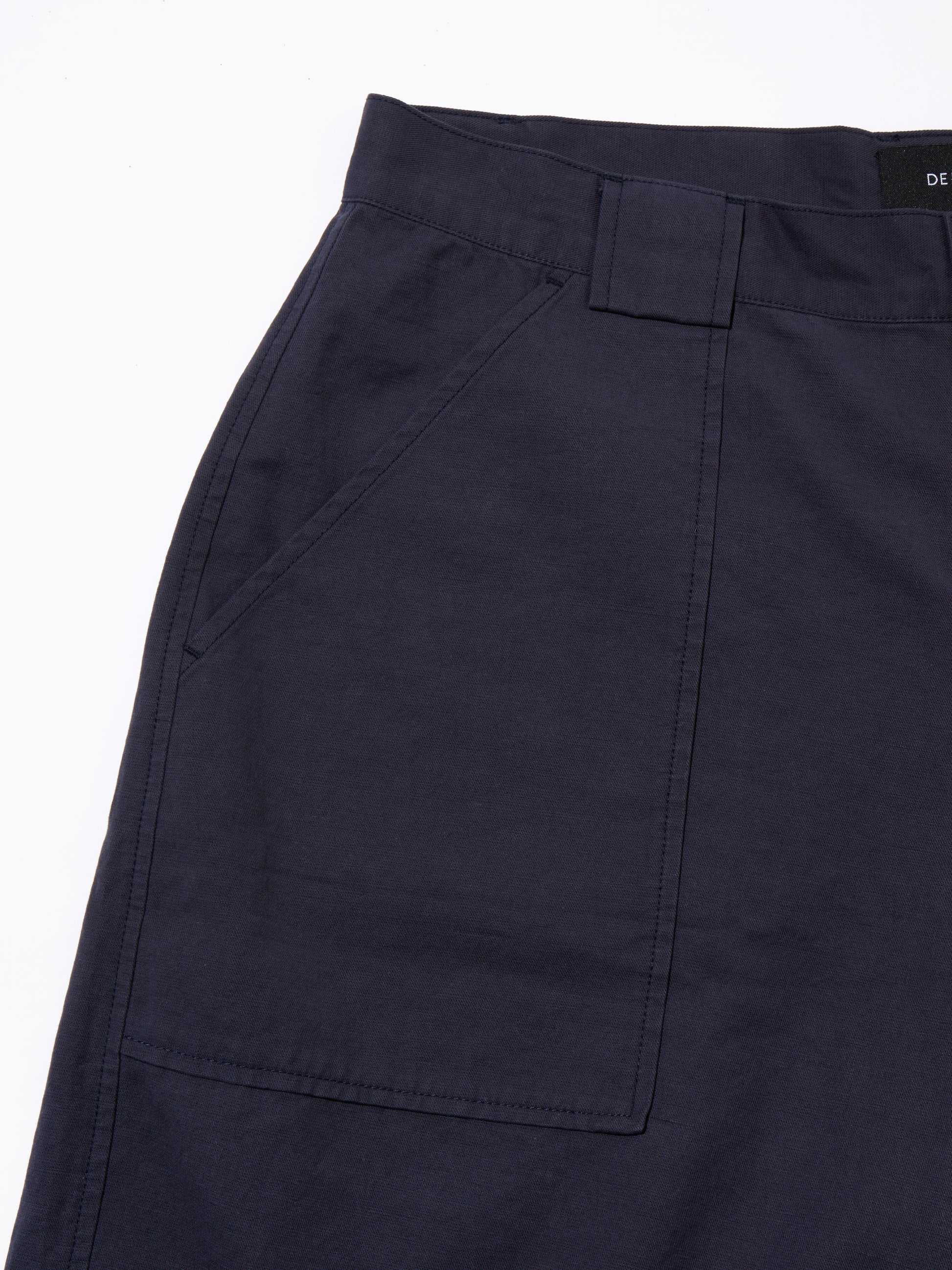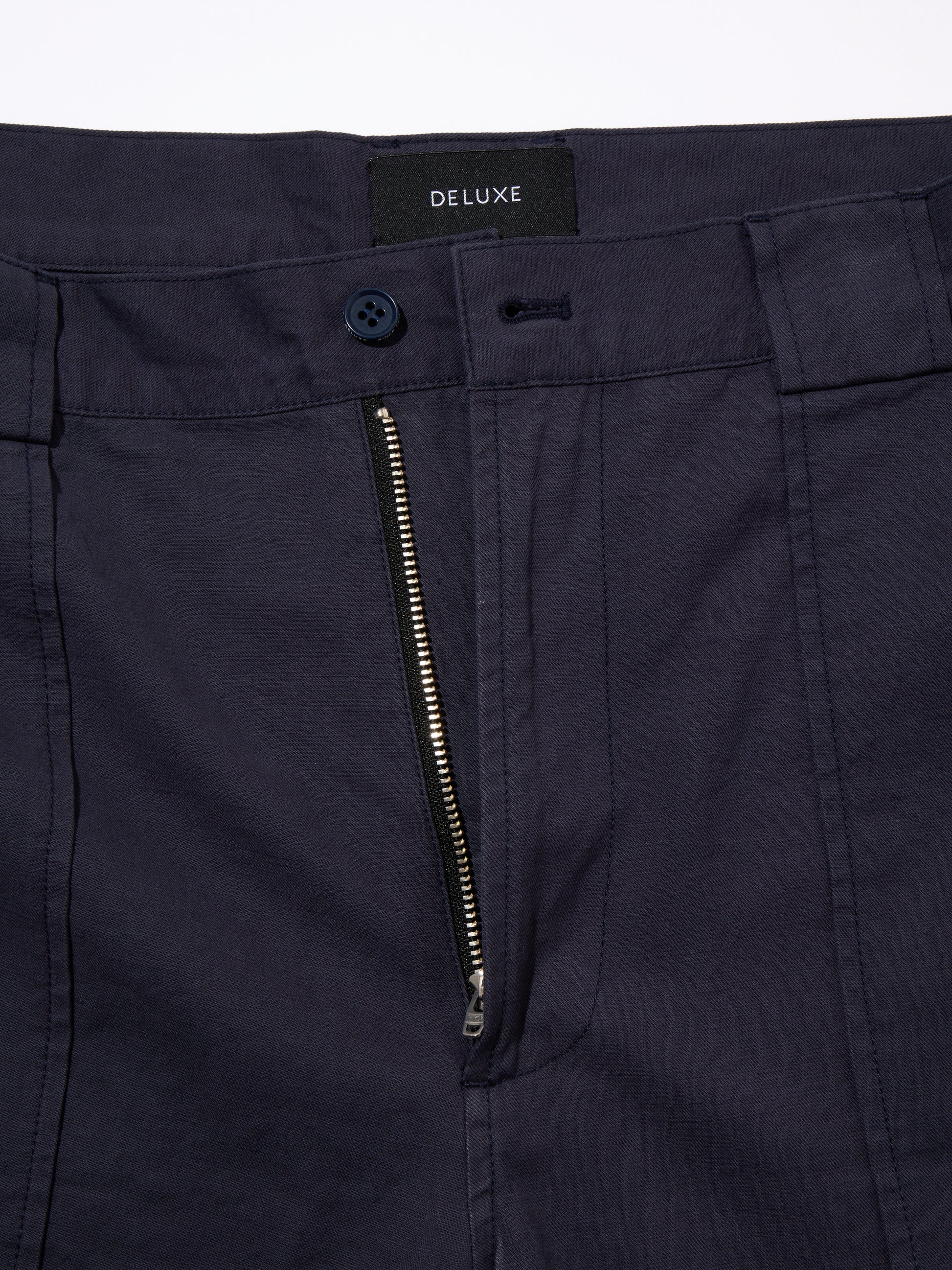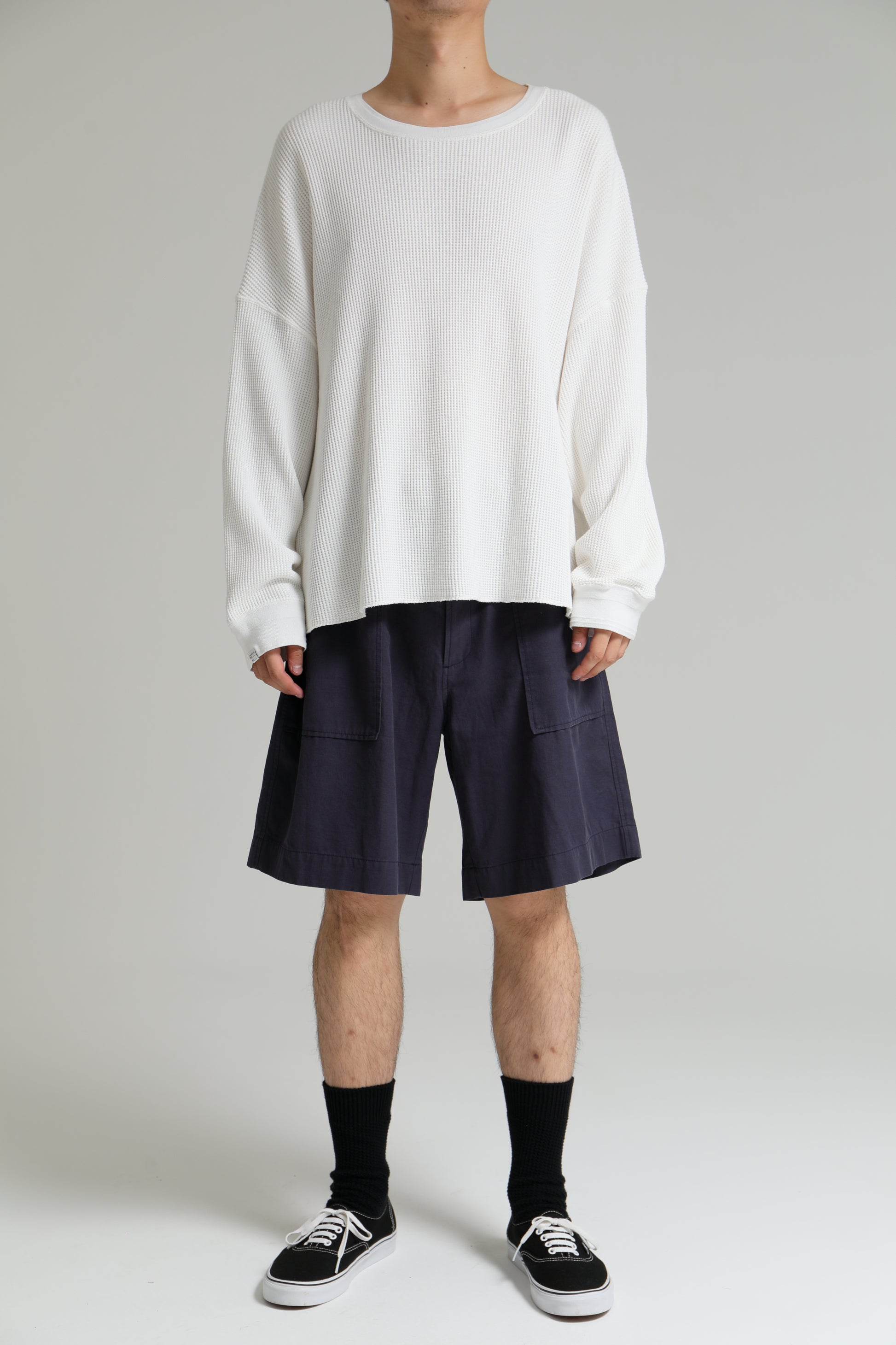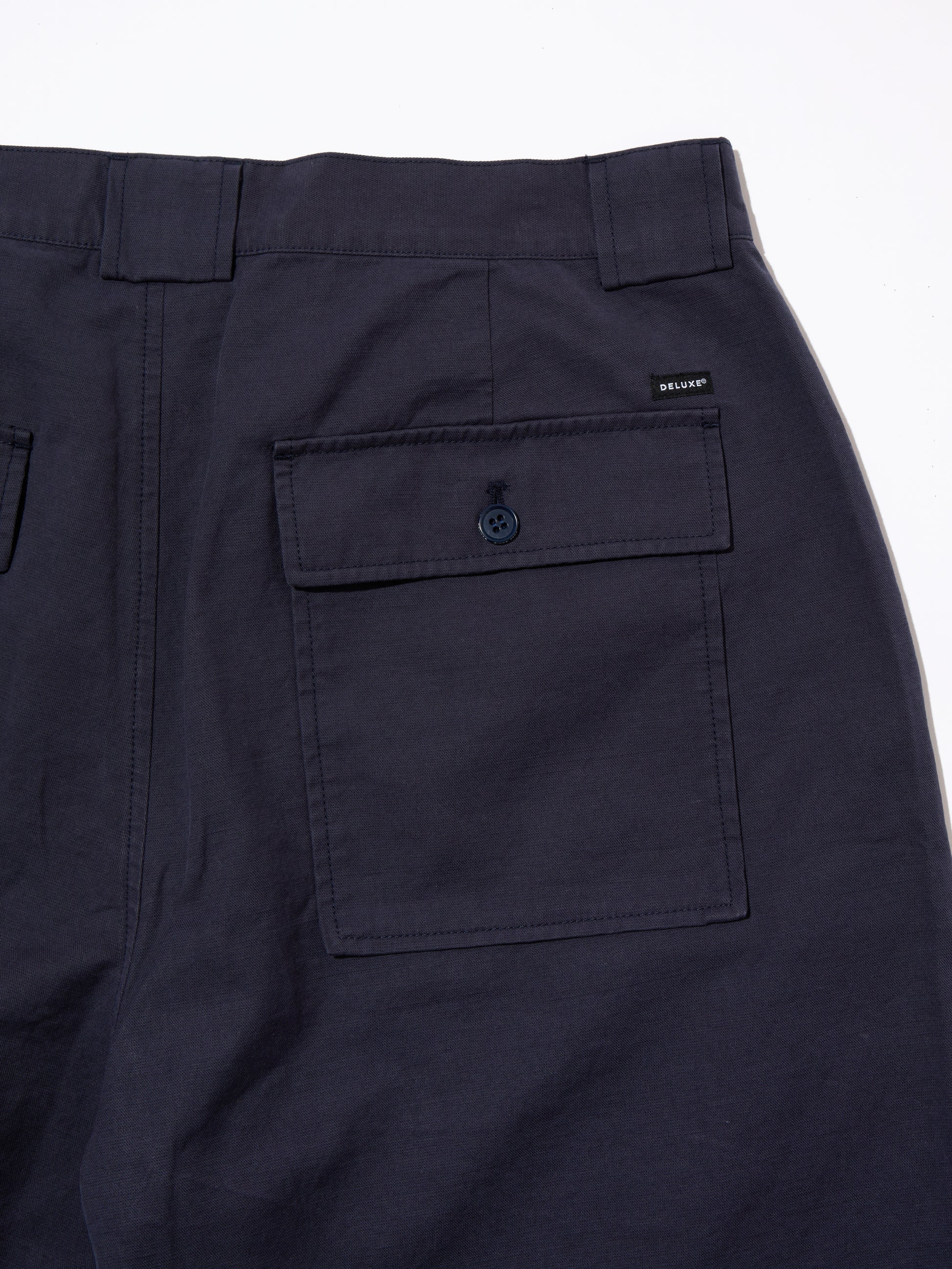 ヴィンテージライクな加工を施したコットン/リネ ンの混紡素材を使用したベイカー型ショートパンツ。両 腰に台形ポケット、背面左右にフラップポケットを配置。 背面右腰下にピスネームを叩きつけ。ウエストに配置したベルトループは幅が広めの仕様。ウエスト・レッグに ゆとりのあるストレートシルエット。