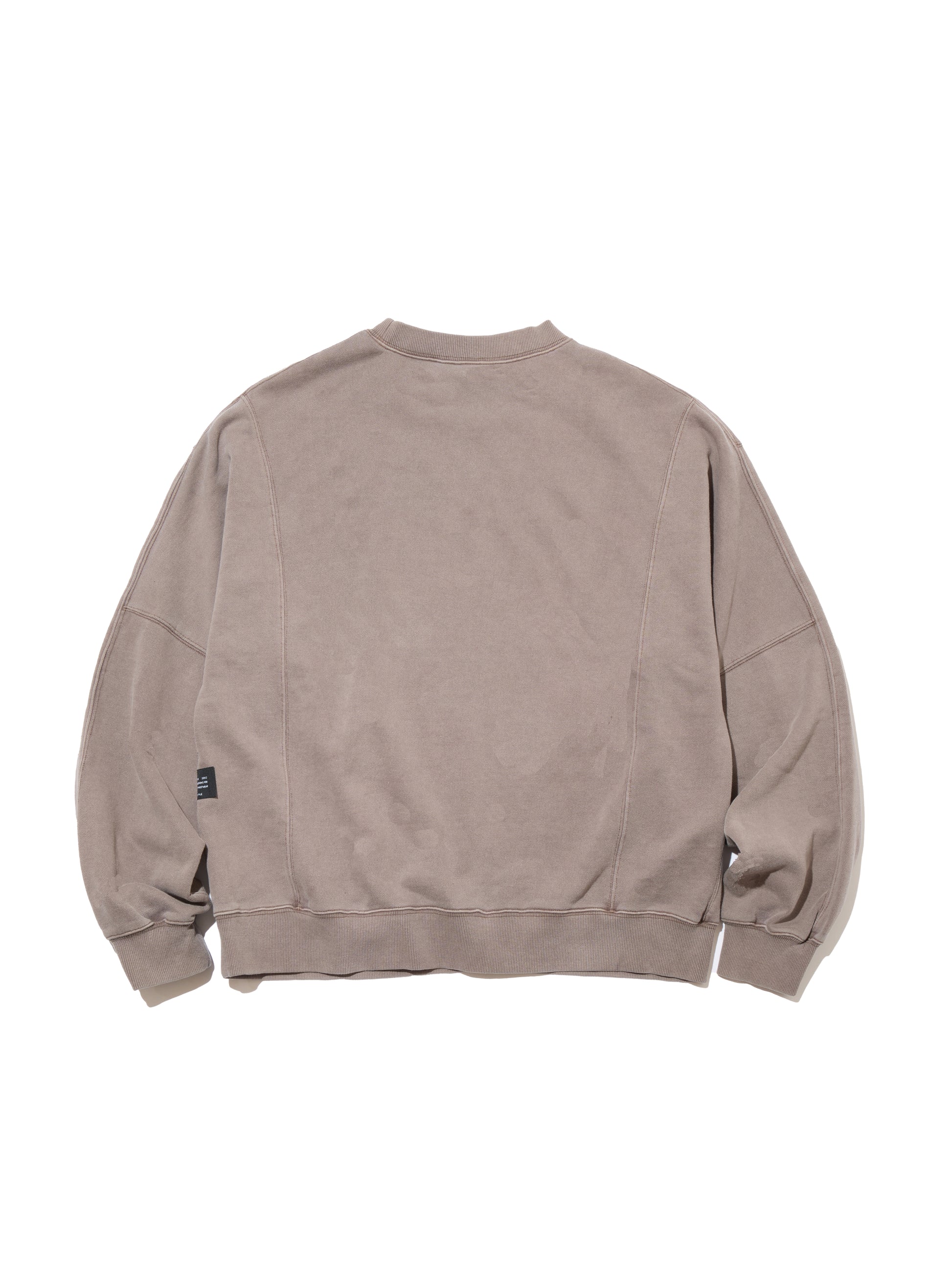 オリジナルで作成したコットン裏毛素材を使用したクルーネックスウェットシャツ。身頃全体にピグメント加工を施し、ヴィンテージな風合いに仕上げた。左袖のダメージ痕下にブランドロゴ、前身頃右下にコピーライトロゴをラバープリントで配置。身頃の左脇にスクウェア型ネームを叩きつけ。身幅にゆとりのあるシルエット。3色4サイズ展開。