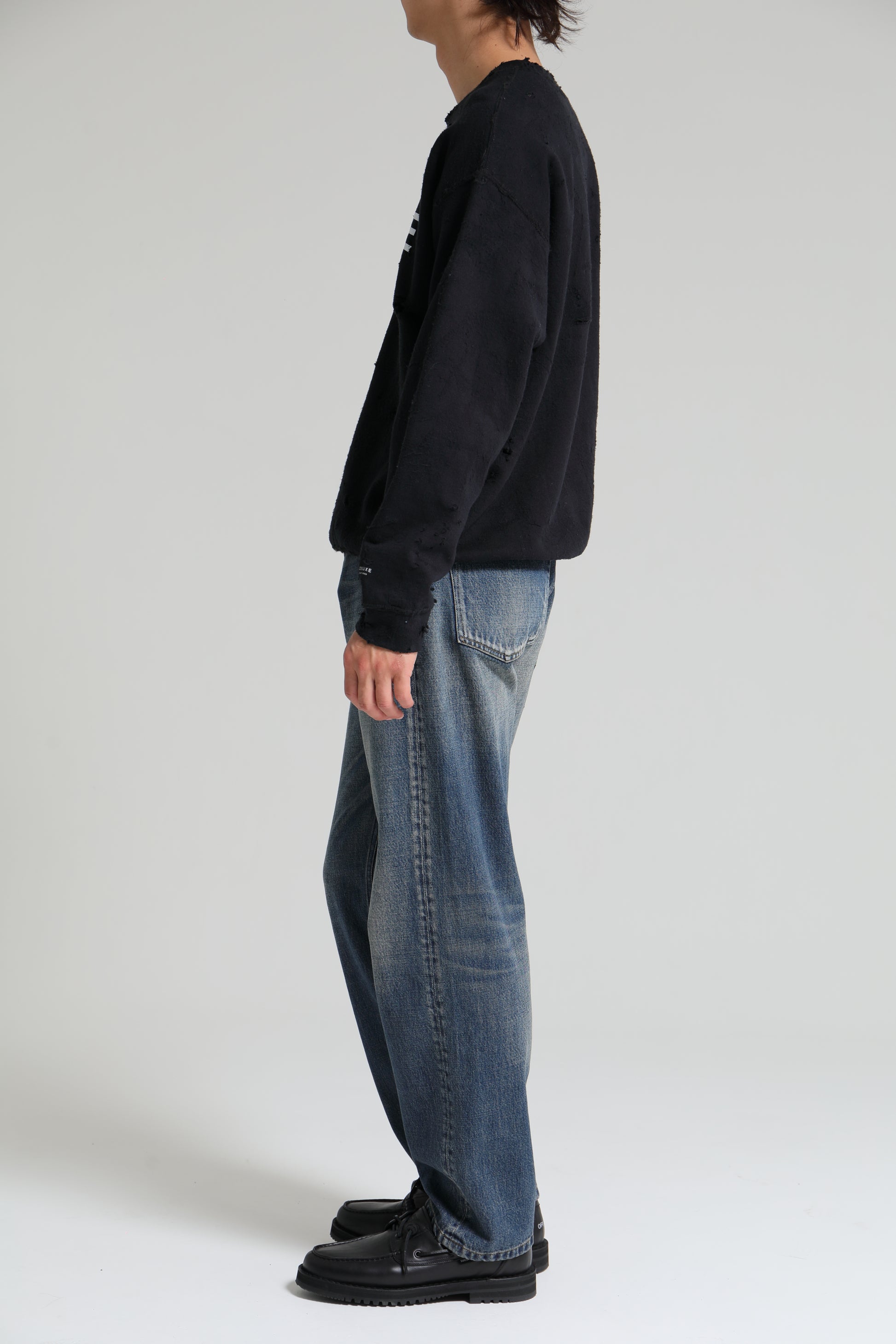 ドライタッチなコットン/ポリエステルの混紡裏毛 素材を使用したクルーネックスウェットシャツ。身頃の至 る箇所へハードなダメージ・クラッシュ加工を施した仕様 。胸元に DELUXE ロゴ、フロント右下にコピーライトの レターグラフィック、左袖にブランドロゴをラバープリン トで表現したデザイン。身幅にゆとりのあるシルエット。