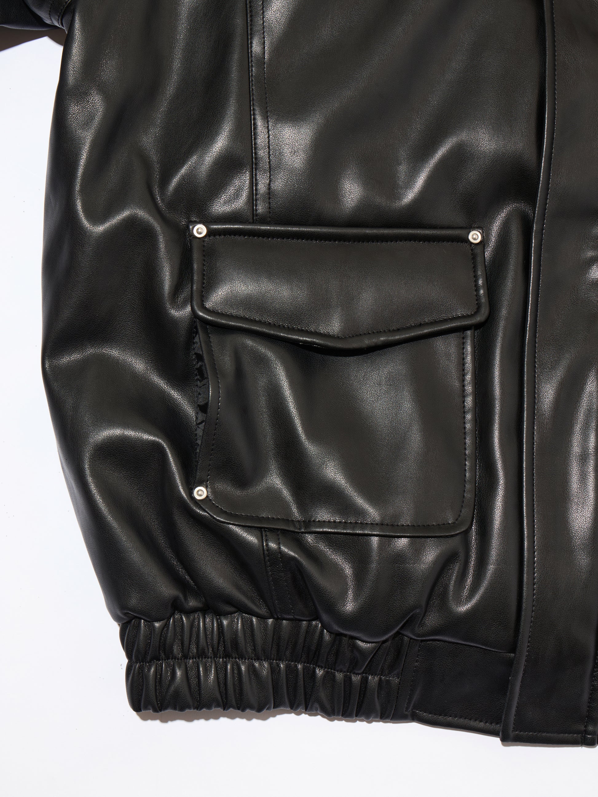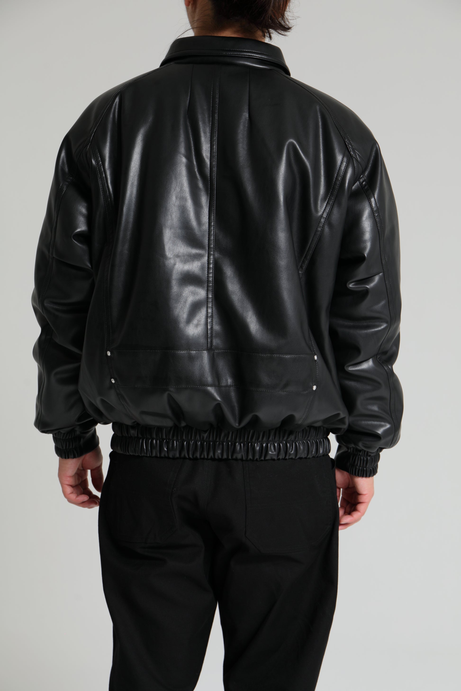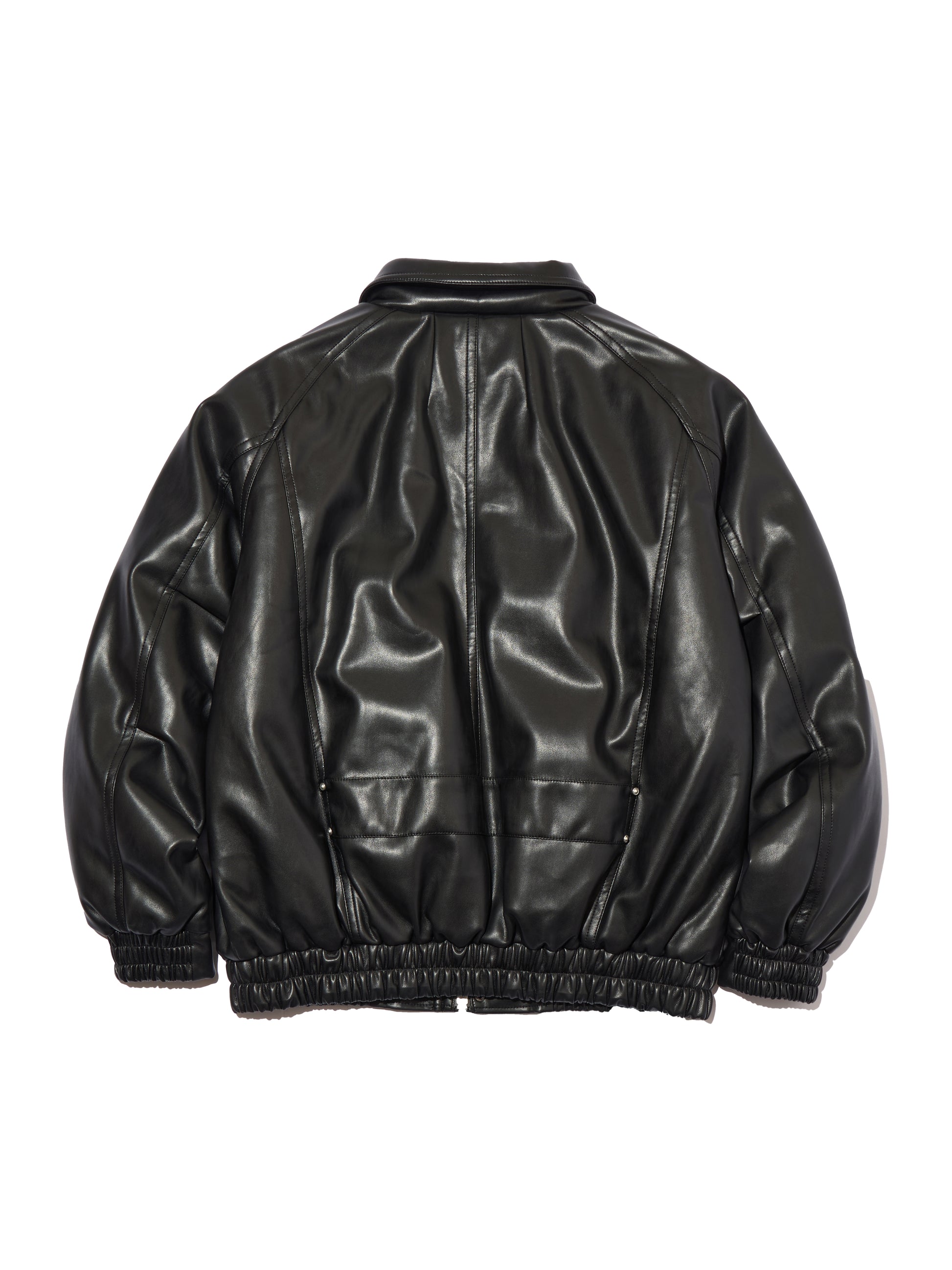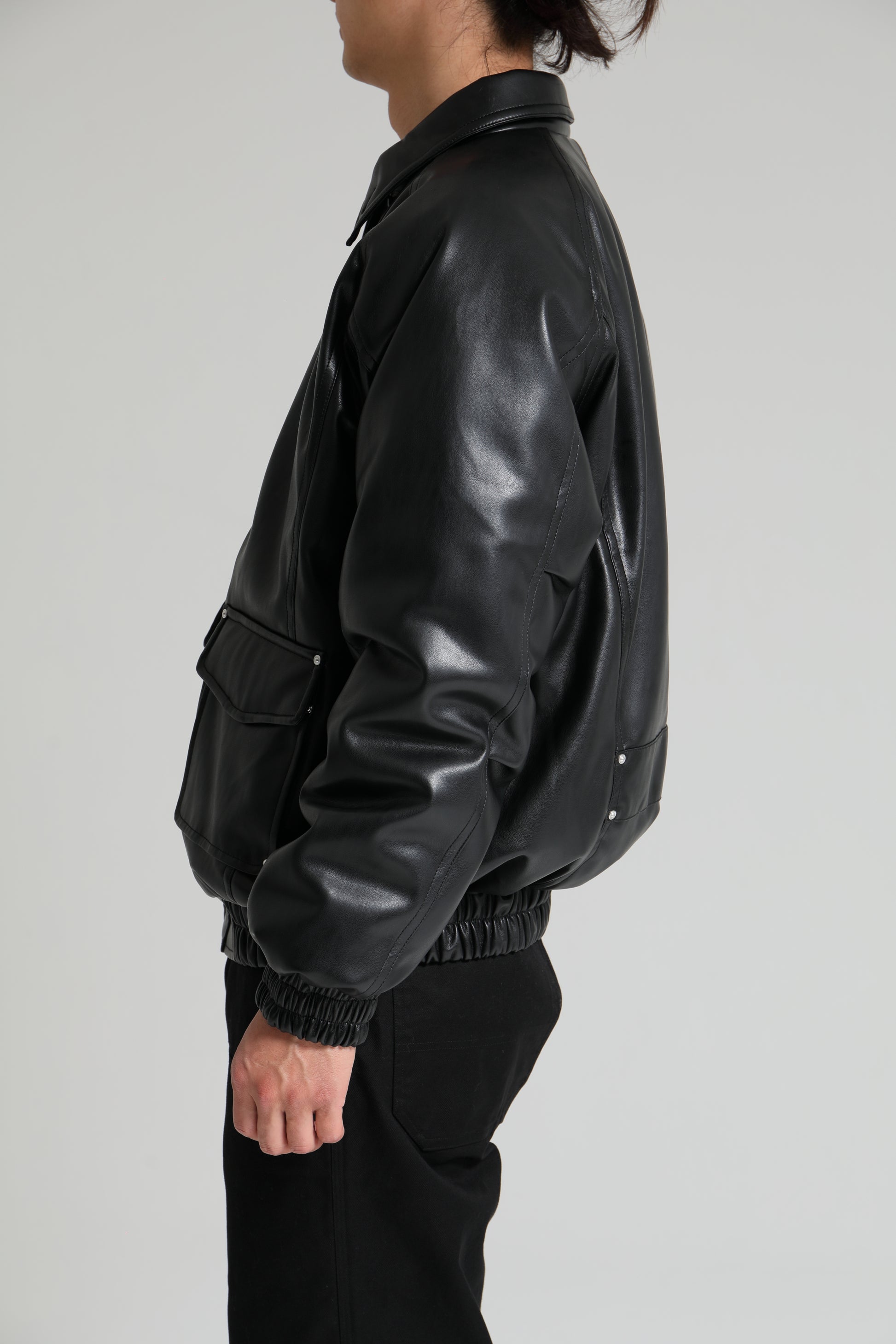 表地はヴィーガンレザー、裏地は中綿入りのキュプラライニングで仕立てたA-2型ブルゾン。袖・裾はニットリブではなく敢えてゴムリブ仕様、フロント両腰のフラップポケットも配置を裾上にするなど、現代的な感覚でのモディファイが施されている。台襟左側にボタン、右側にボタンホールが付属、スタンドカラーに変形して着用が可能。身幅、アームホールにゆとりのあるシルエット。