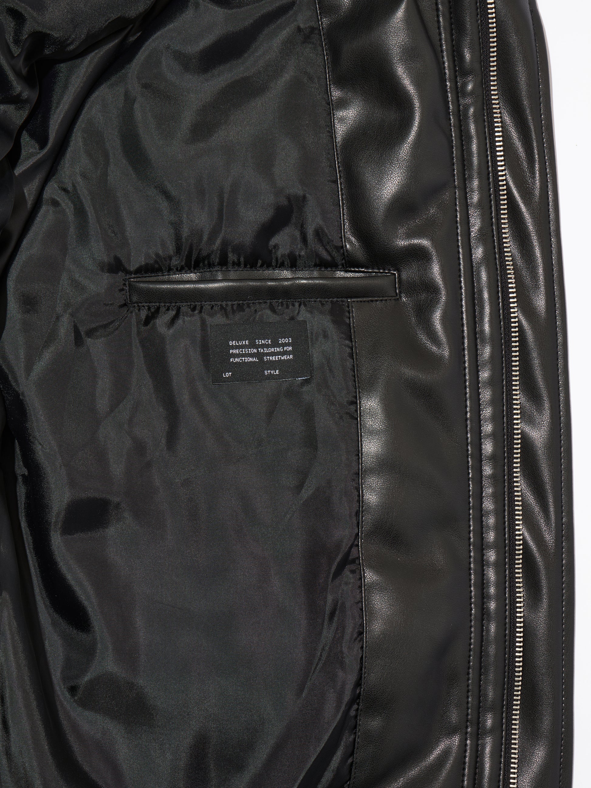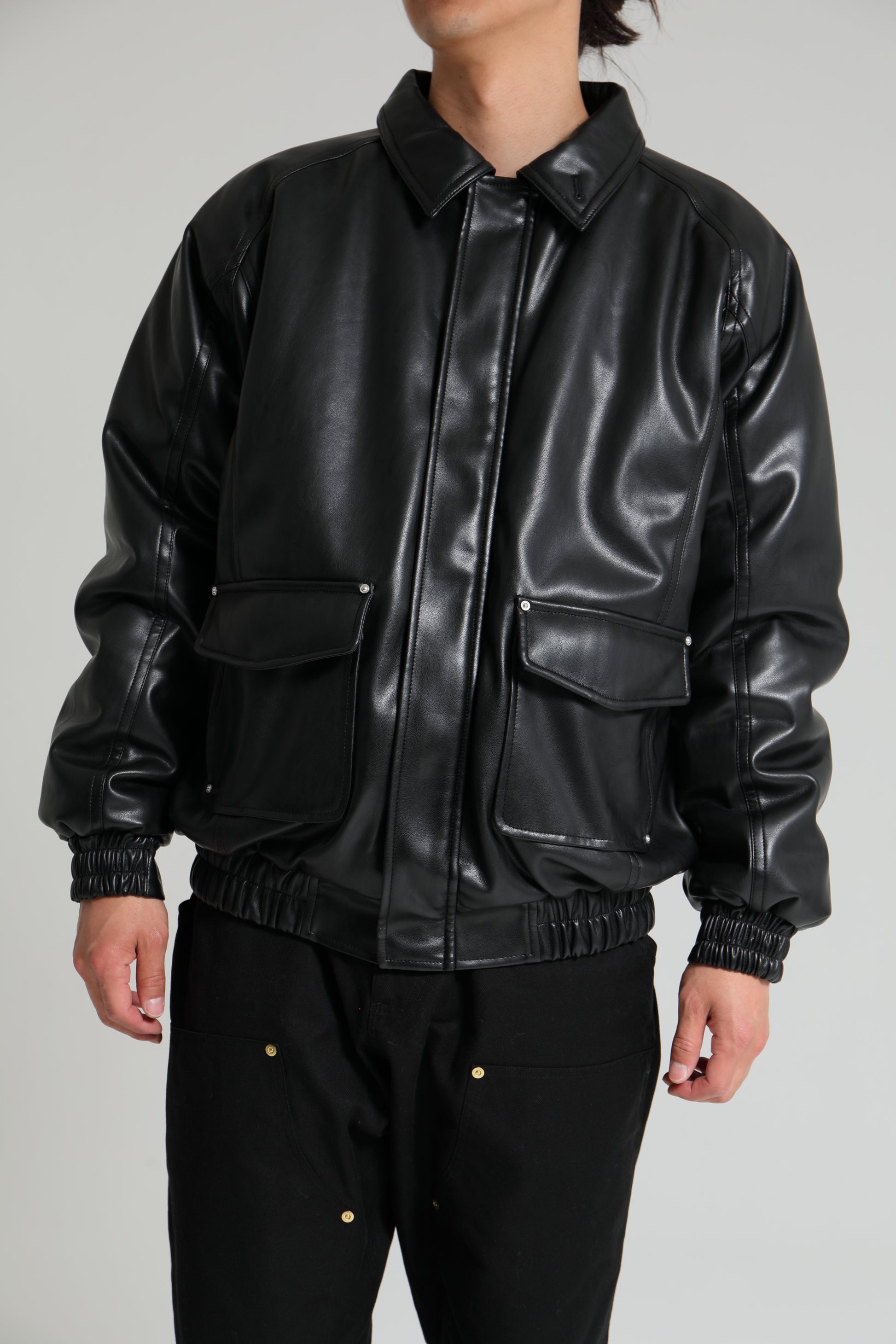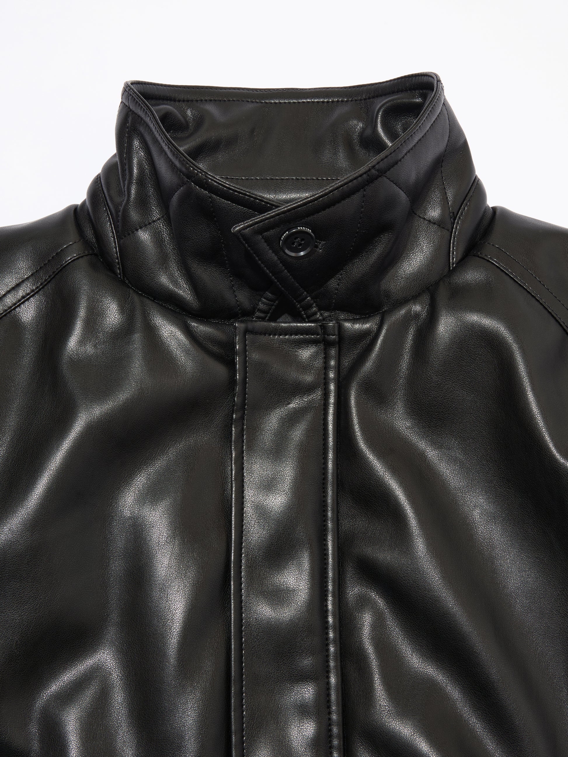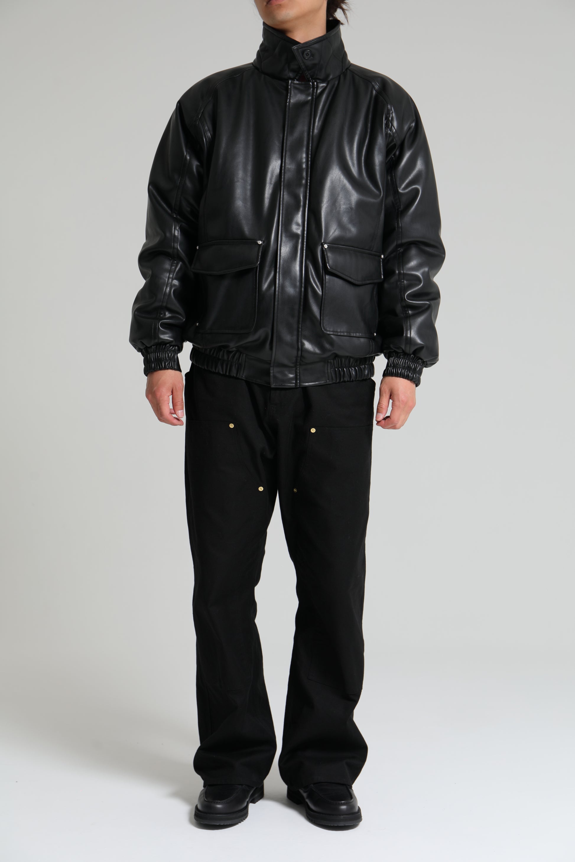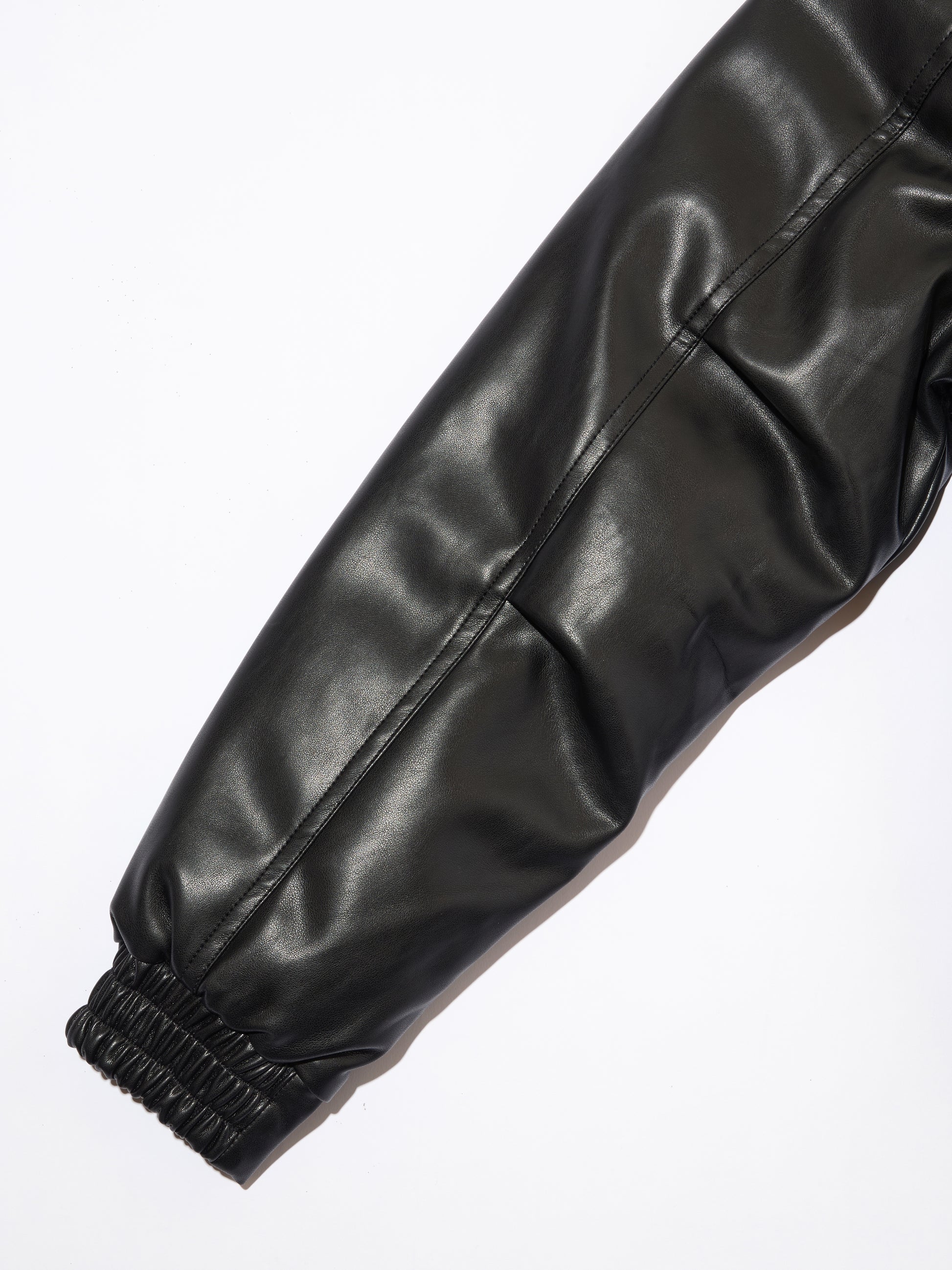 表地はヴィーガンレザー、裏地は中綿入りのキュプラライニングで仕立てたA-2型ブルゾン。袖・裾はニットリブではなく敢えてゴムリブ仕様、フロント両腰のフラップポケットも配置を裾上にするなど、現代的な感覚でのモディファイが施されている。台襟左側にボタン、右側にボタンホールが付属、スタンドカラーに変形して着用が可能。身幅、アームホールにゆとりのあるシルエット。