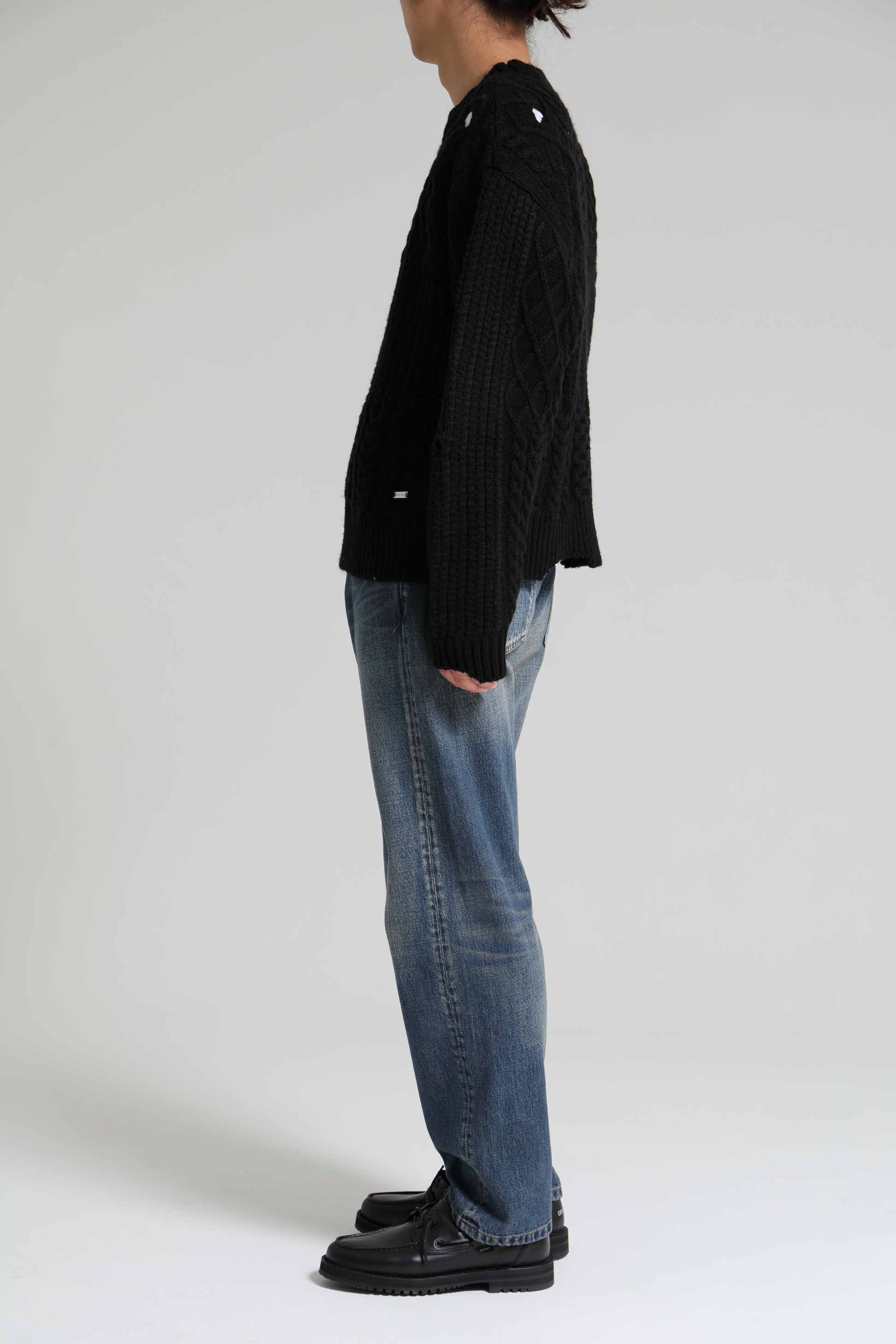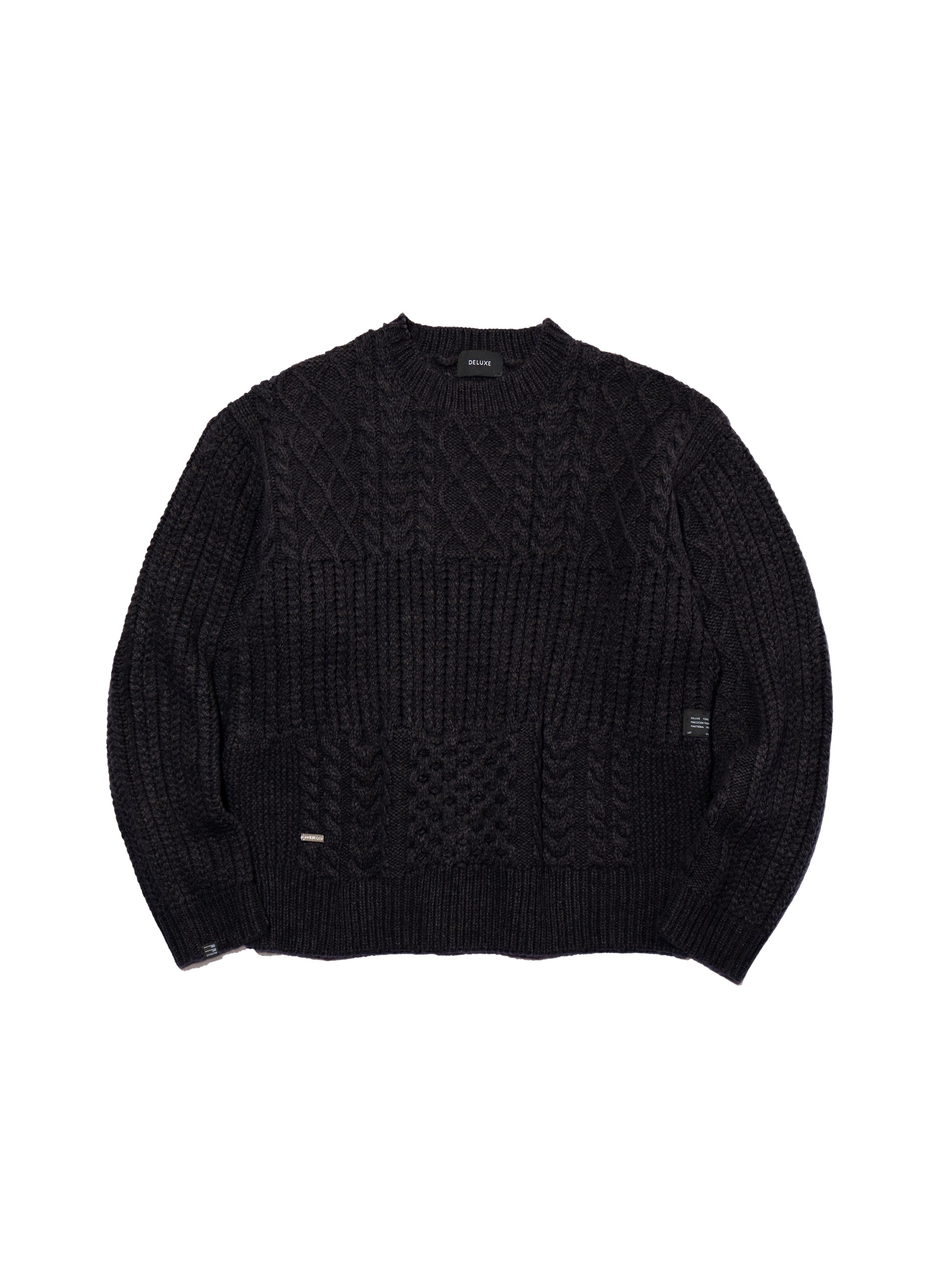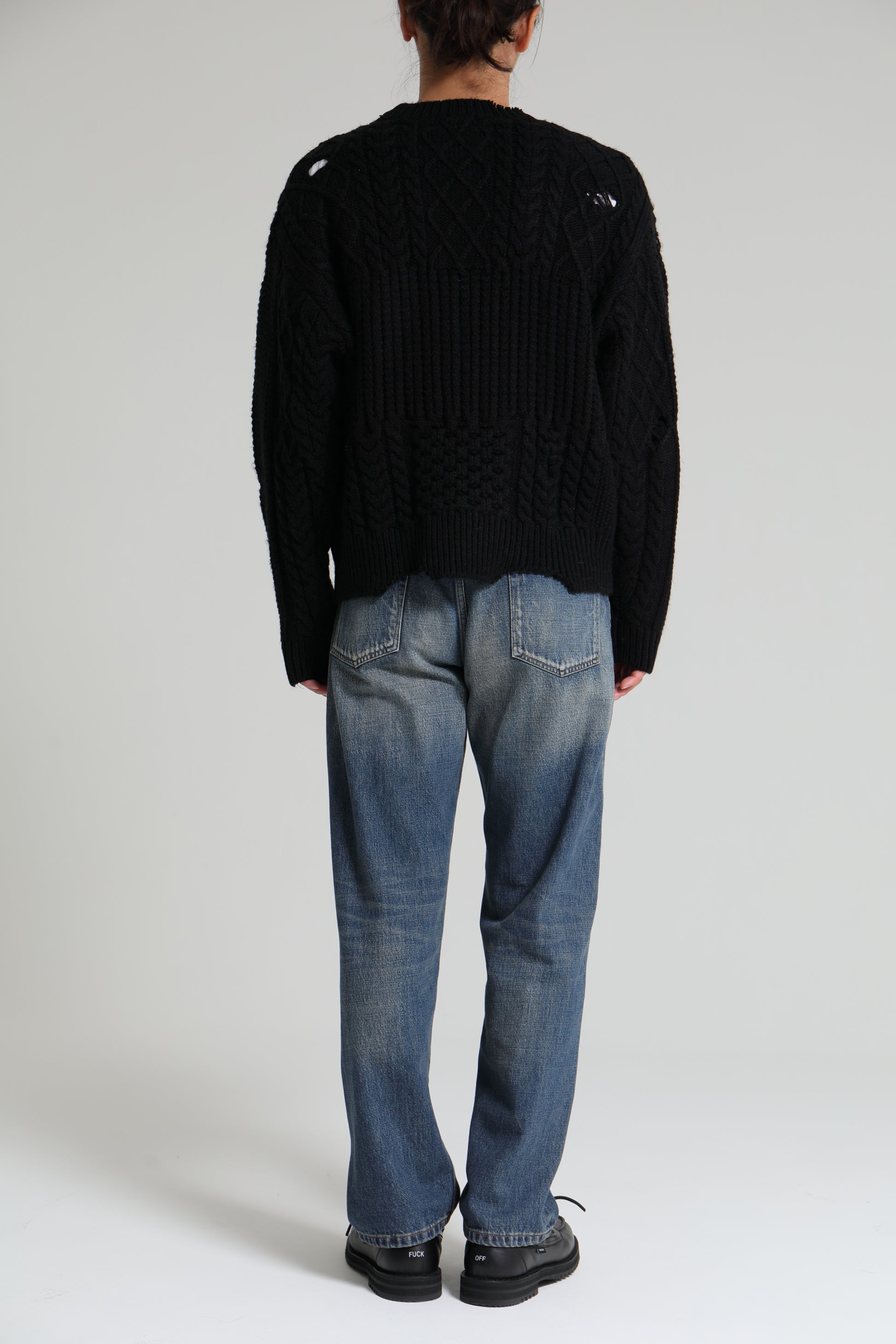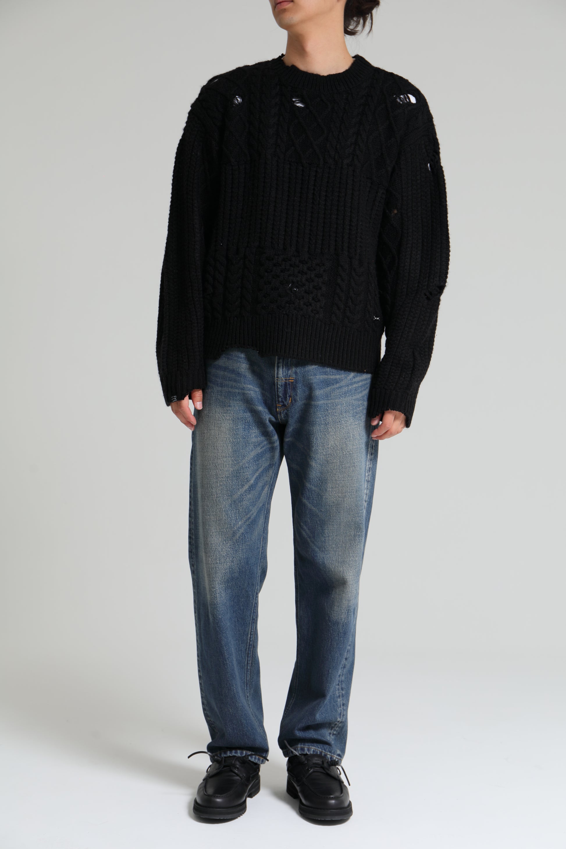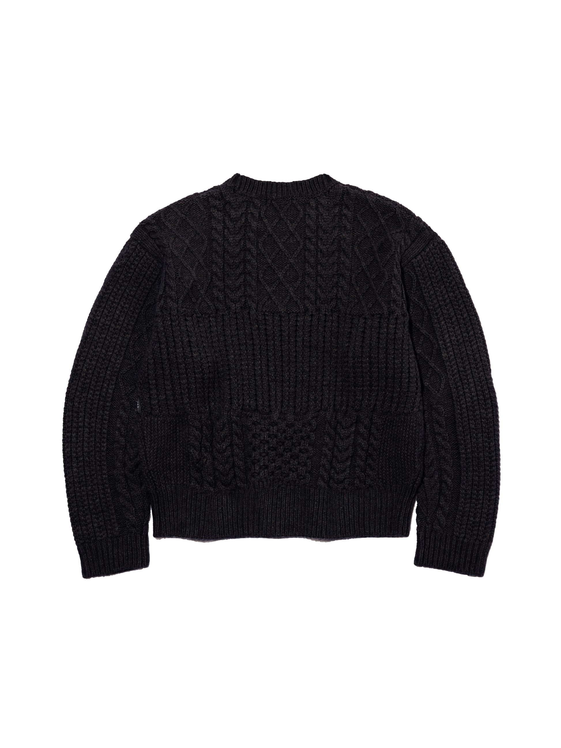 アクリル/ウール/ナイロンの3種混紡生地を使用したクルーネックニット。様々な編み地のパターンをパネル風に組み合わせることで同色糸ながらクレイジーパターンで仕上げた1着。左袖にスクウェア型ネームを叩きつけ。身幅にゆとりのあるシルエット。