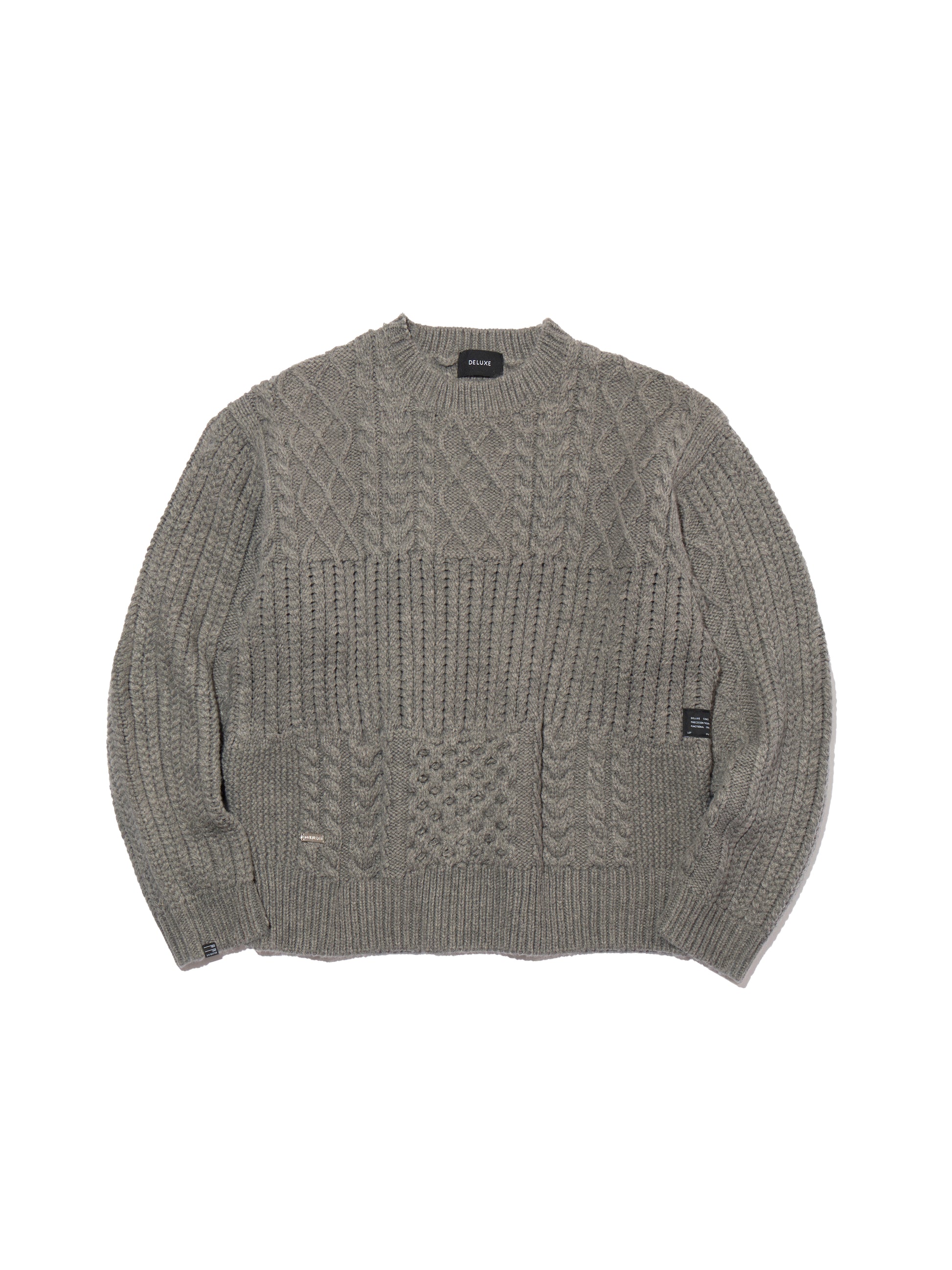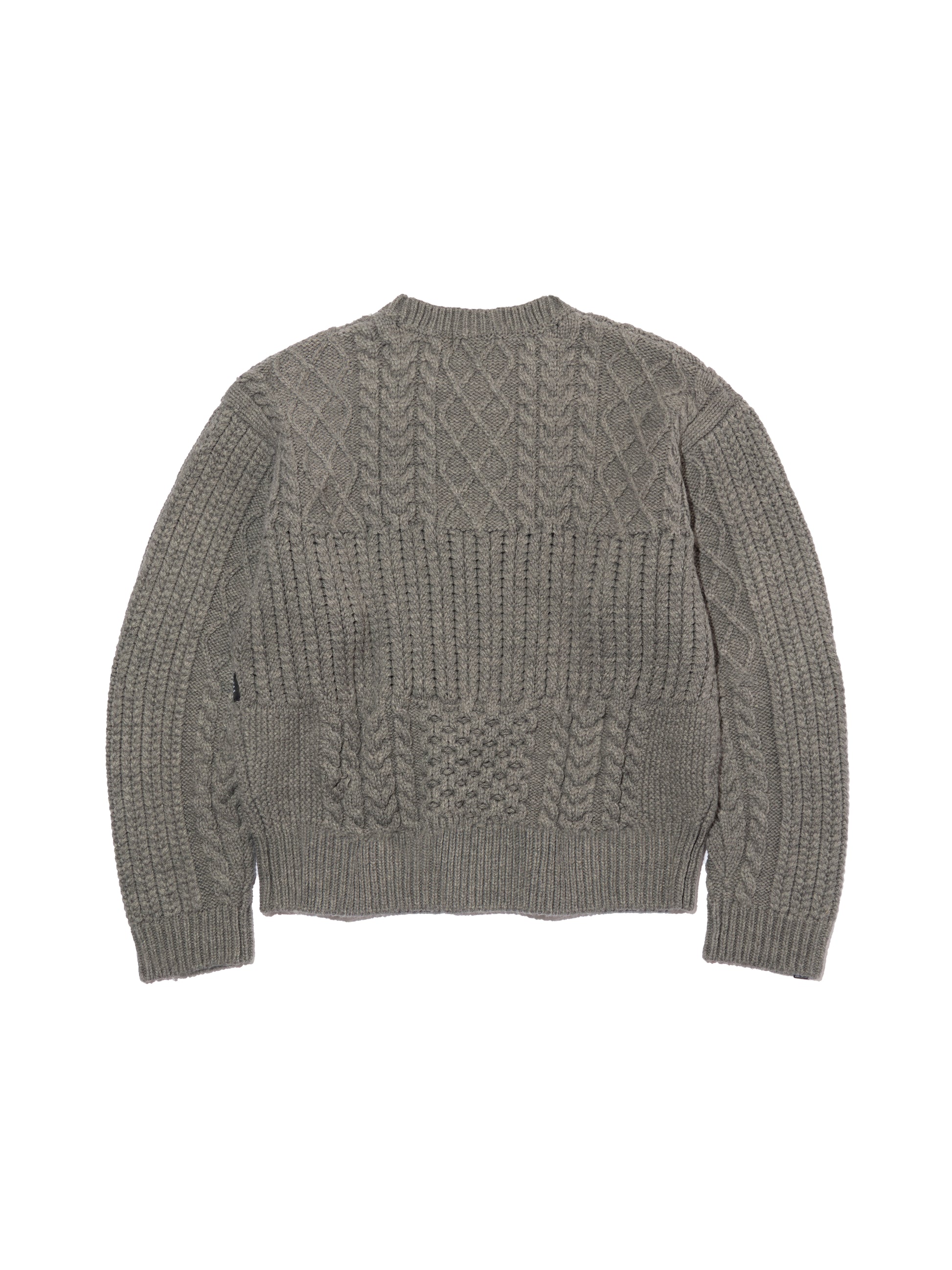 アクリル/ウール/ナイロンの3種混紡生地を使用したクルーネックニット。様々な編み地のパターンをパネル風に組み合わせることで同色糸ながらクレイジーパターンで仕上げた1着。左袖にスクウェア型ネームを叩きつけ。身幅にゆとりのあるシルエット。